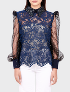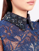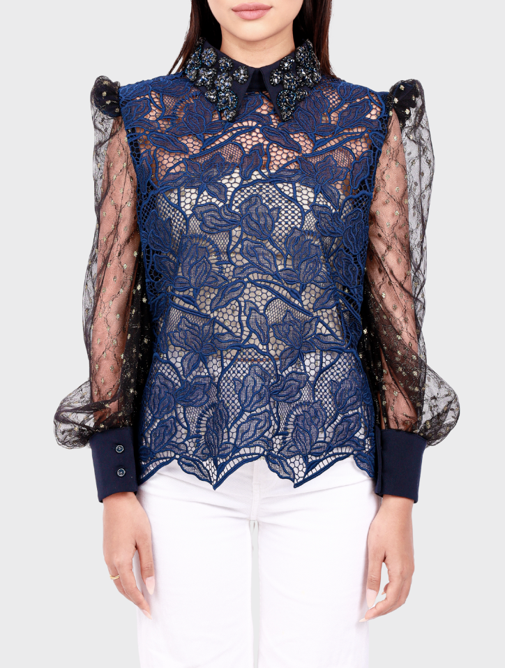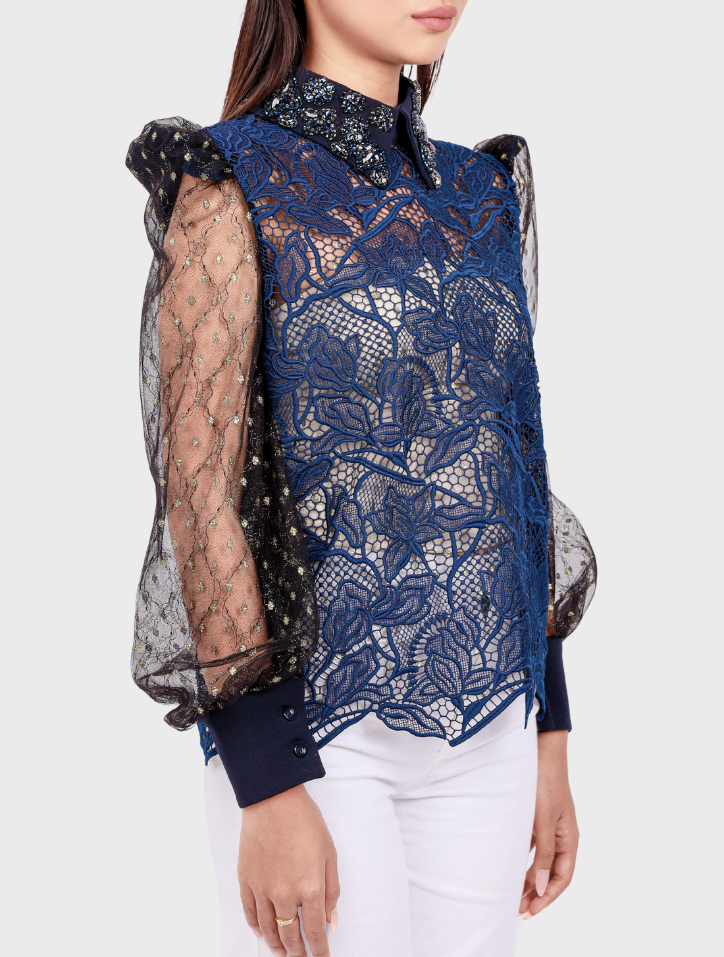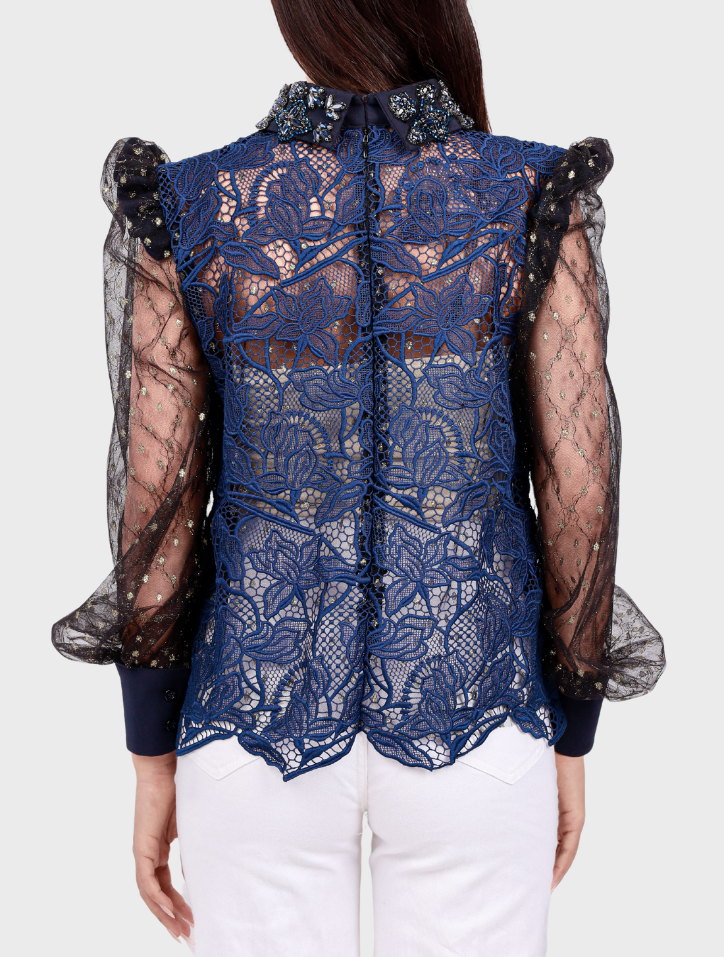 Elevate your wardrobe with our stunning Self-Portrait Guipure-Lace Blouse. Crafted from high-quality cotton guipure and featuring an embellished collar, this exclusive design boasts a hidden zip and hook fastening at the back. Enjoy the elegant comfort fit cutting and the luxurious touch of puff mesh glitter net sleeves with cuffs. The alluring blue black color and mesh glitter net lining make this piece a standout in our collection.