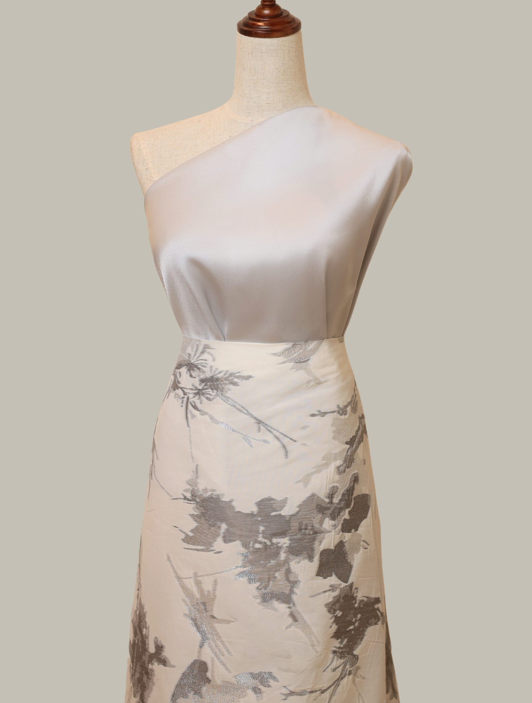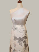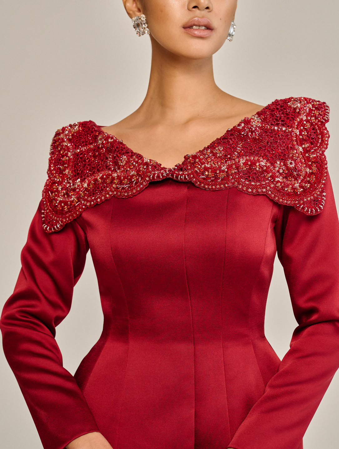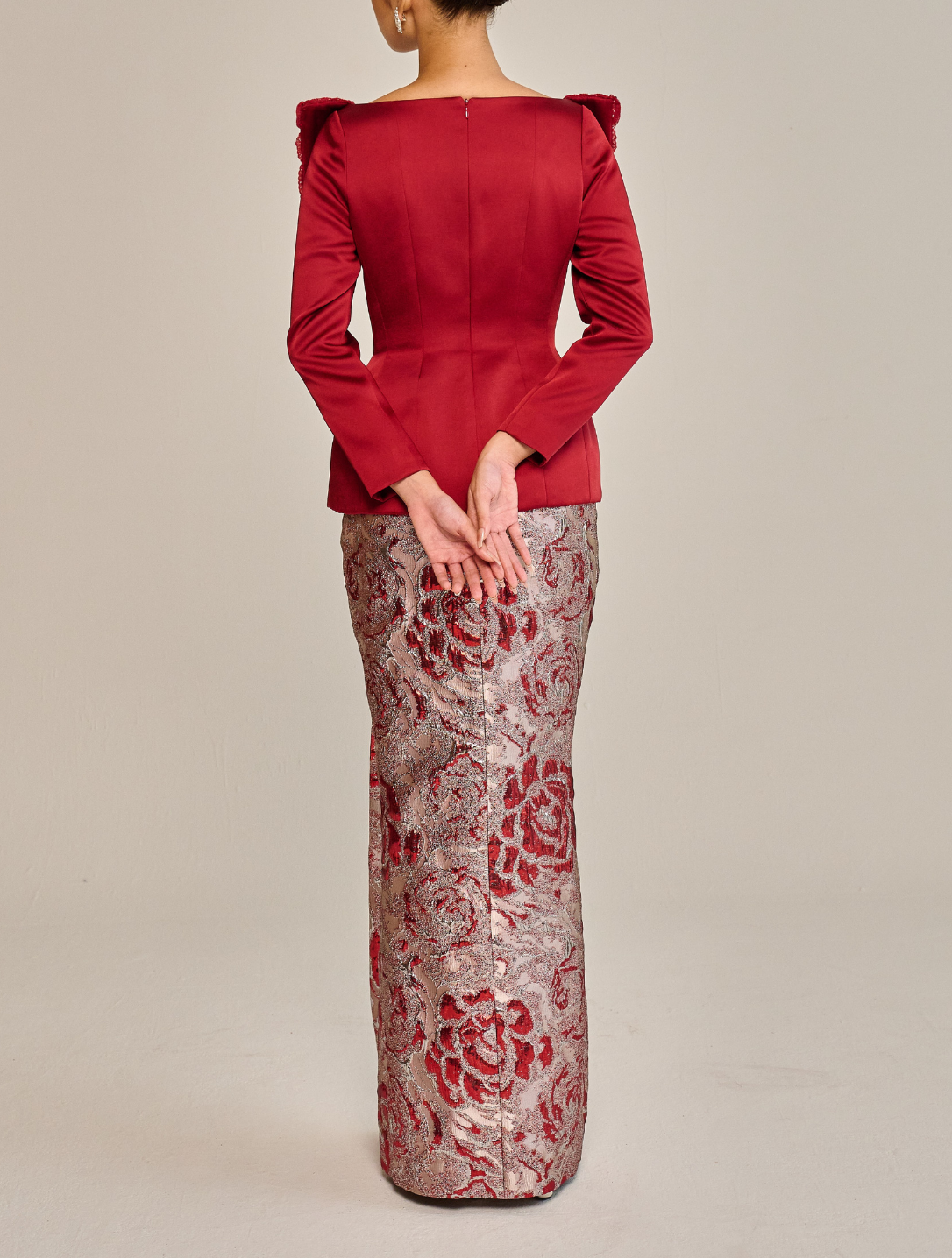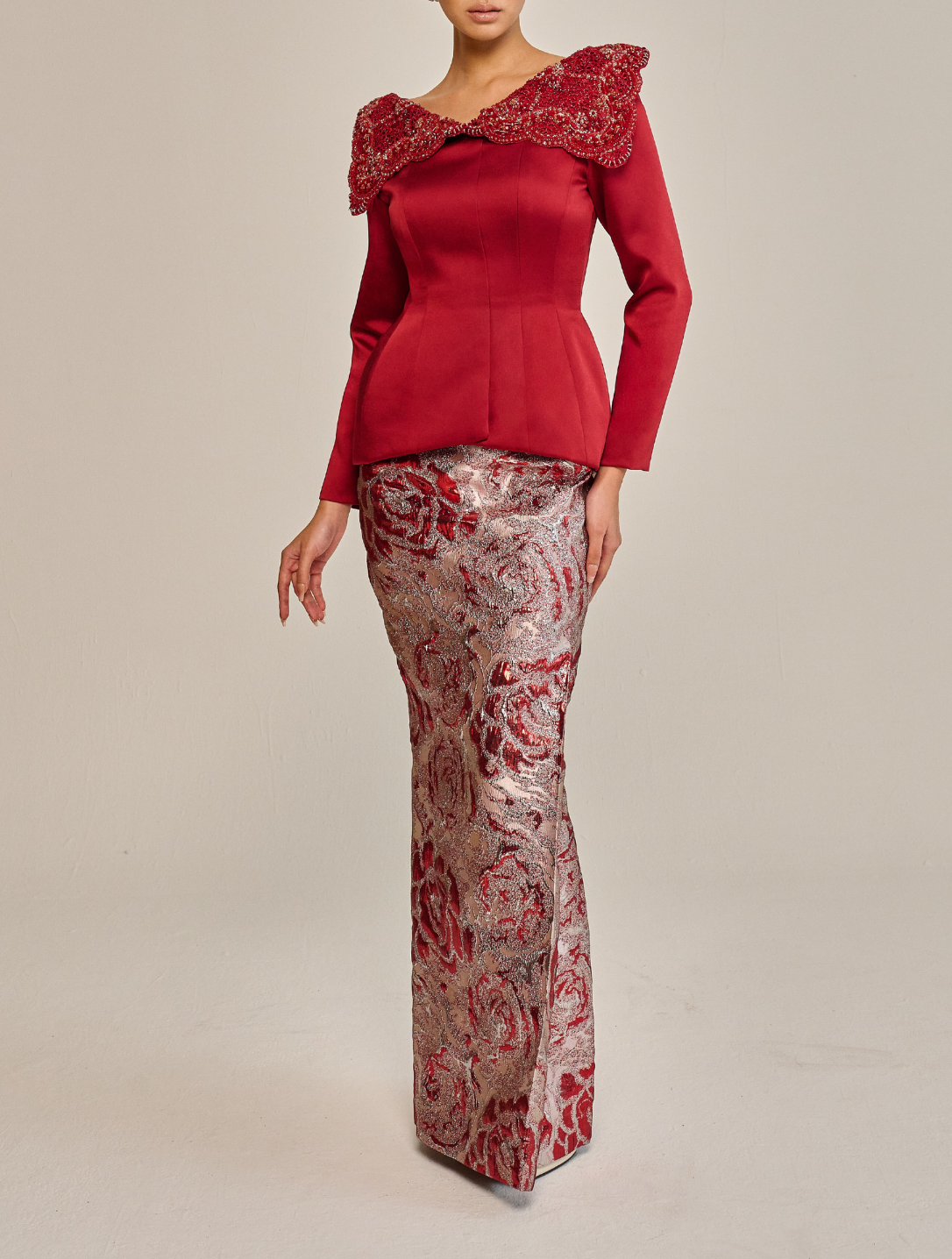 Kesuma presents a wide V-neckline top with a beaded flap collar and slim sleeves, fully lined for structure and comfort. It is paired with a sarong pencil skirt featuring an elasticised waistband, offering a streamlined silhouette with subtle decorative detail.