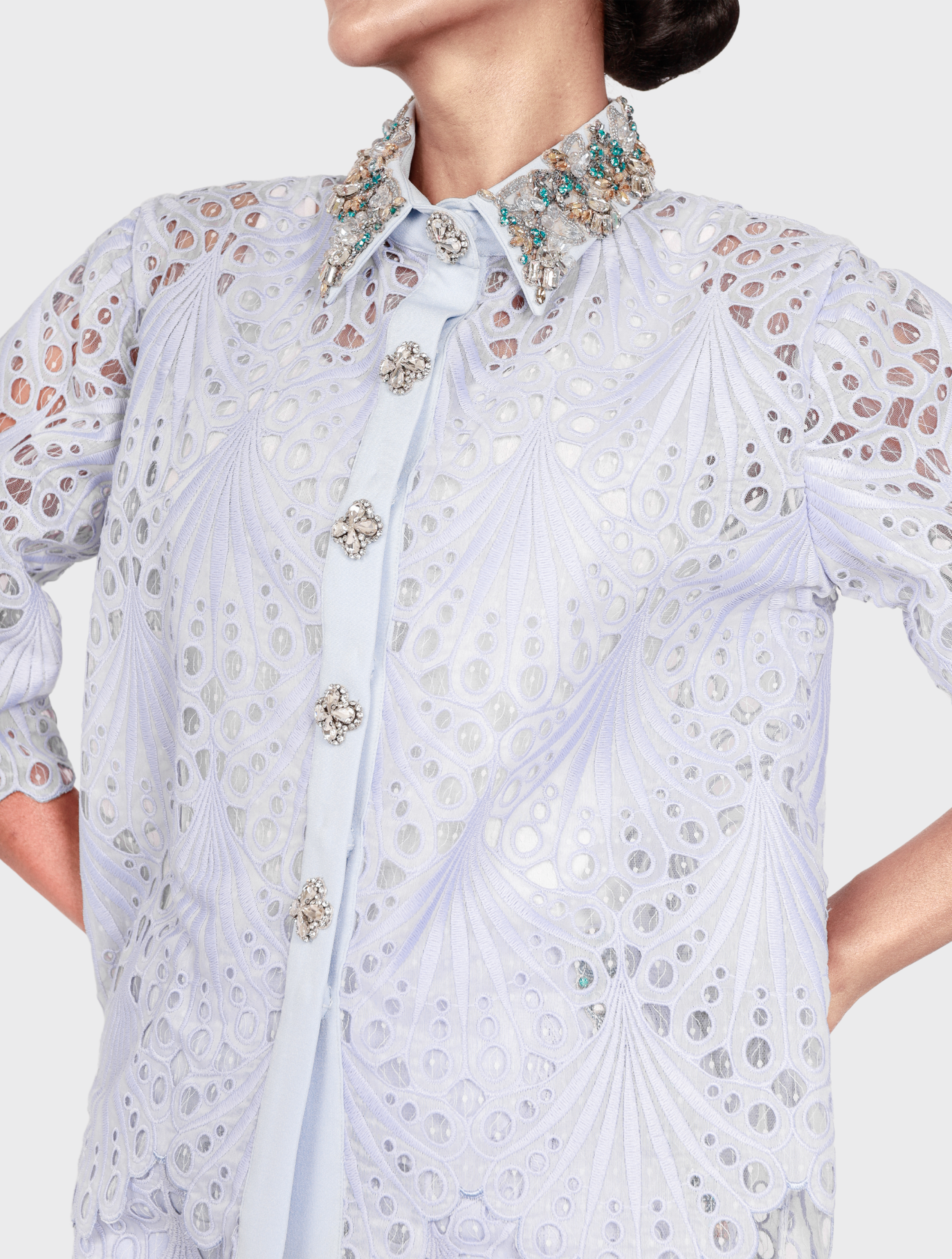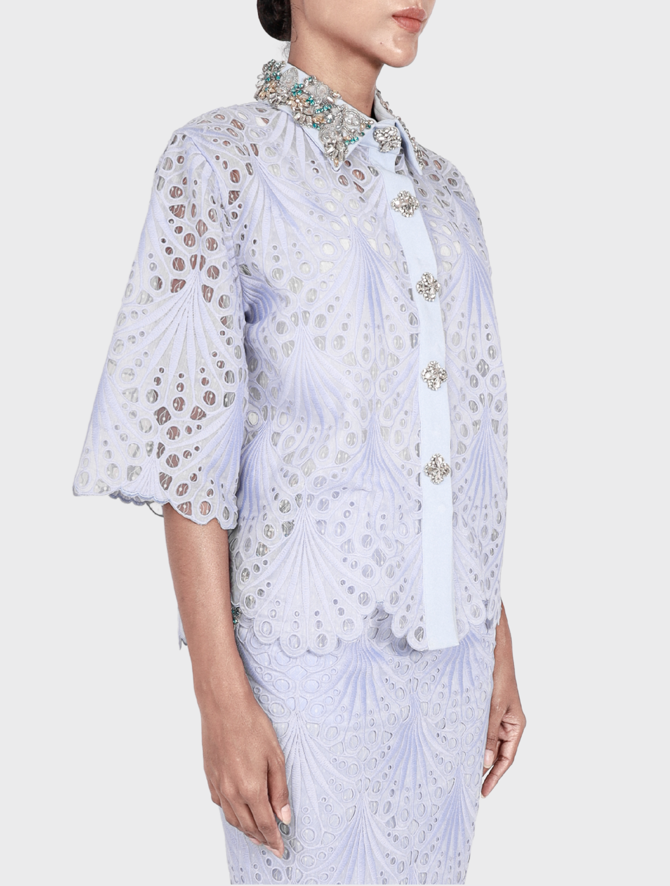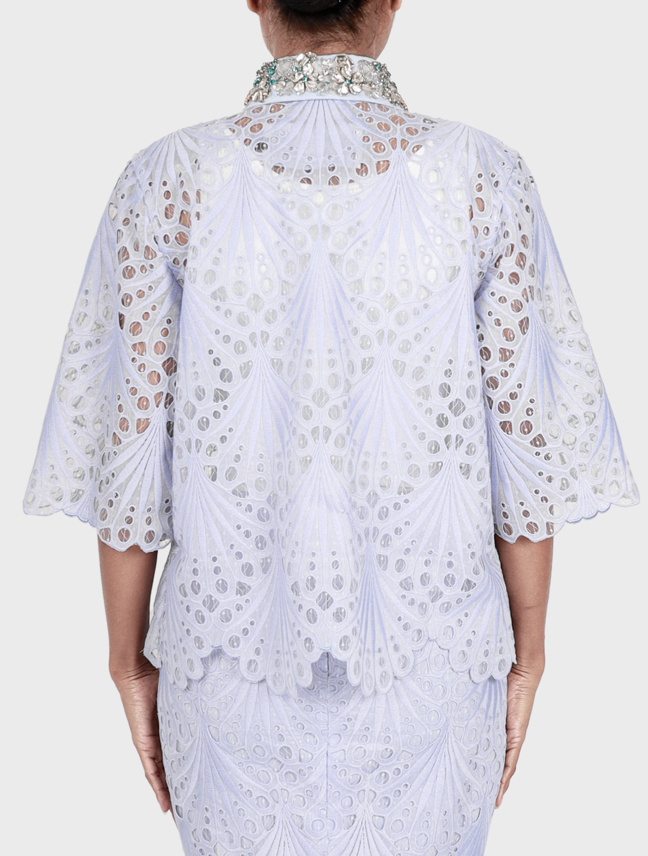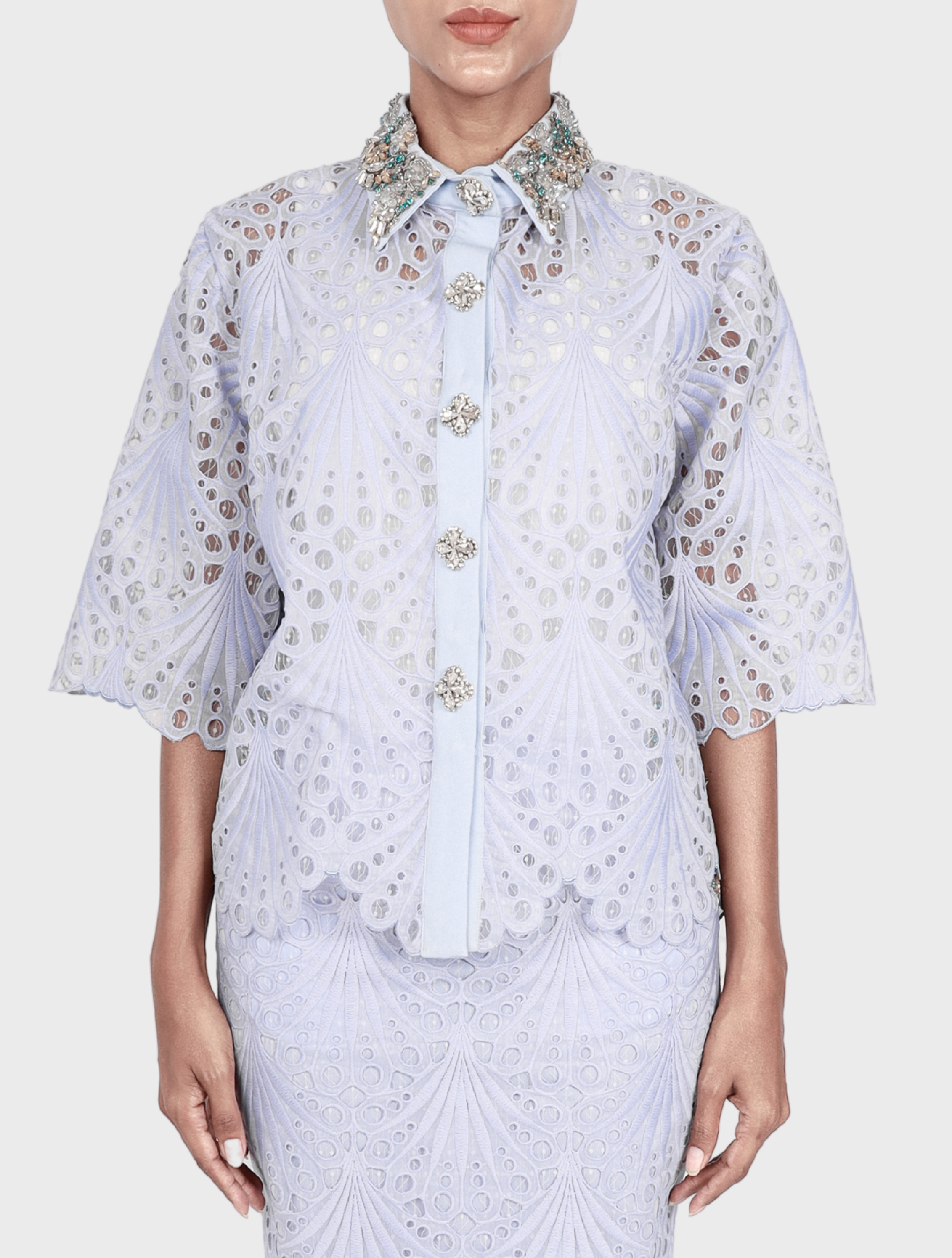 Roccapina in Indigo Blue stands out as a refined piece in our exclusive collection. Crafted from self-portrait guipure lace, it features an embellished collar, puff mesh glitter net sleeves with cuffs, and a hidden back zip with hook fastening. The comfort fit silhouette and mesh glitter net lining elevate its elegant appeal.