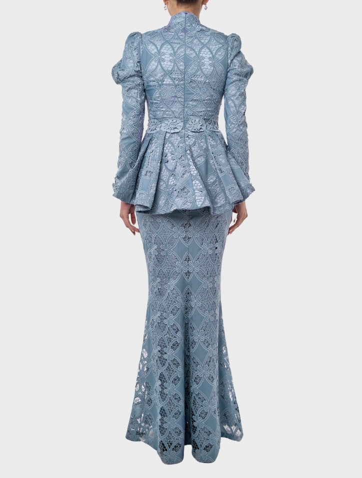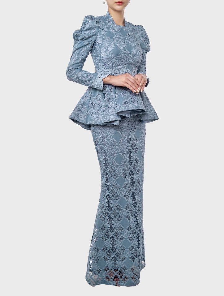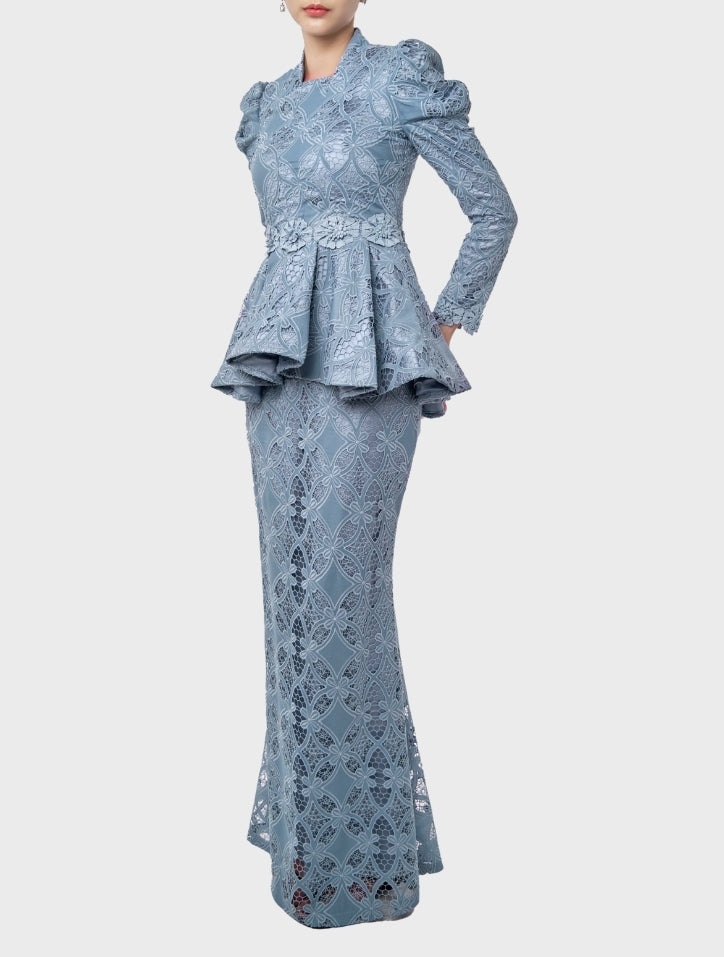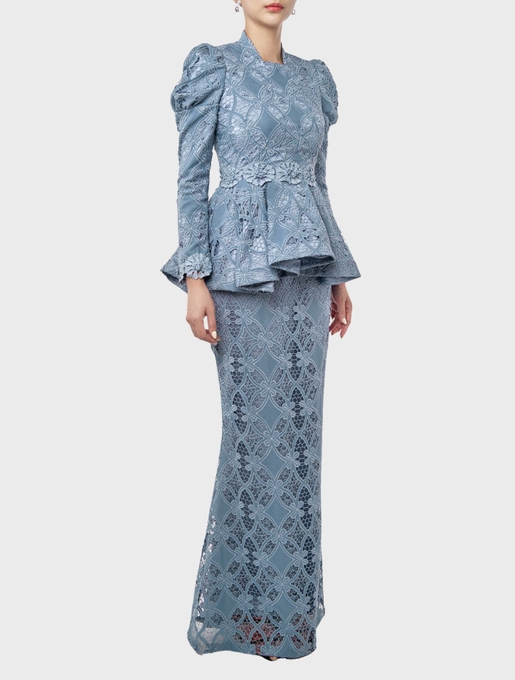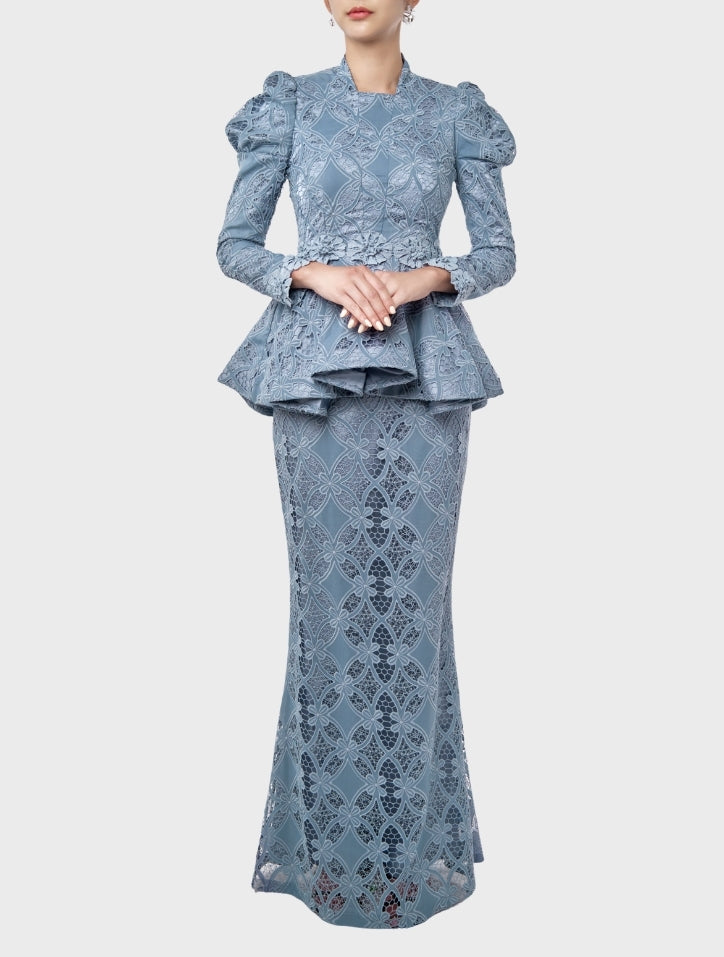Lini in Steal Blue is exuding timeless elegance, featuring a fitted kebaya with full embroidery lace and fagotting lace at the waist. A wavy peplum and puff shoulder sleeves with intricate lace add refinement, while a mermaid-cut skirt completes the silhouette. Lined with silky satin and finished with a hidden back zip and hook fastening, it offers a seamless, comfortable fit.