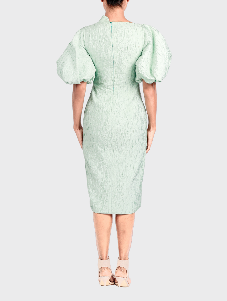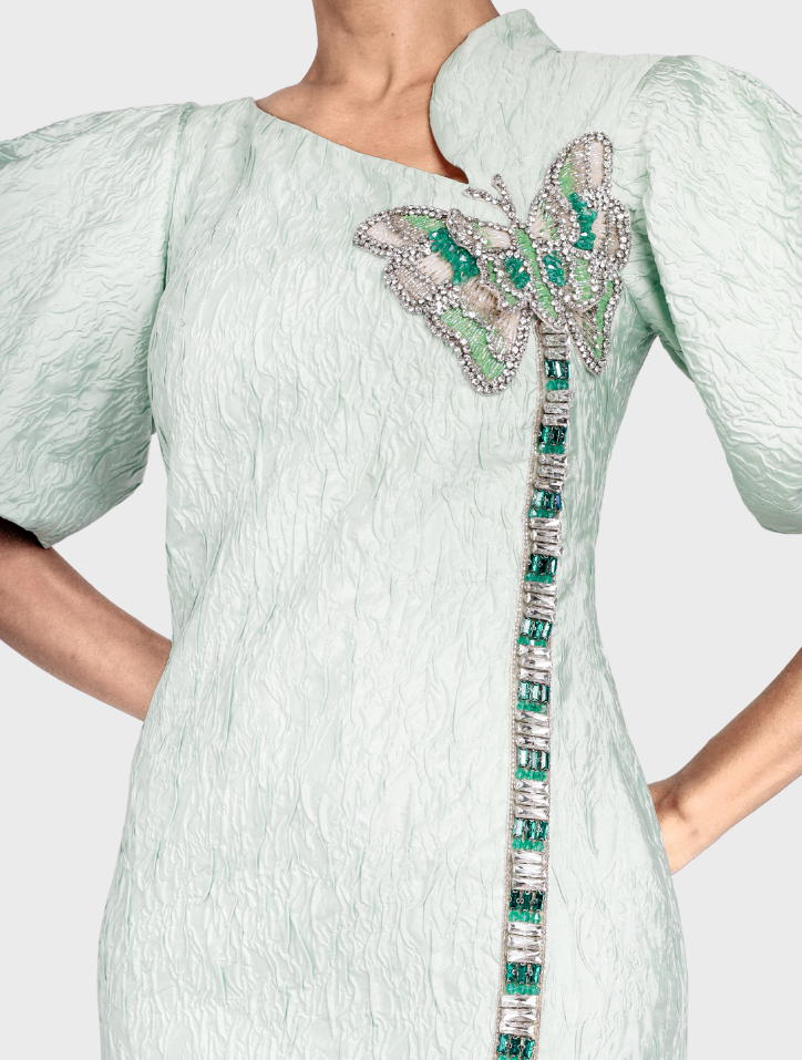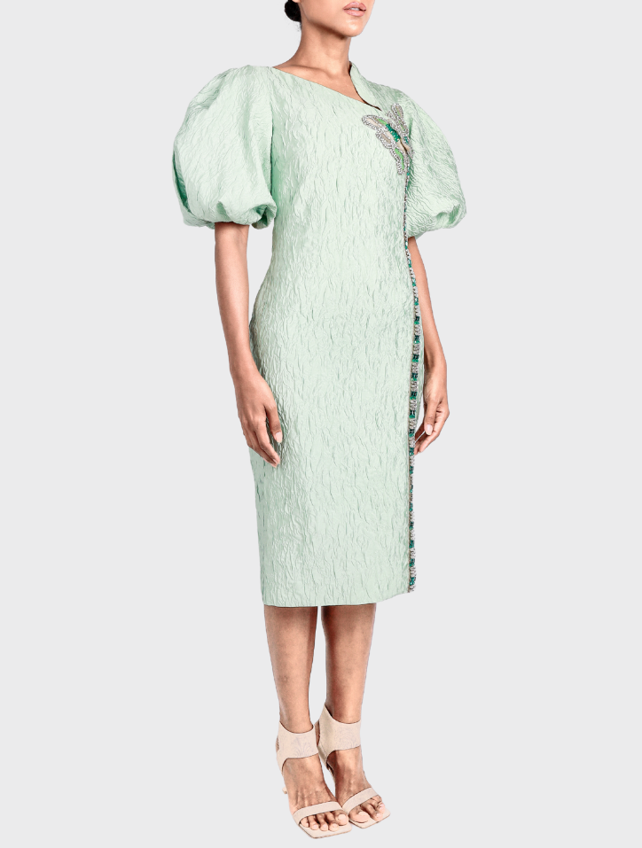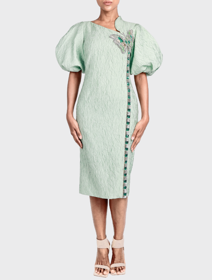 Valeya in Mint Green is crafted from soft jacquard fabric and features an asymmetrical neckline embellished with butterfly bead details. This midi dress showcases puff balloon sleeves, dual side pockets, a concealed back zipper, and is fully lined with satin for a refined touch.