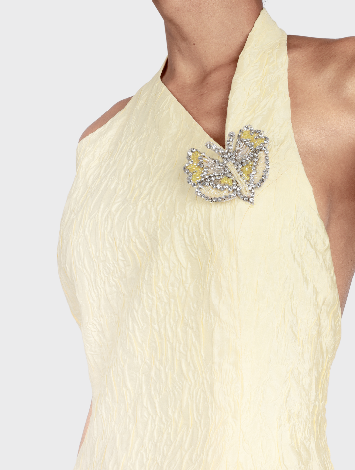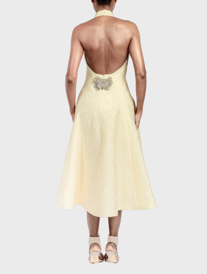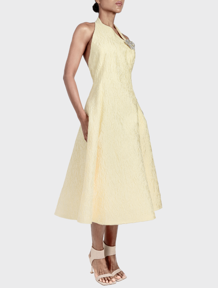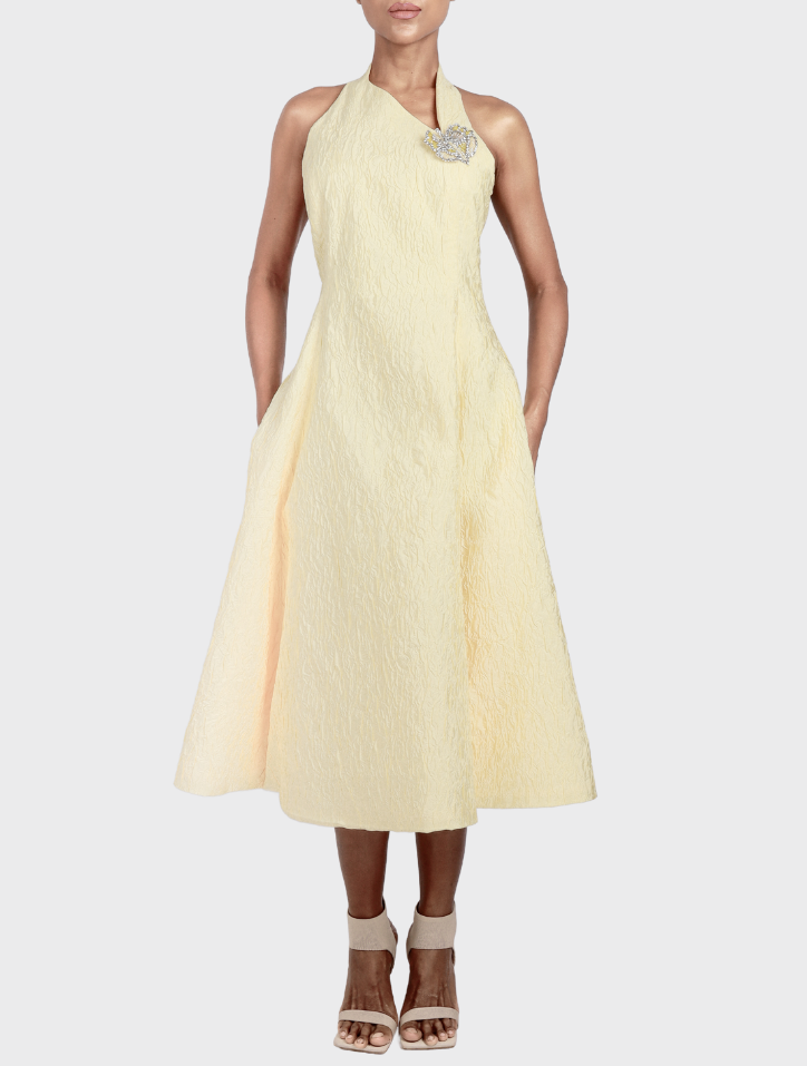 The Aleena in Pastel Yellow is crafted from soft jacquard fabric and features a sophisticated midi length with an asymmetrical neckline and a low bareback design. It includes side pockets on both sides, a concealed zipper with a back opening, and is fully lined with smooth satin fabric for added elegance.