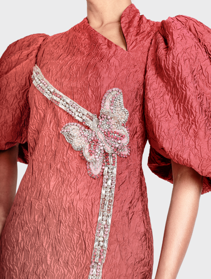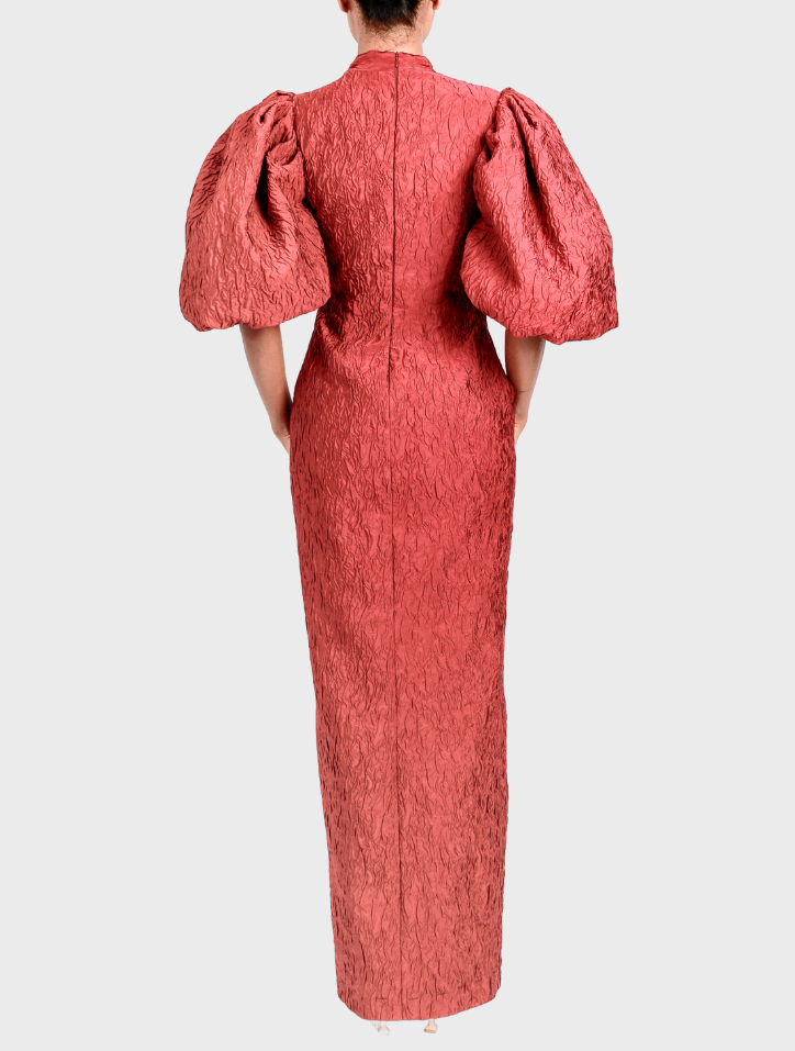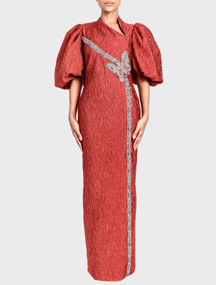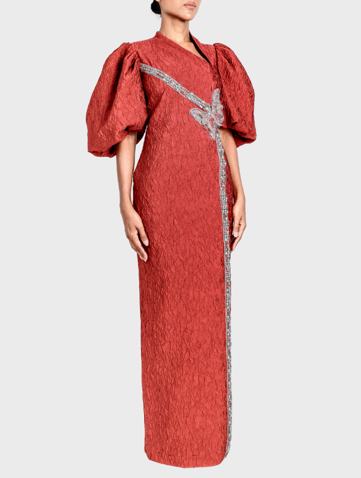 Anira in Cherry Red is fashioned from soft jacquard fabric and features an asymmetrical neckline adorned with butterfly bead detailing. This long dress includes puff balloon sleeves, side pockets on both sides, a concealed zipper with a back opening, and is lined with smooth satin fabric for a refined finish.