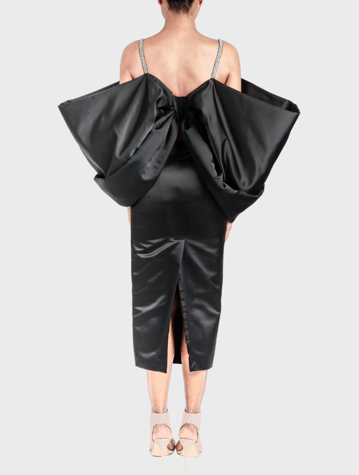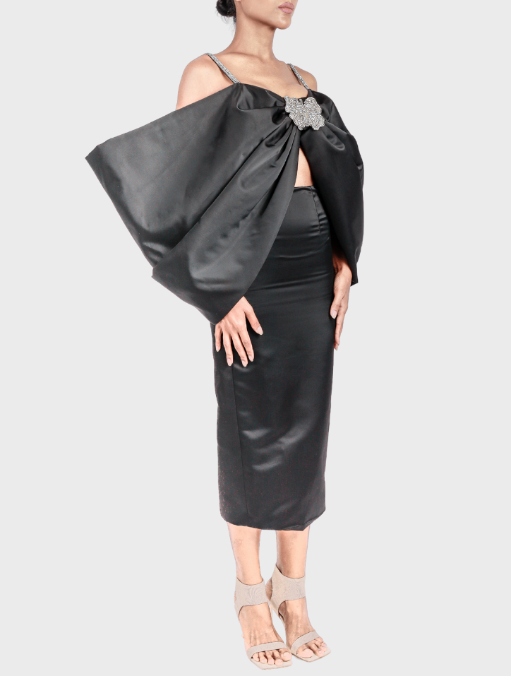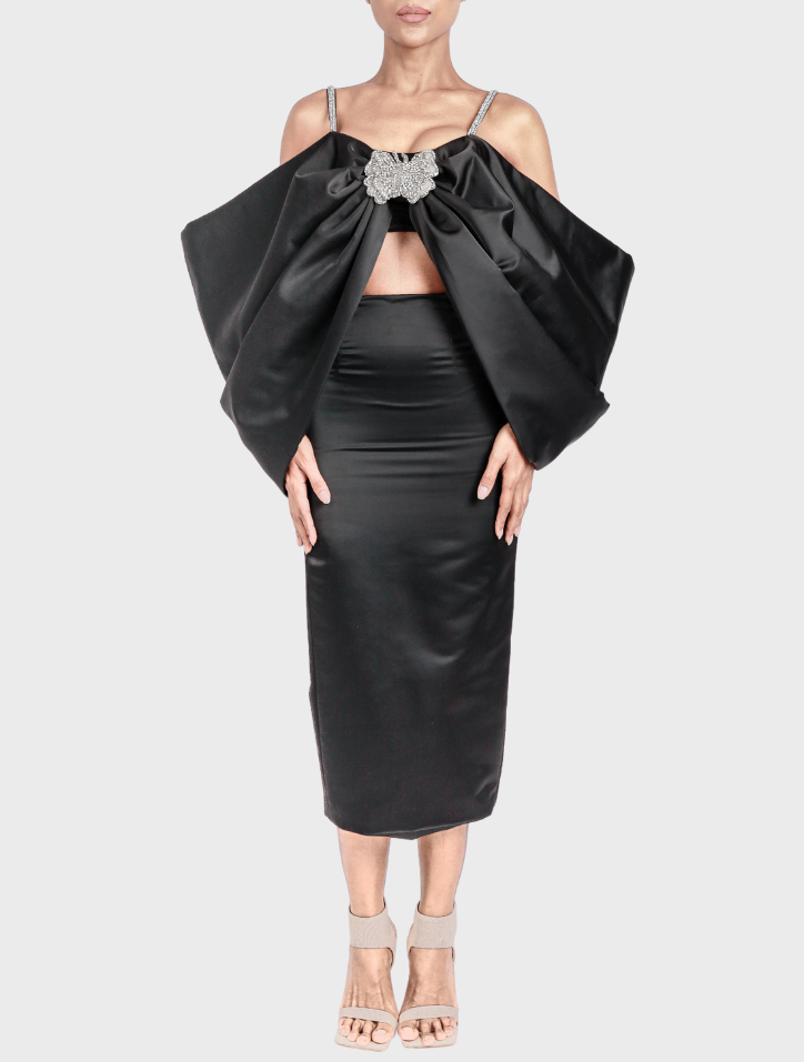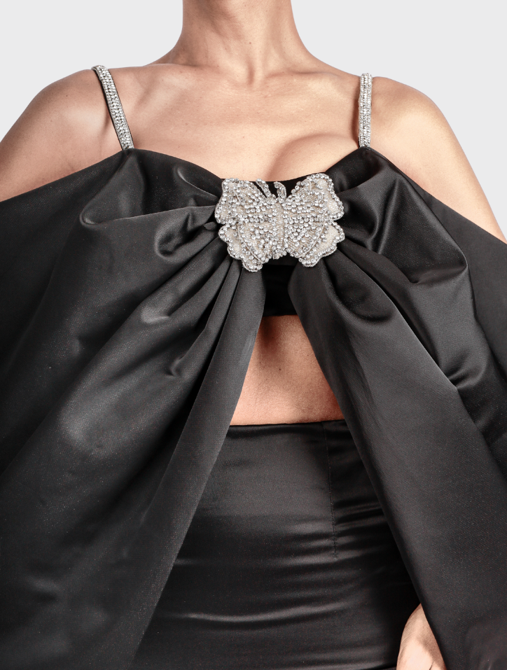 Levira in Black is crafted from soft jacquard fabric. The top features a straight neckline with slender straps, highlighted by a bow ribbon and butterfly bead accents on the bra. It secures at the back with buttons and is fully lined with satin. The skirt falls to the knee, includes a back slit, a concealed zipper, and an opening at the back, also lined with satin for a polished look.