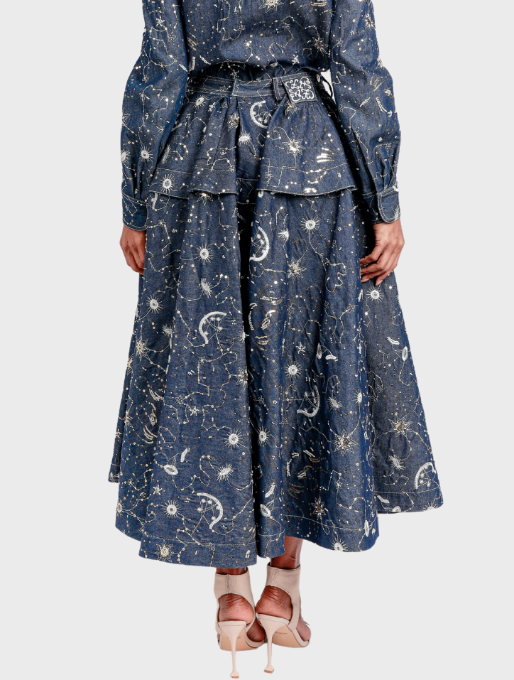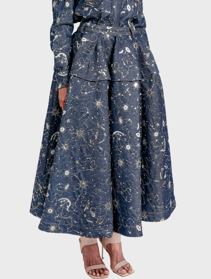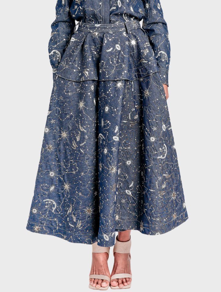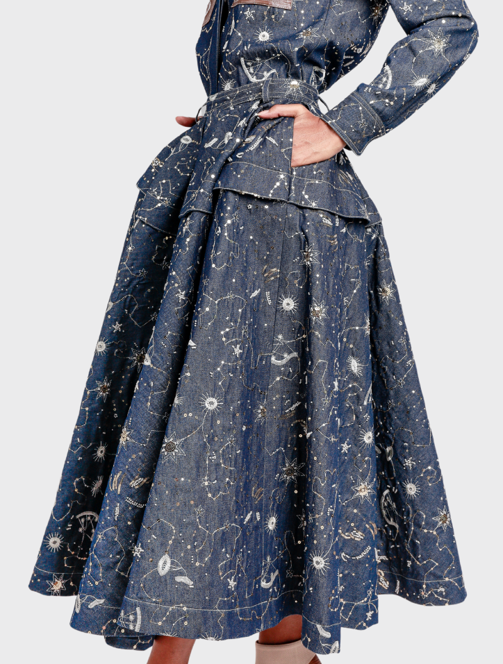 Leora in Dark Denim skirt features a full 360-degree circular design for elegant movement. It includes discreet side pockets on both sides and a concealed zipper with a back opening for a seamless look. This skirt is unlined, offering a lightweight and refined silhouette.