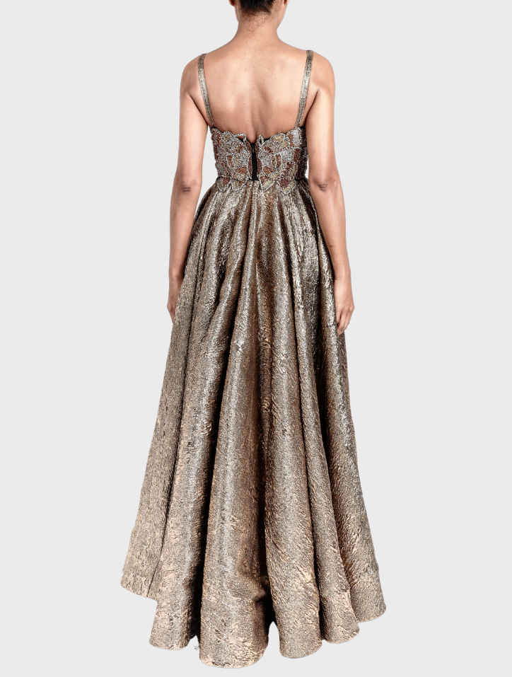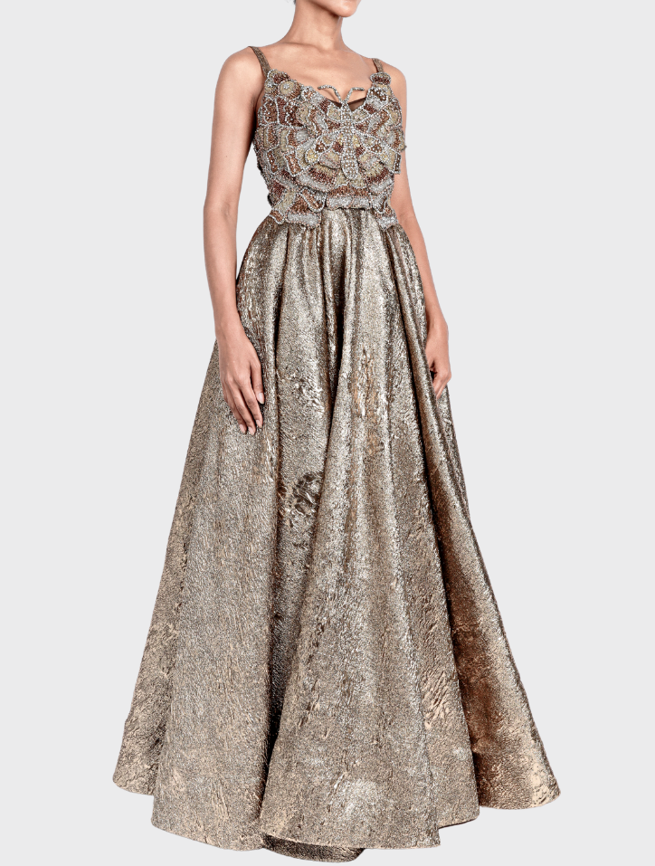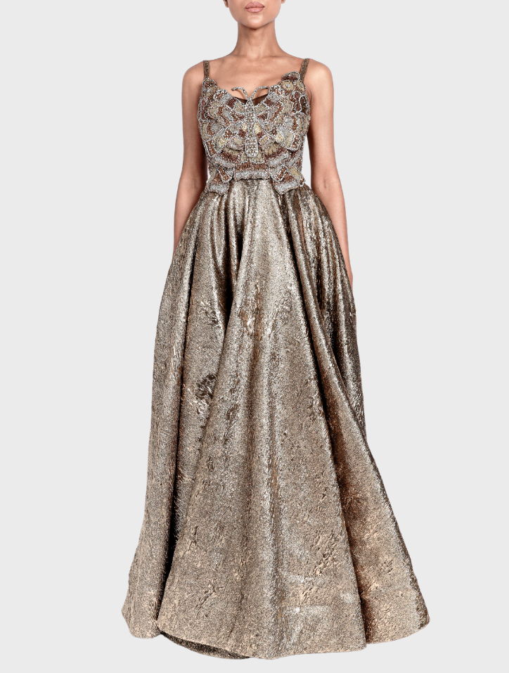 Yuna in Gilver is fashioned from soft jacquard fabric, featuring a strapless scoop neckline adorned with delicate butterfly beadwork. This 360-degree circular maxi dress includes hidden pockets on both sides and a concealed zipper at the back. Fully lined with satin, it combines elegance with comfort.
