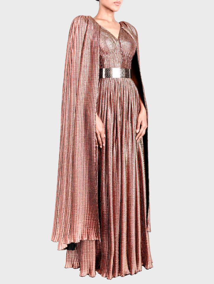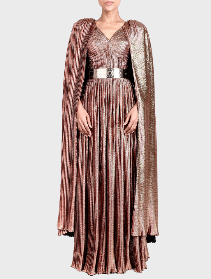 Vela in Umber Bronze is made from soft jacquard fabric and showcases a V-neck with cape sleeves featuring pleated accents. Its pleated circular maxi skirt is enhanced with butterfly bead detailing. Equipped with side pockets on both sides and a hidden zipper with an opening at the back, this dress is fully lined with satin for a smooth, elegant finish.