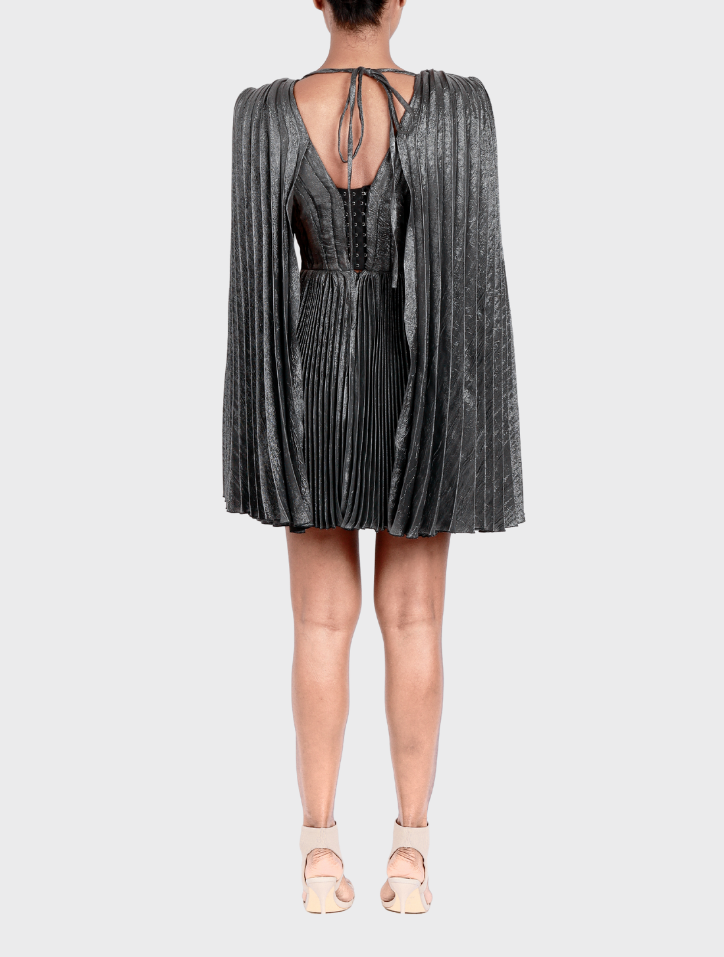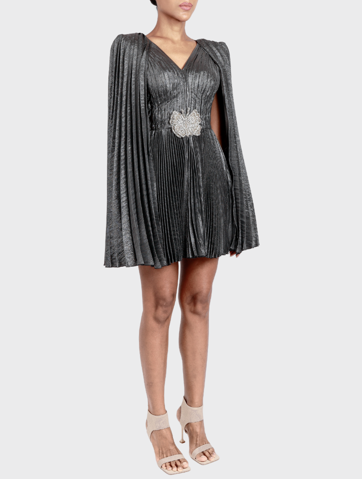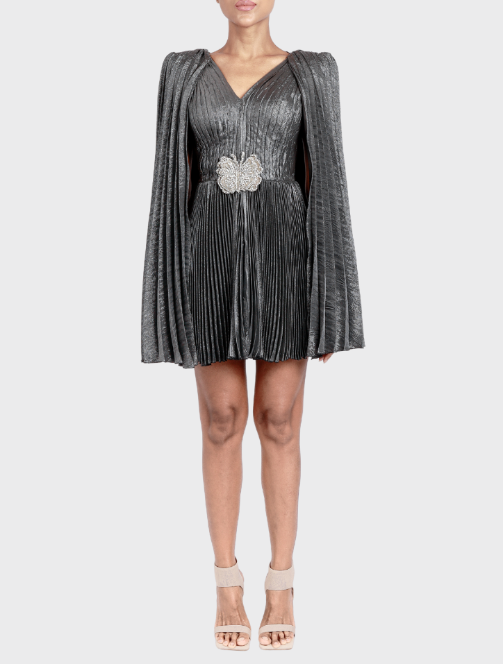 The Lunel dress in Silver Grey denim showcases a V-neck with cape sleeves featuring elegant pleats. This short, pleated circular dress is embellished with intricate butterfly beadwork. It offers convenient side pockets on both sides, a discreet back zipper, and is fully lined with luxurious satin fabric for a refined finish.