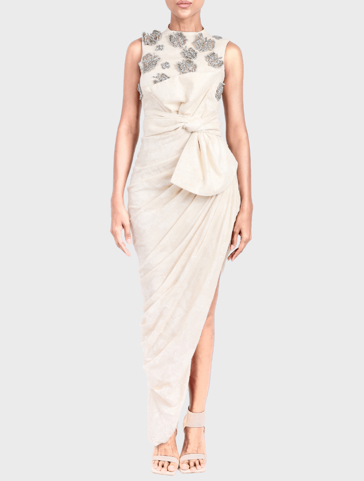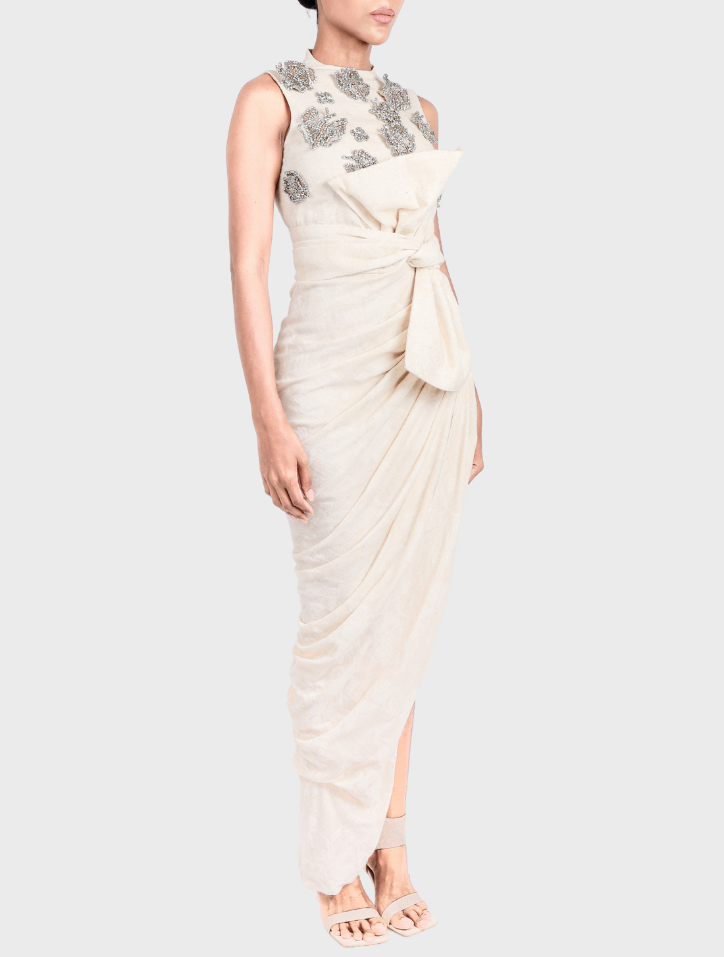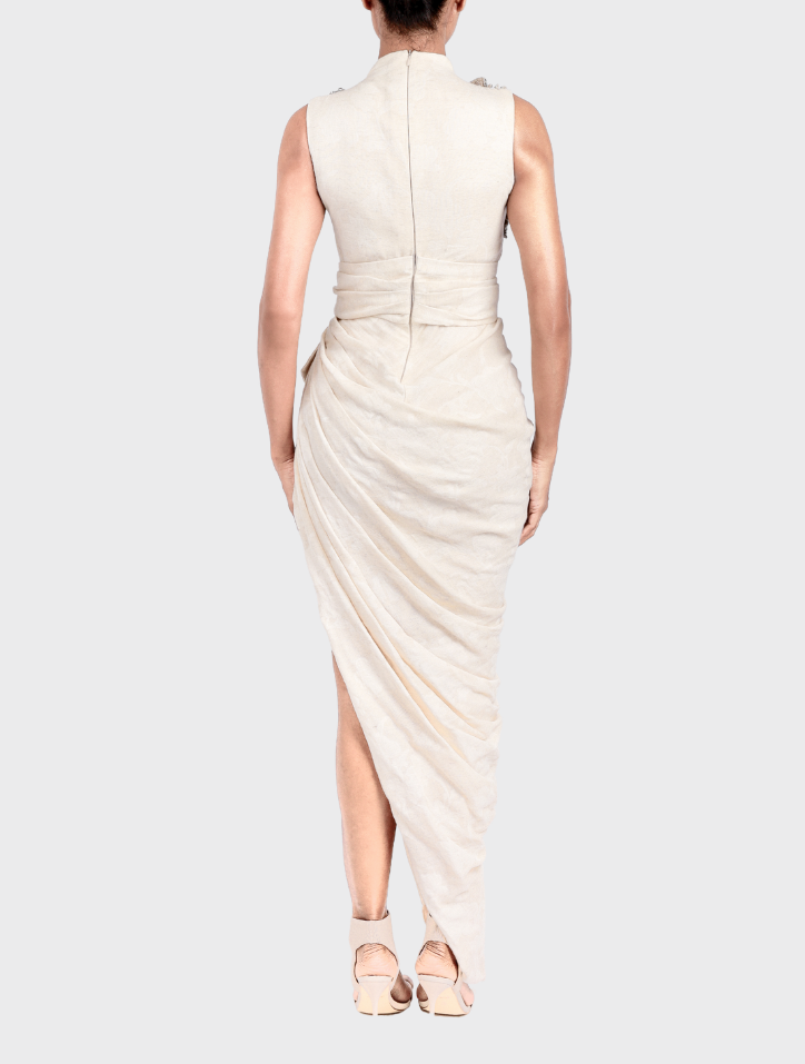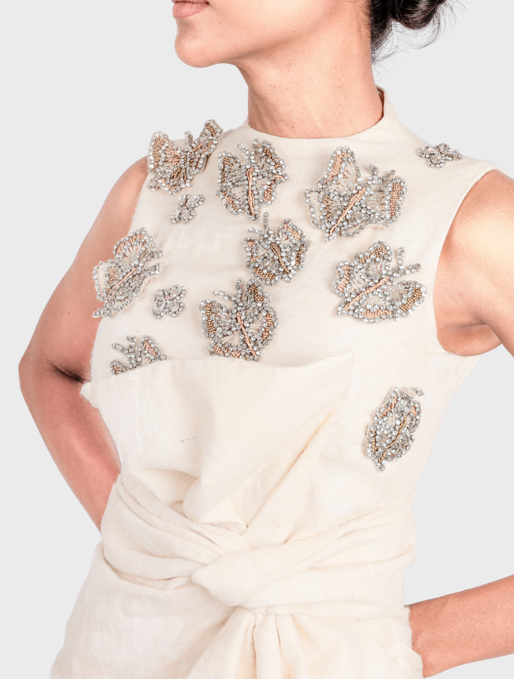 The Aurelia midi dress in Ivory Pearl linen features a sleeveless round neckline adorned with delicate butterfly bead embellishments. Its asymmetric draped silhouette is highlighted by a knotted bow detail. The dress includes a concealed zipper and back opening, and is fully lined with smooth satin for a polished look.