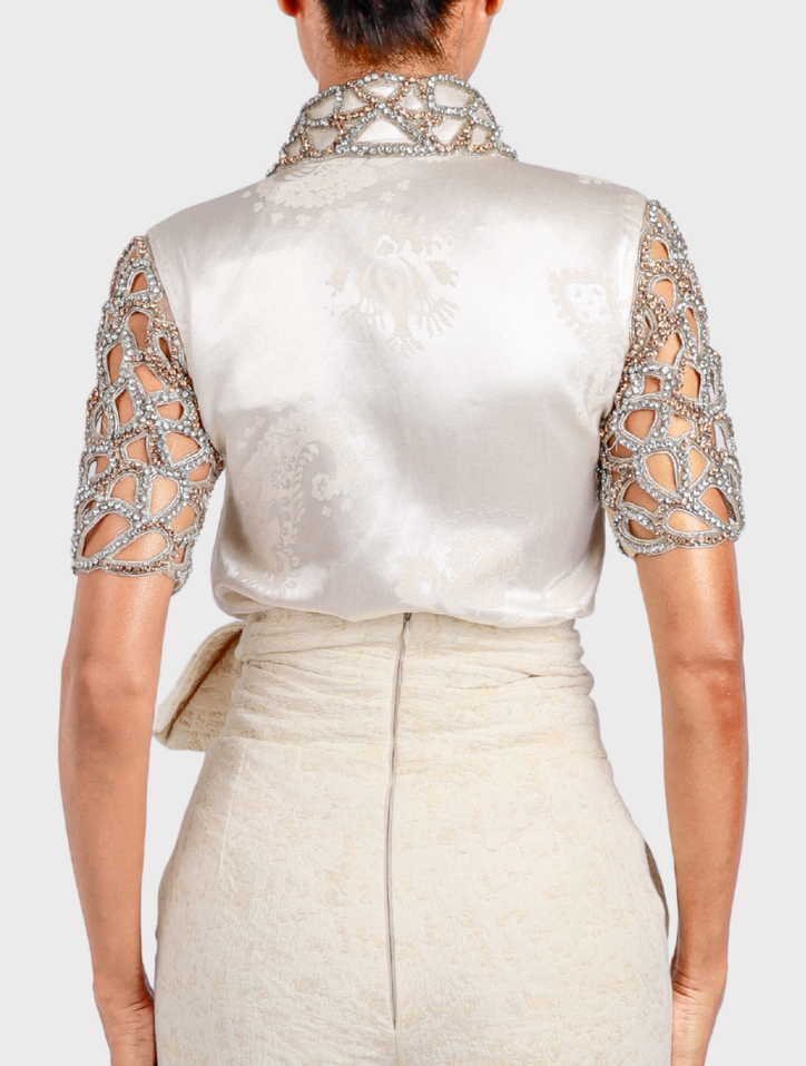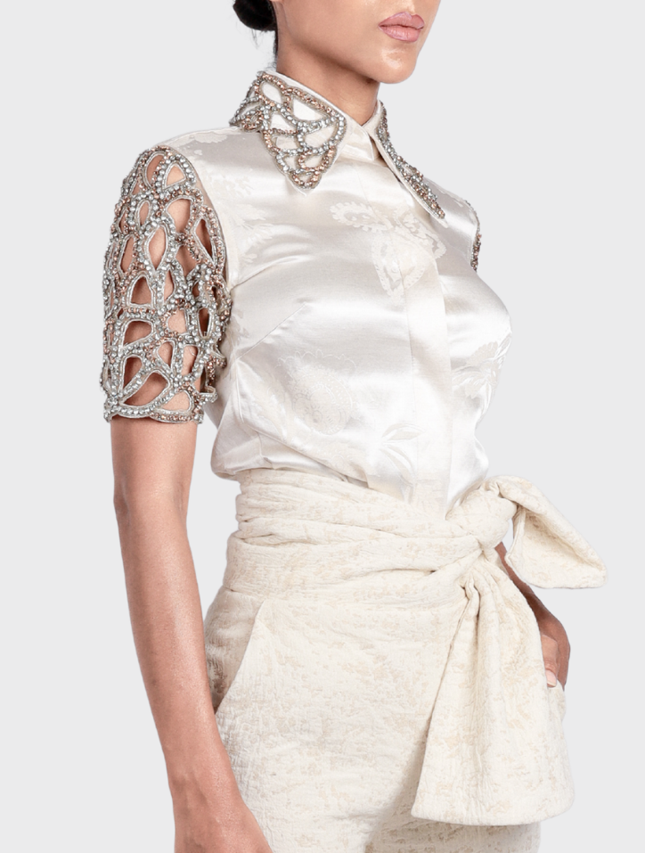Elaura in Opal Cream shirt is crafted from luxurious silk satin. It features a collared neckline adorned with delicate butterfly bead embellishments, short sleeves with matching beaded accents, a front button closure, and an unlined design for a refined, elegant look.