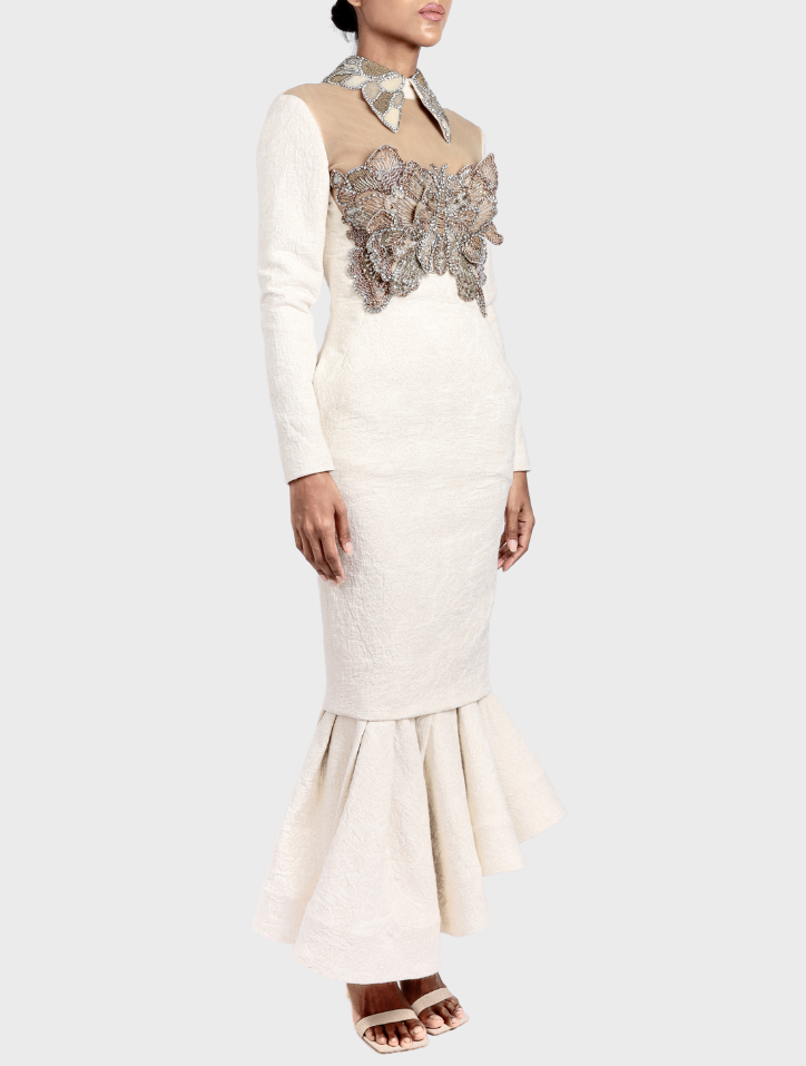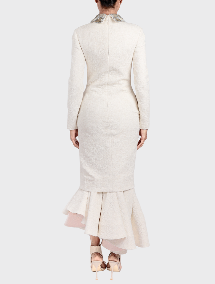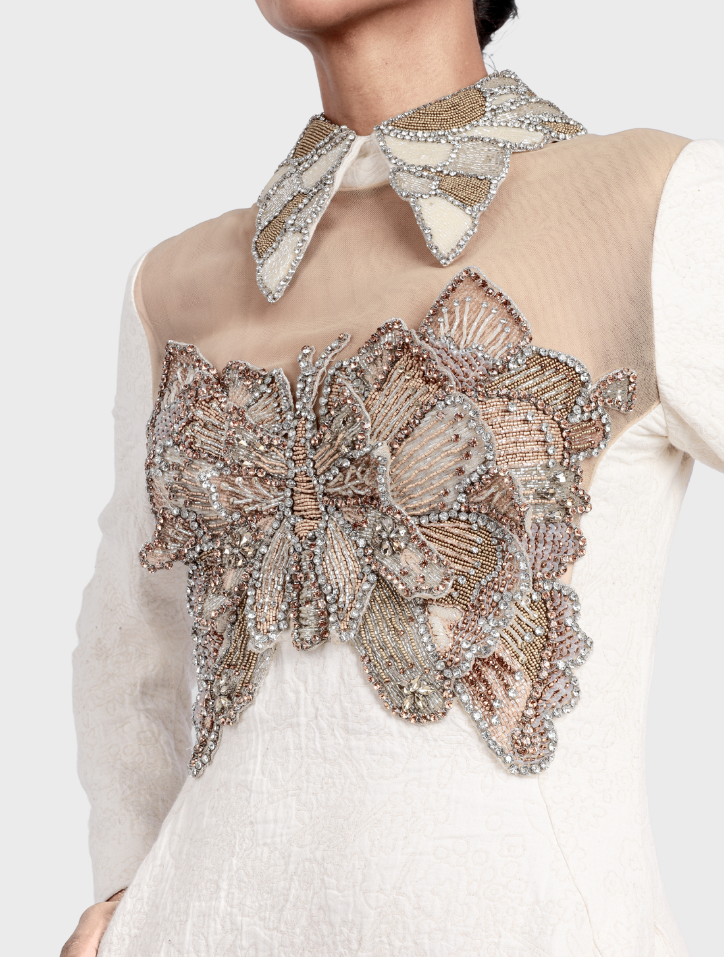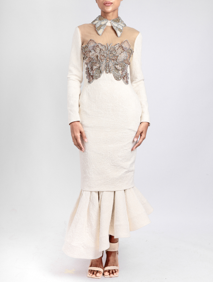 Talia in Celestial Ivory is crafted from linen and features a collared neckline embellished with beads and long sleeves. Delicate butterfly bead accents adorn both the front and back bodice. This midi dress boasts a 360-degree asymmetrical circular hem, a discreet back zipper with an opening, and is fully lined with luxurious satin fabric for a refined finish.