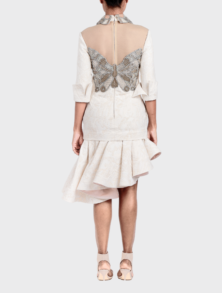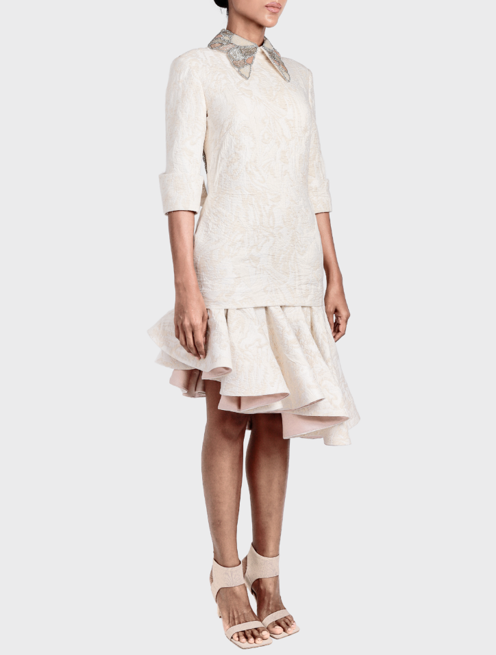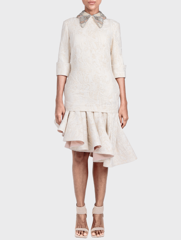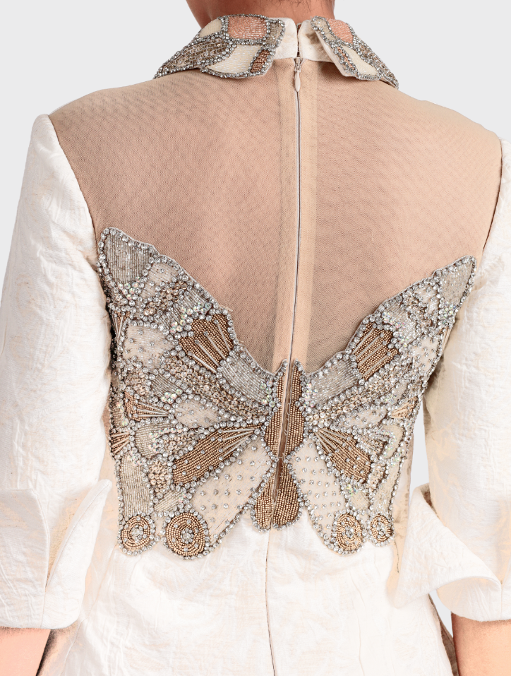 The Salene in Moonlight Cream dress is made from linen and showcases a collared neckline embellished with butterfly beadwork, complemented by 3/4 sleeves featuring overlapping slits. This 360-degree asymmetrical circular dress transitions from mini to midi length. It includes a discreet back zipper and opening, and is lined with luxurious satin fabric for a refined finish.