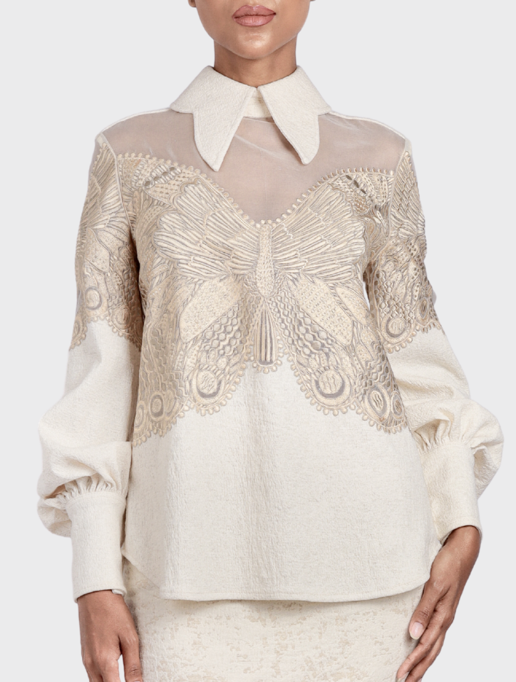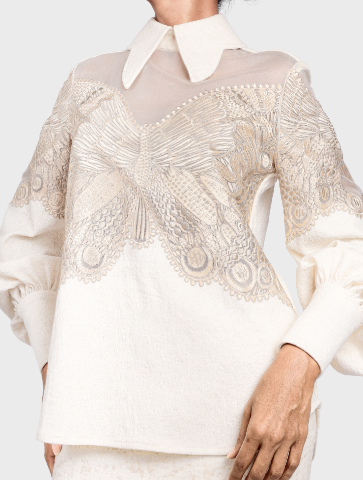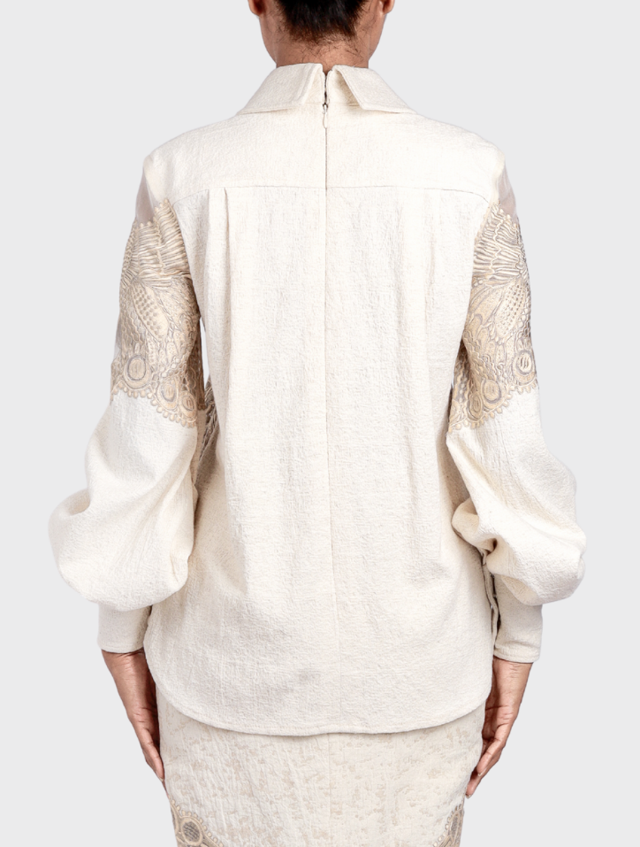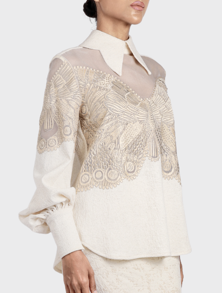 The Velyra shirt in Ivory Pearl linen features a collared design accented with butterfly embroidery. It showcases balloon sleeves with cuffs, a back opening secured by buttons, and a concealed zipper at the rear. This unlined piece combines elegance with subtle detailing.