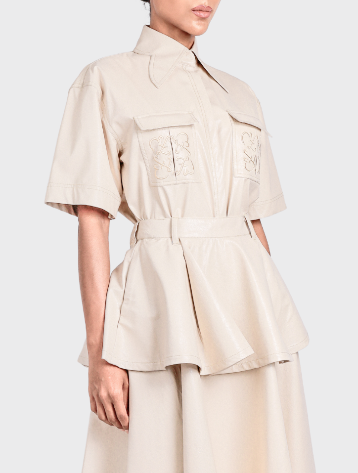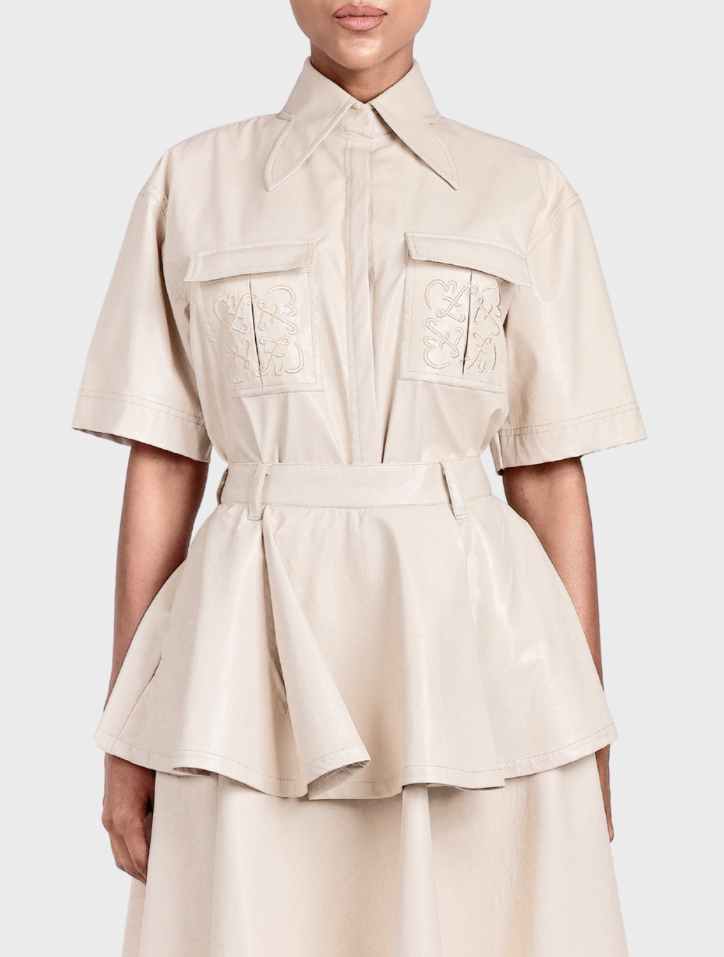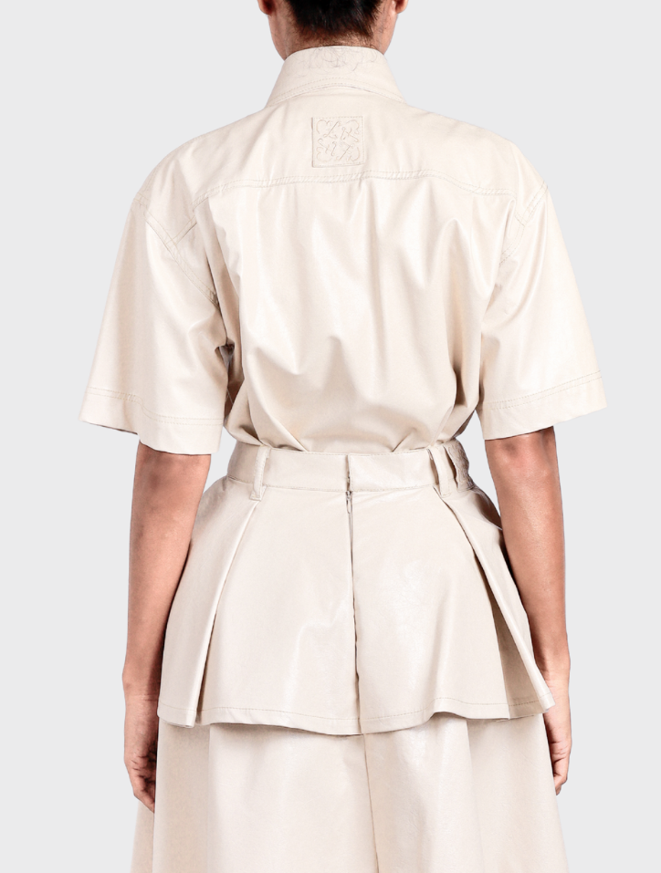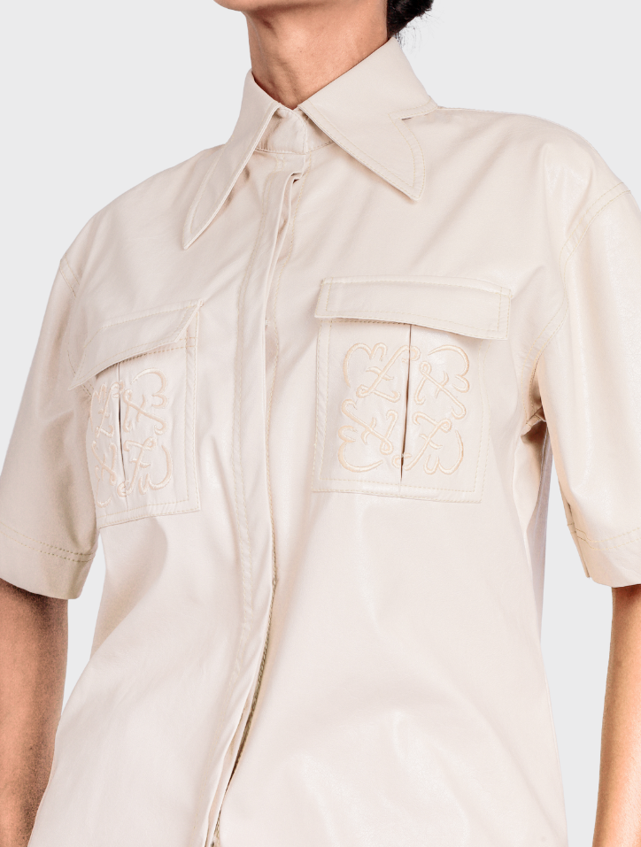 Hyra in Pale Fawn leather shirt features a classic collar and short sleeves. It is detailed with flap pockets embroidered with 'FIZIWOO' in denim on both sides, a button-front closure, and an unlined design for a refined, minimalist finish.