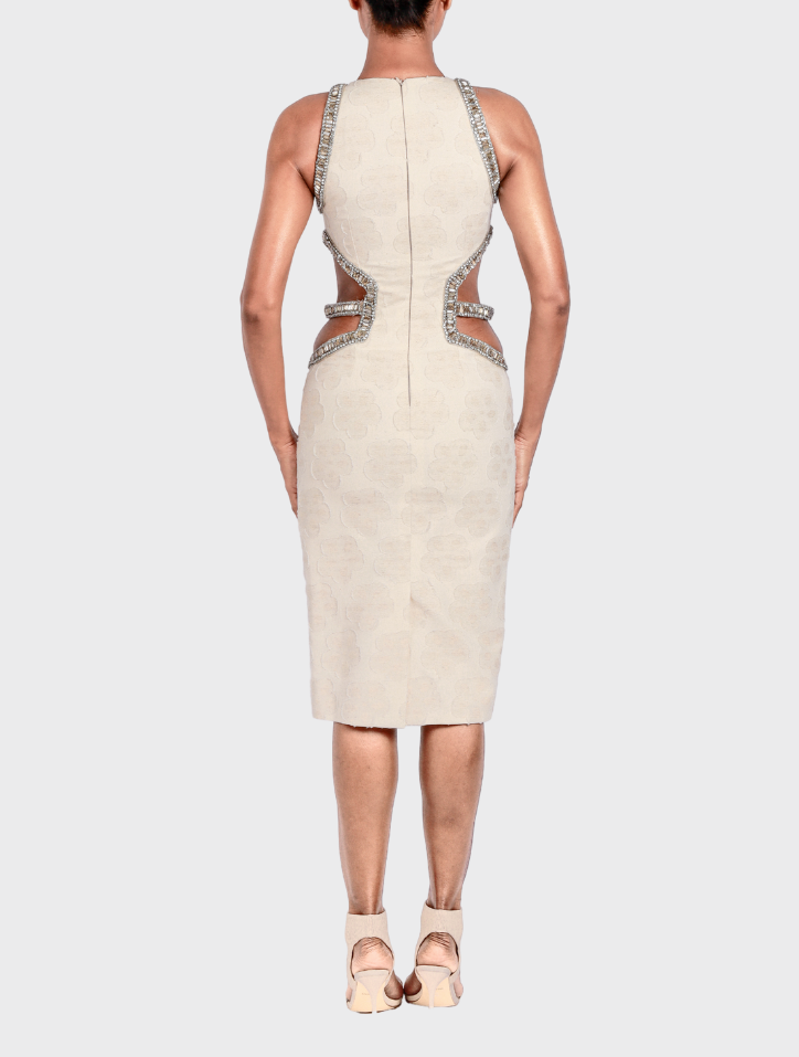 The Nahlia dress in Oat Beige is crafted from linen and features a sleeveless design with a round neckline. It is adorned with delicate butterfly beadwork on the bodice and falls to a knee-length midi with a tasteful slit. The back includes a concealed zipper and opening, while the dress is fully lined with luxurious satin for a refined finish.