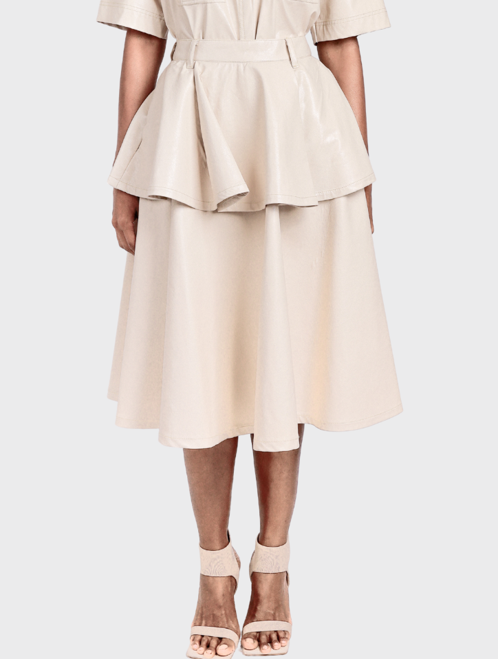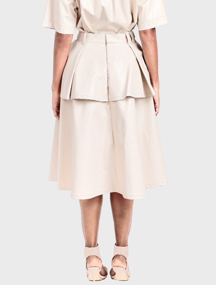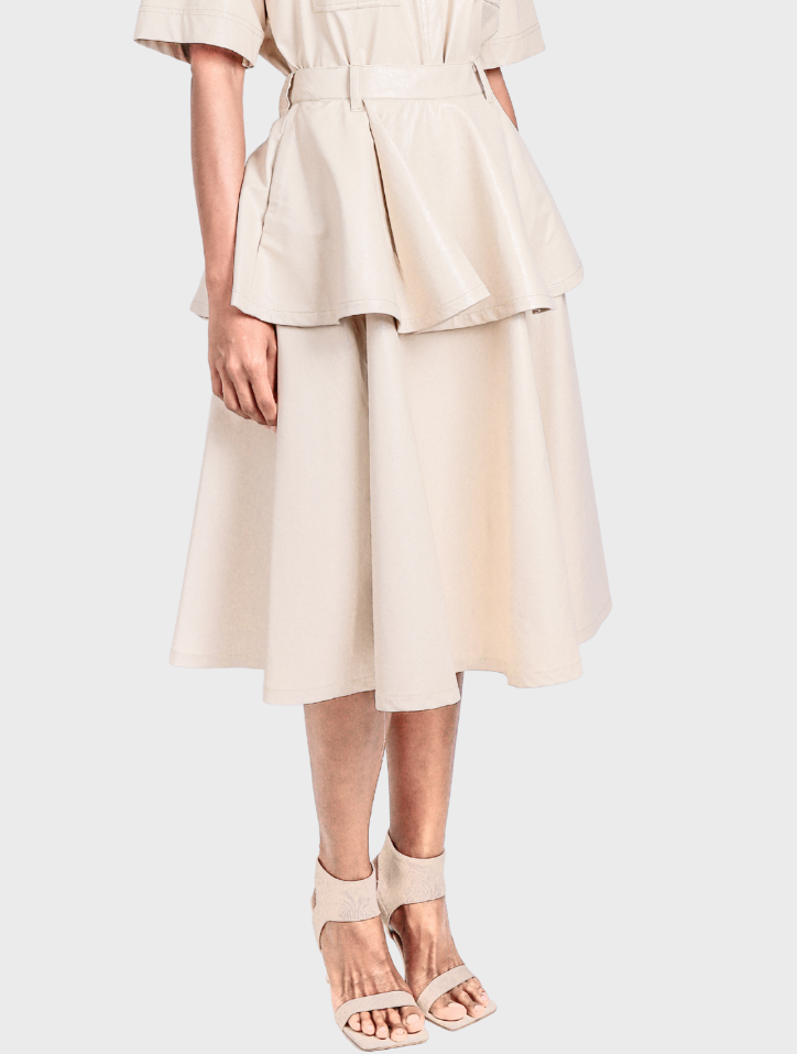 Hylee in Pale Fawn leather skirt features a double-layered, full-circle design that extends gracefully. It includes side pockets on both sides, a discreet zipper with a back opening, and is crafted without lining for a sleek finish.