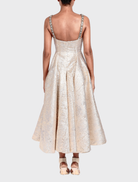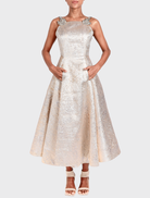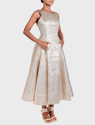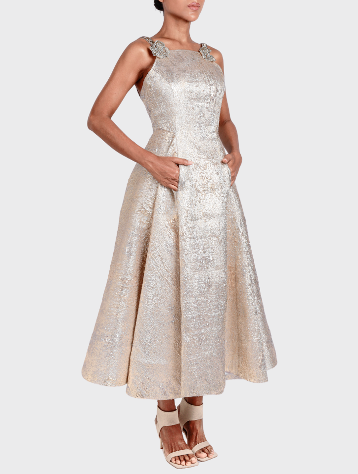 Vaneesa in Blushed Silver is made from soft jacquard fabric and designed as a sleeveless maxi dress with delicate straps. It features a full 360-degree circular skirt, concealed pockets on both sides, and a hidden zipper with a back opening. The dress is elegantly lined with satin for a smooth finish.