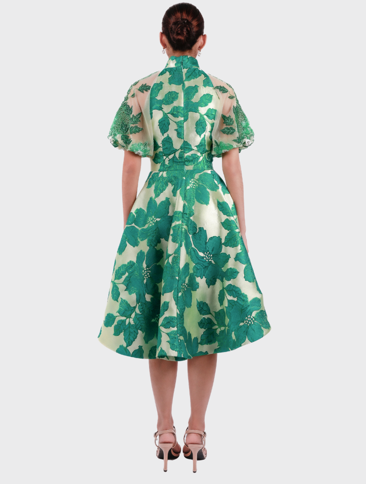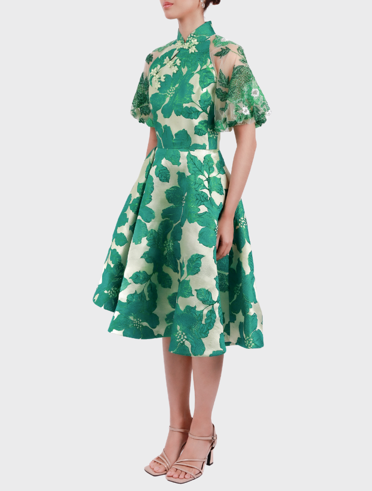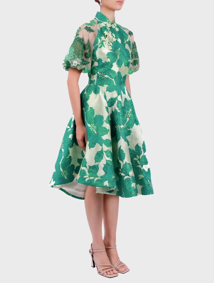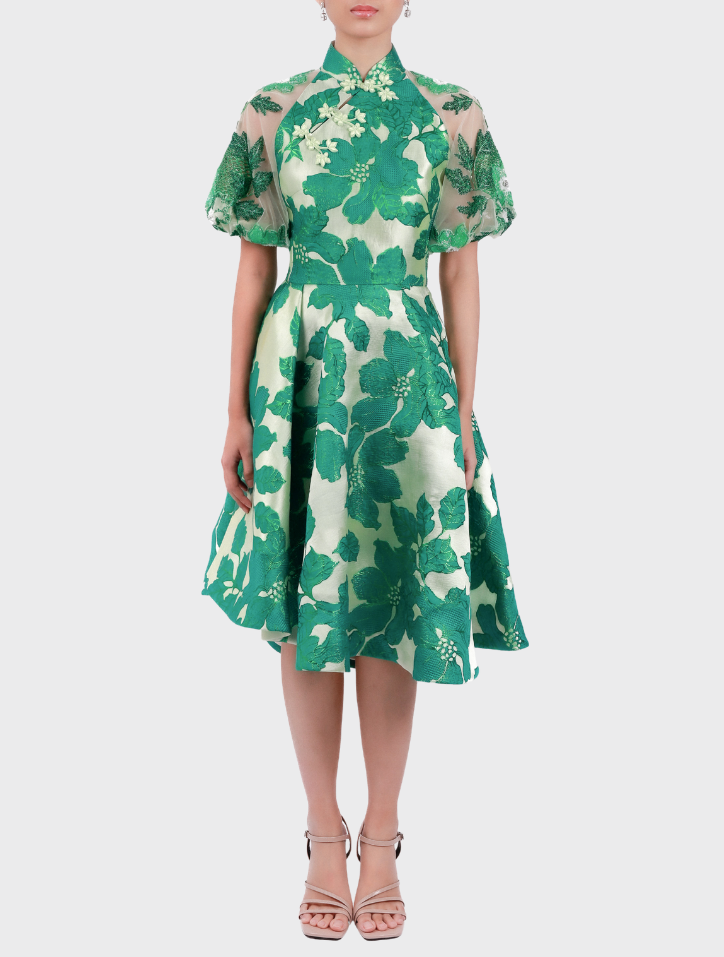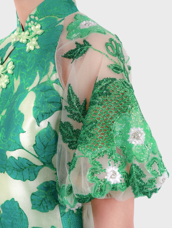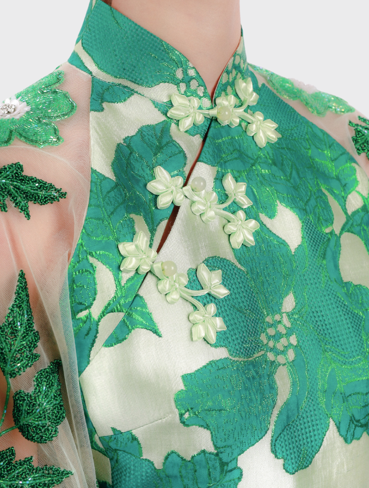 Lu Meng in Forest Green is crafted from elegant jacquard fabric with a distinctive angular slit and traditional frog fastening. It features beaded raglan sleeves, an asymmetrical hemline, and structured shoulder pads for added shape. The piece is fully lined with satin silk and finished with a concealed back zip.