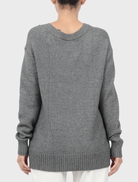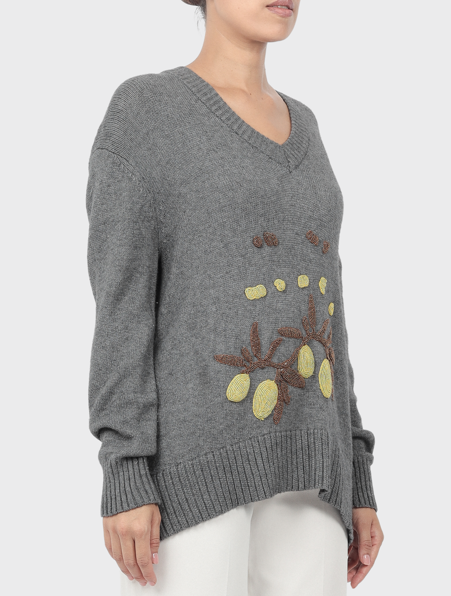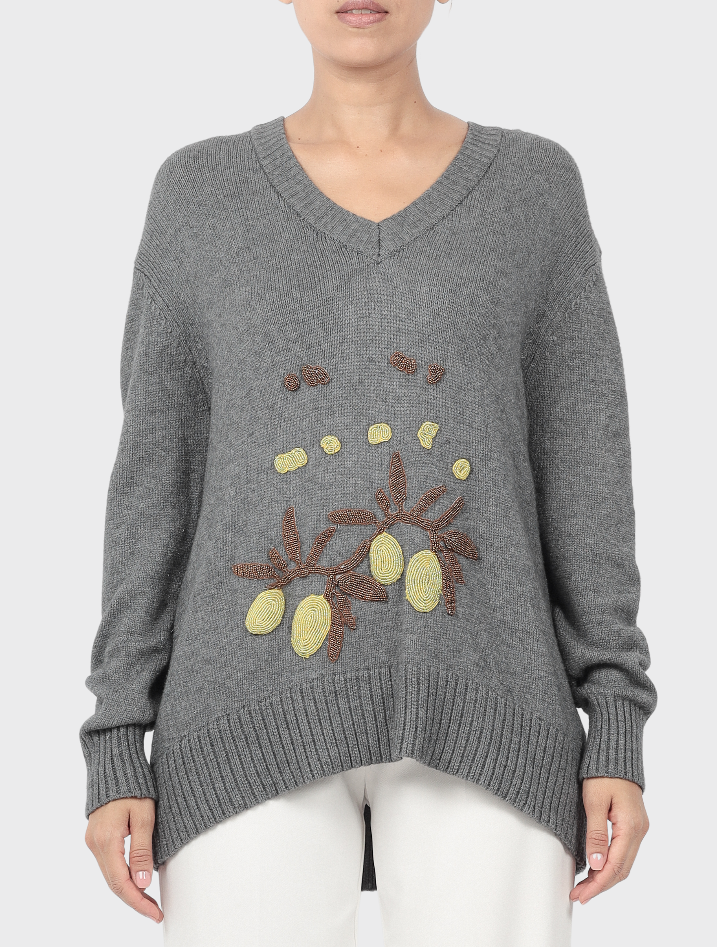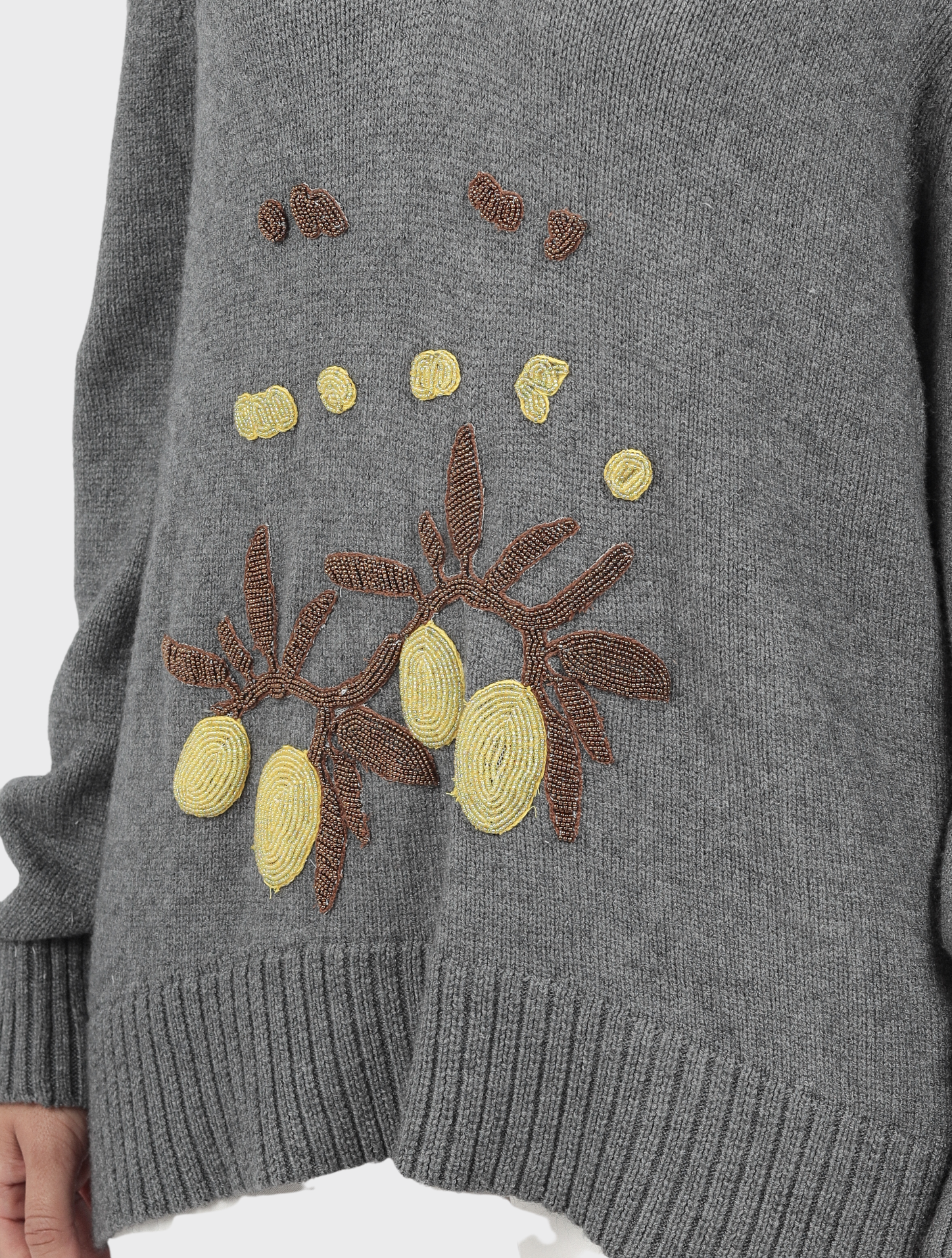Featuring opulent designs with phrases, vibrant hues, and whimsical patterns adorned with exquisite hand embroidery, tambour beads and mango appliques to highlight the delectable fruit in an extravagant manner. Knit Sweater with Long Sleeves Round neckline Crochet Knit top Embellished with an original 'FIZIWOO Harumanis' handmade tambour beads patterns Long sleeves Regular fit and unlined in Bluish Grey.