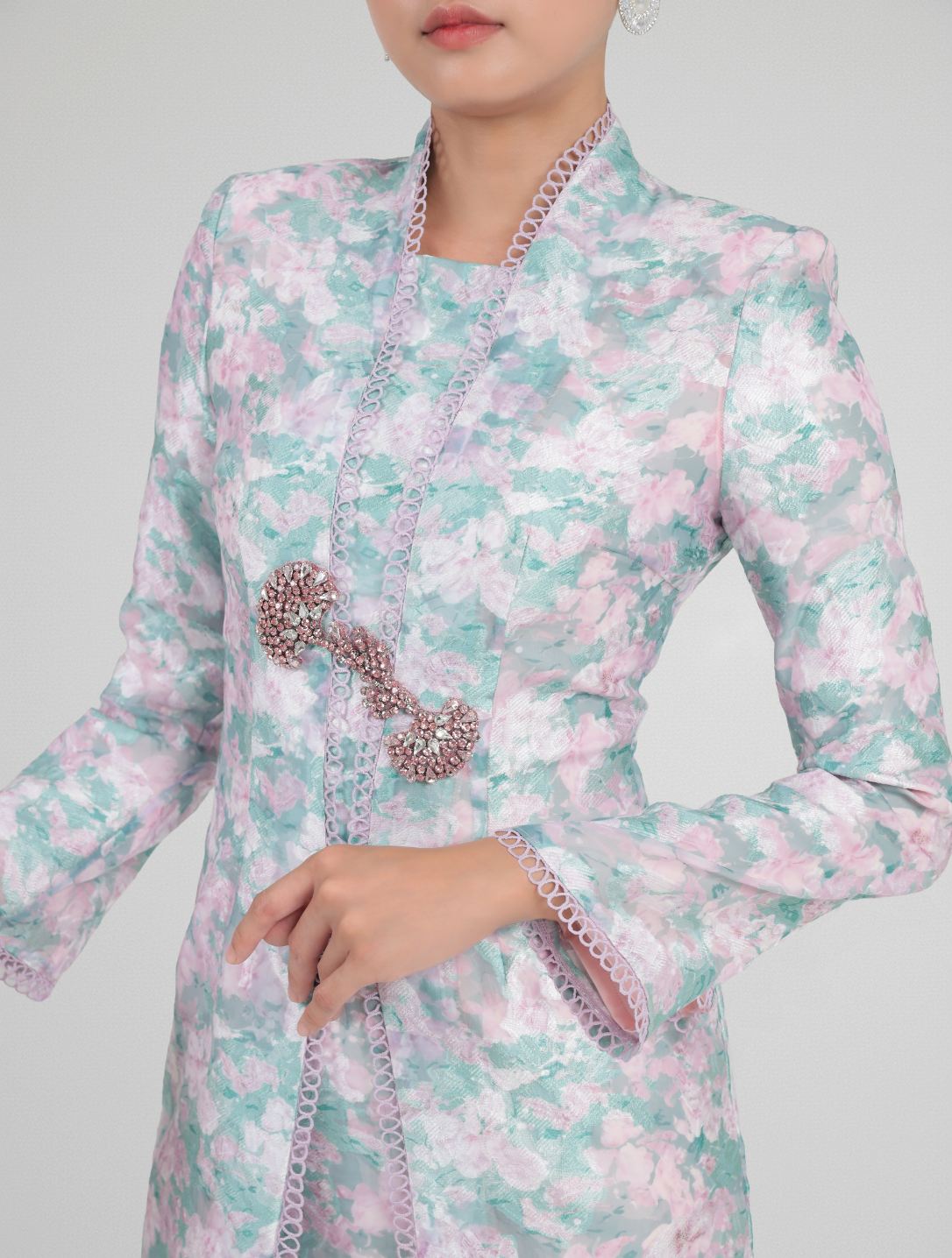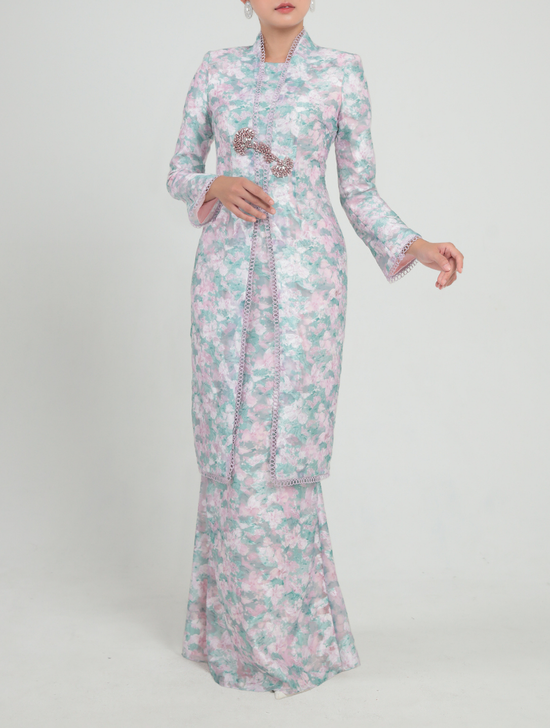 Faz, a modern interpretation of the Kutubaru long kebaya. Designed with a structured stand collar, fagotting lace detailing and relaxed long sleeves with subtle shoulder pads. Finished with floral beadwork at the waist and paired with a slim mermaid skirt featuring rear godet inserts. Fully lined for a refined, elegant fit.