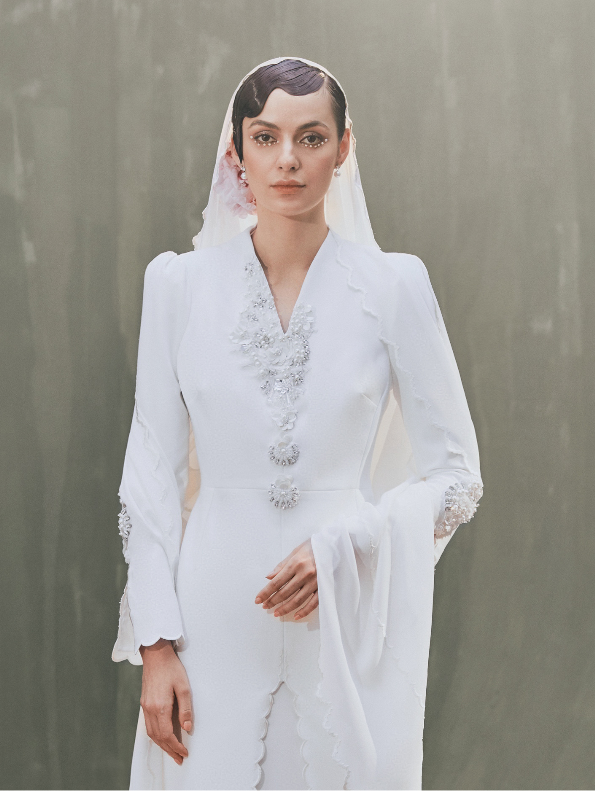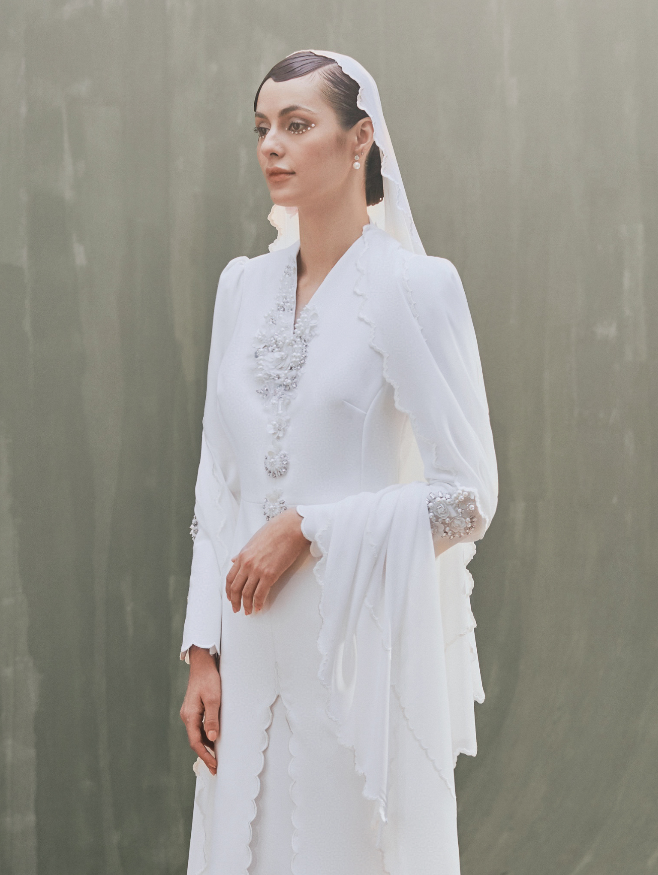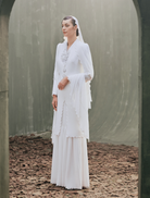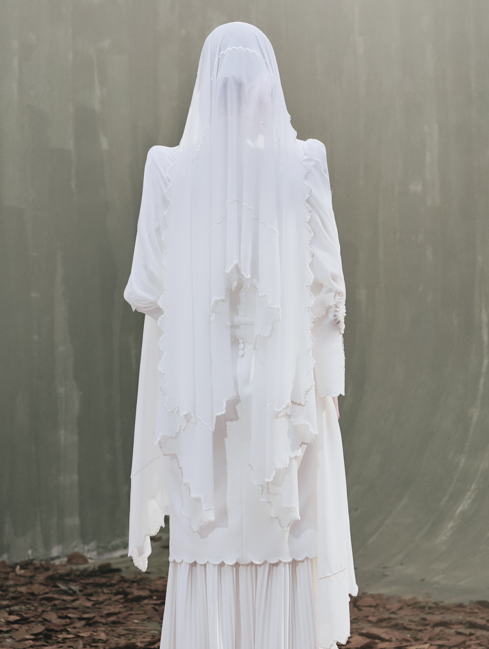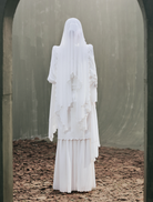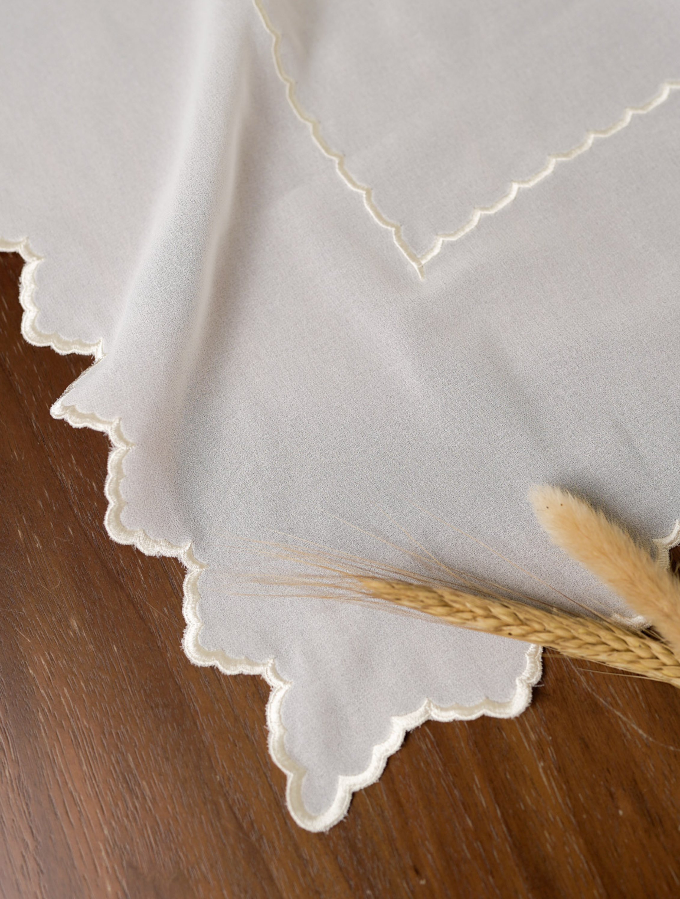 The Marie Chiffon Shawl is crafted from soft chiffon crepe, detailed with scalloped embroidery along the edges. Measuring 72 by 26 inches, it provides a refined finishing touch to any ensemble. Presented in elegant ivory white, it adds subtle grace and timeless appeal.