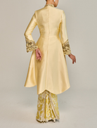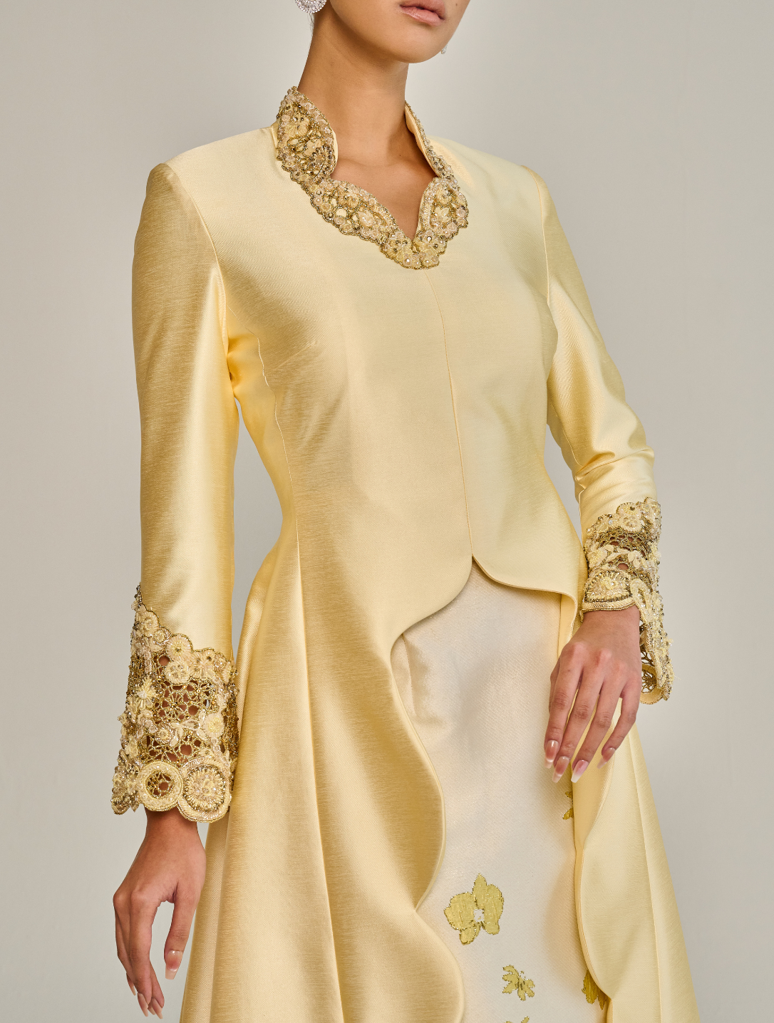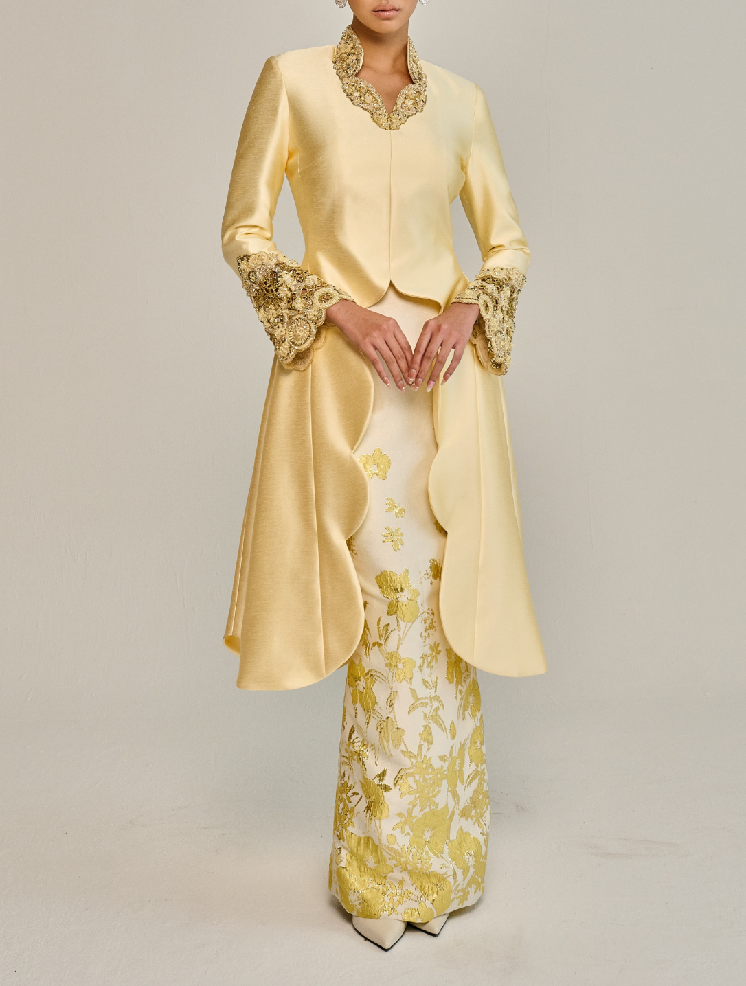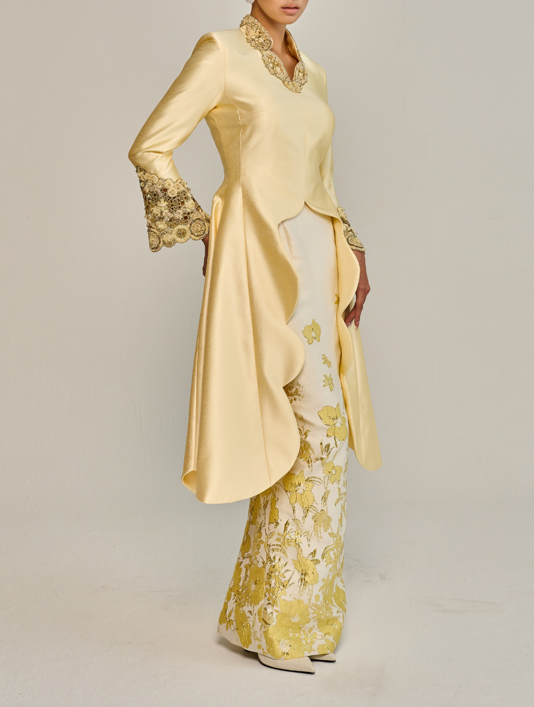 Mayang showcases a long kebaya with a scalloped high neckline and beaded detailing, complemented by bell sleeves for fluid movement. Fully lined, it is paired with a pencil skirt featuring a pleated back, creating an elongated and graceful profile.