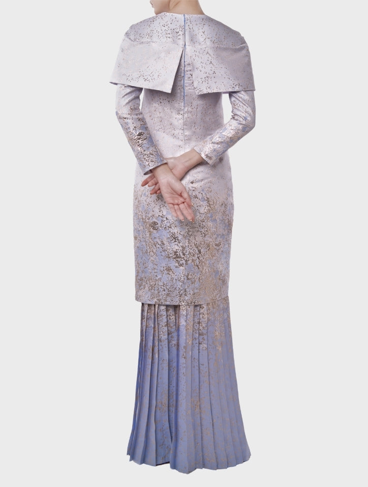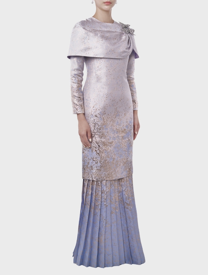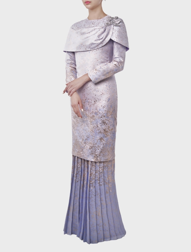 Maznun in Pastel Lilac is graceful and sophisticated, featuring a round neckline with a draped cape and a beaded bow embellishment. Long sleeves and a fitted silhouette enhance its timeless appeal, while a mermaid-cut skirt ensures fluid movement. Lined with silky satin and finished with a hidden back zip and hook fastening, it offers a seamless, polished look.