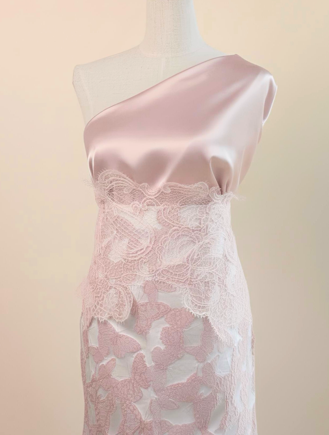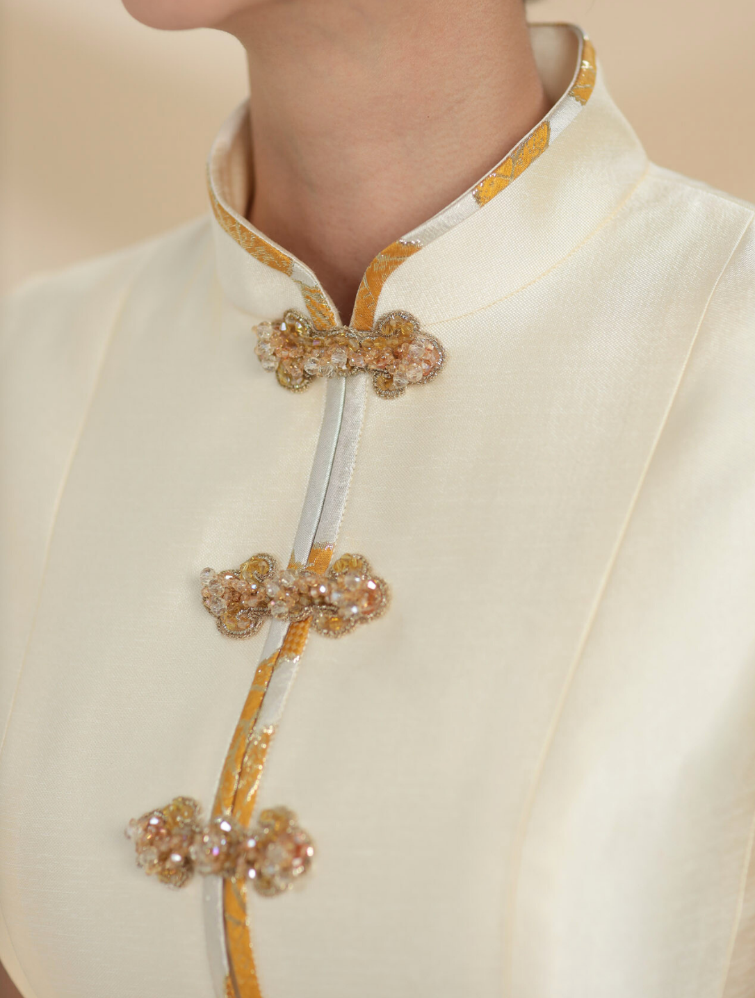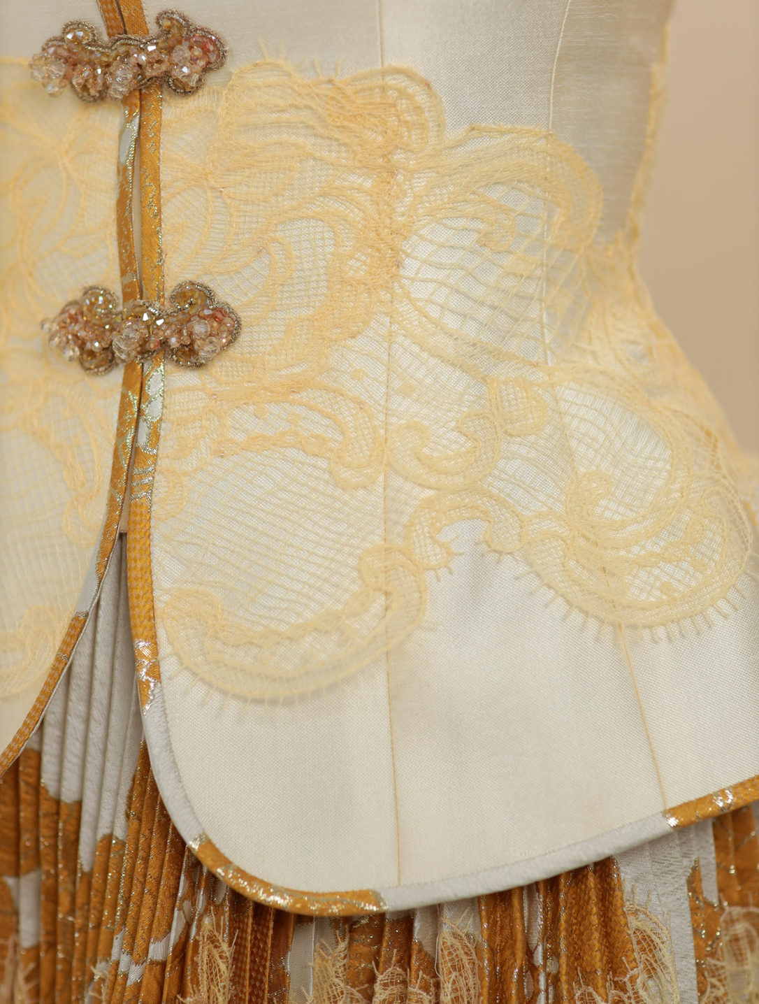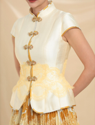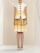 The Mei presents a Mandarin-collared sculpted peplum top with cap sleeves, piping finishes, and frog-button beading, fully lined for comfort. It pairs with a pleated above-knee skirt enhanced with lace patching and a fitted waistband, creating a light and graceful silhouette.
