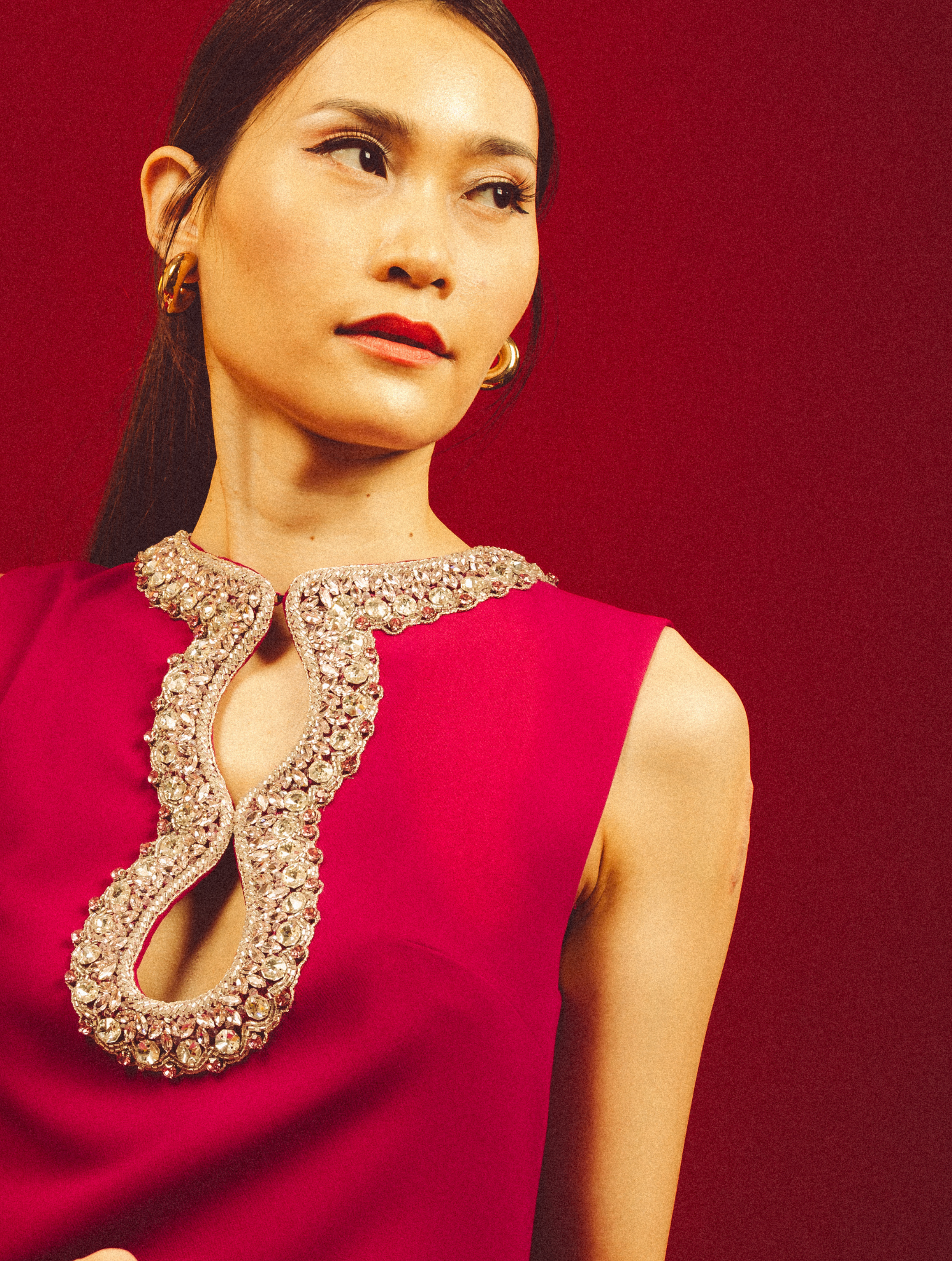 Mei-Mei in Fuchsia Pink is a micro dress crafted from a luxurious cotton polyblend for a smooth, polished finish. It features a round collar with intricate bead embellishments, a double teardrop neckline, and a back slit. Fully lined and finished with a hidden back zip and hook fastening, this non-stretchable dress offers a regular, sophisticated fit.