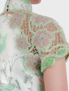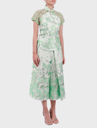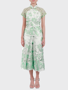 Exquisite craftsmanship meets contemporary elegance in the Mint Green Miao Lu ensemble. This sophisticated piece features intricate jacquard detailing with a traditional Mandarin collar and delicate frog fastening. The fully beaded cap sleeves adorn the fitted short top, complemented by silky satin lining and a discreet back zipper. The accompanying 3/4 culottes offer refined comfort with front pleats, an elastic waistband, and convenient side pockets. The refreshing mint hue symbolizes grace and renewal, artfully merging heritage techniques with modern design sensibilities.