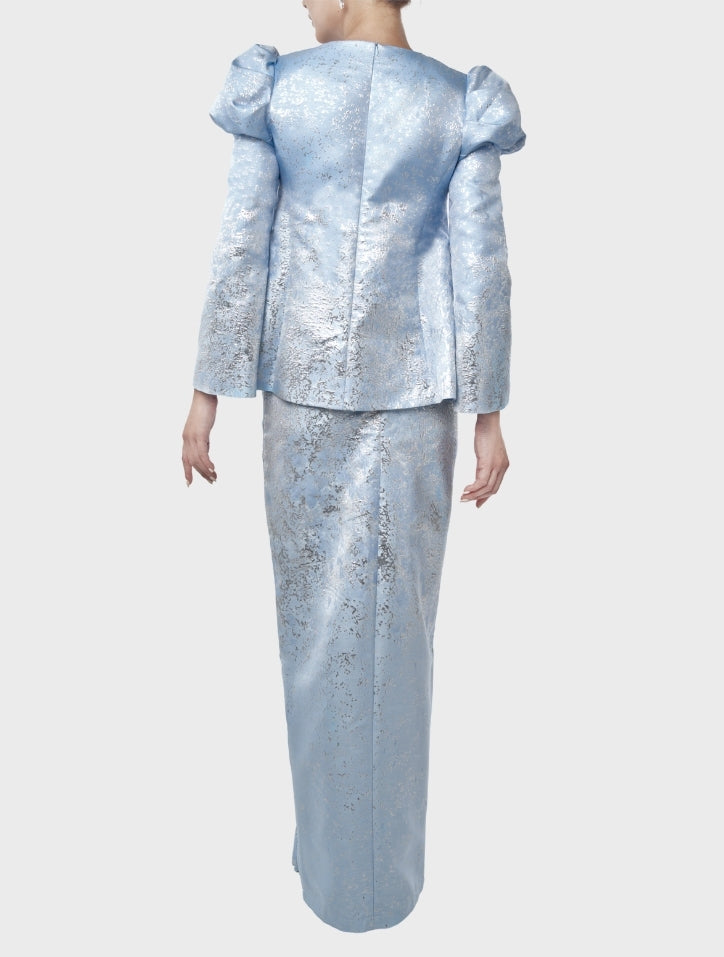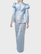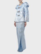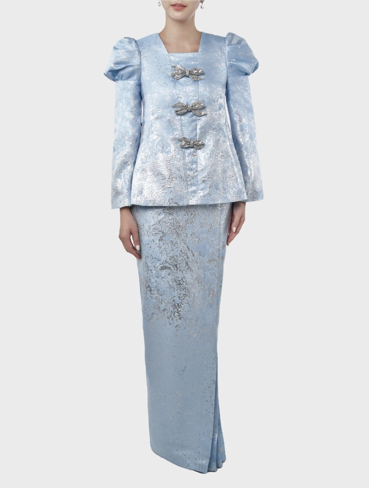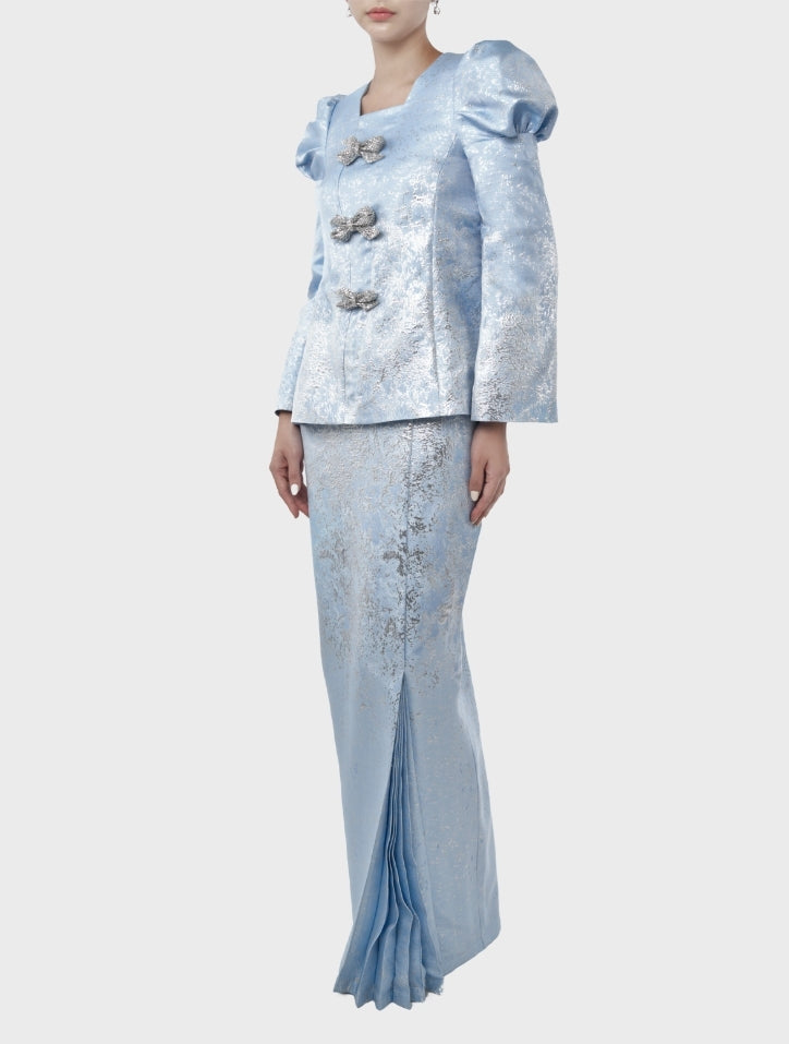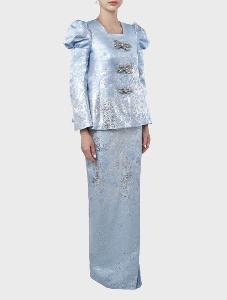 Nadia in Baby Blue is elegant with a touch of tradition, featuring a Kutubaru neckline with a beaded bow embellishment. Puff shoulder sleeves add volume, while the loose fit ensures comfort. Paired with a side-pleated pencil-cut skirt, and lined with silky satin, it is finished with a hidden back zip and hook fastening for a seamless, sophisticated look.