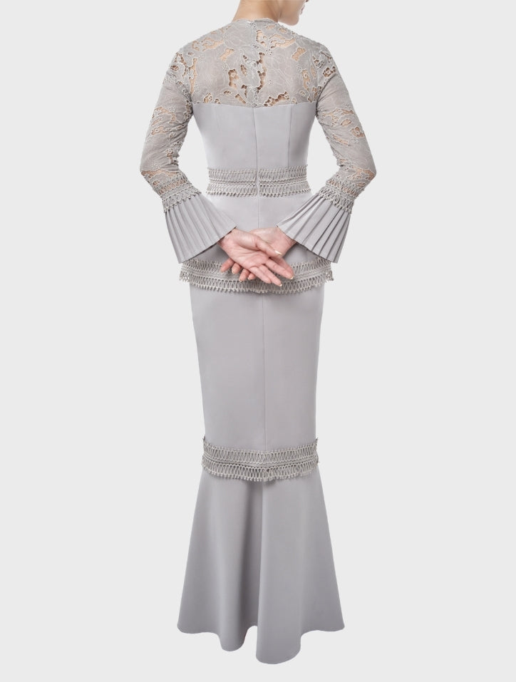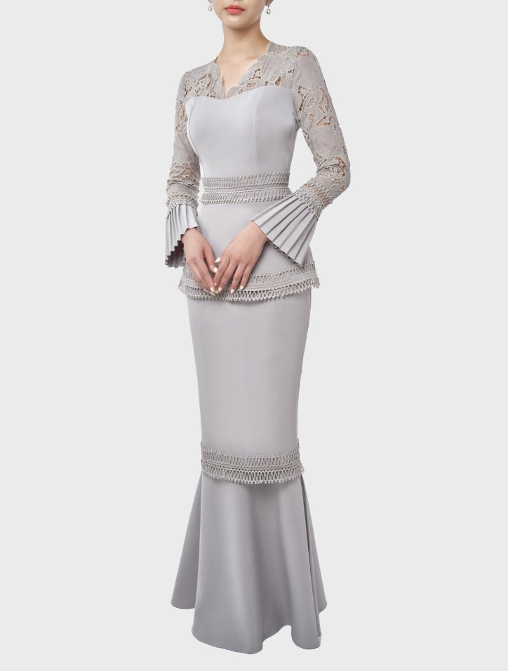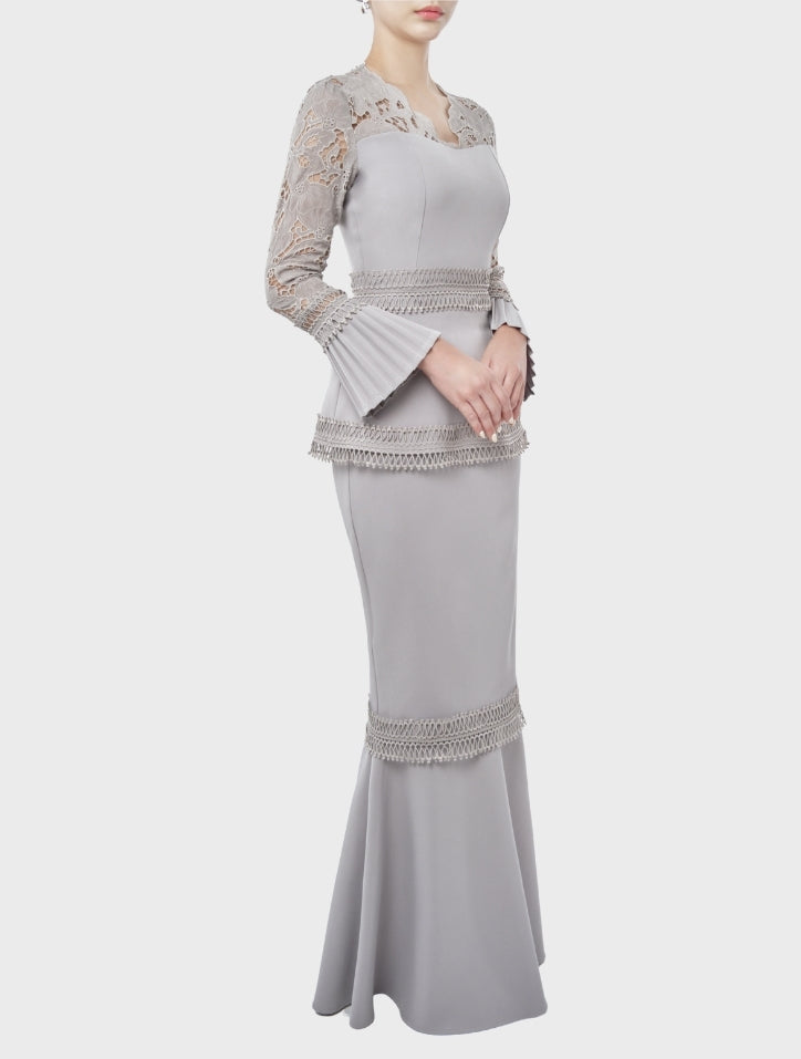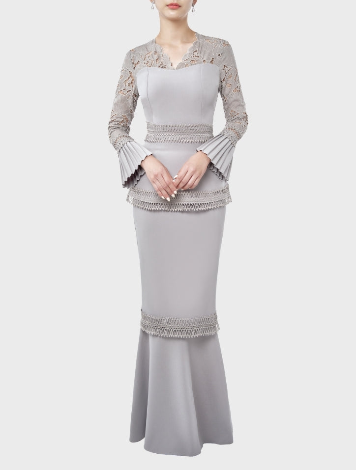 Nana Ash Grey is elegant and timeless, featuring a V-neckline with delicate fagotting lace at the waist. Full embroidery lace on the upper bust and 3/4 pleated sleeves adds intricate charm, while a tiered mermaid-cut skirt creates graceful movement. Unlined and finished with a hidden back zip and hook fastening, it offers a seamless, refined finish.