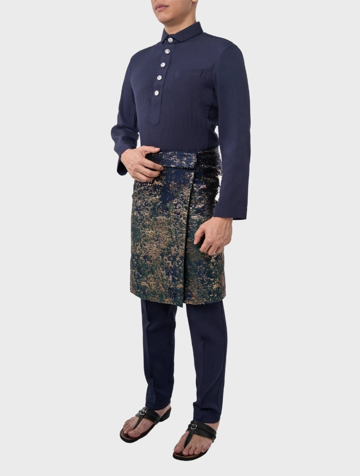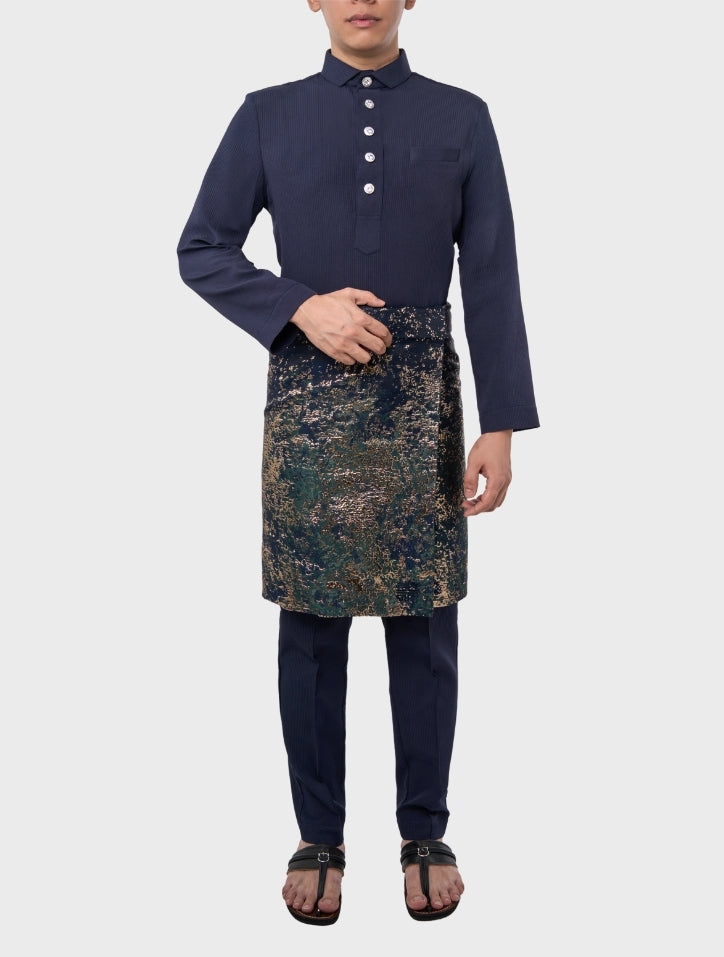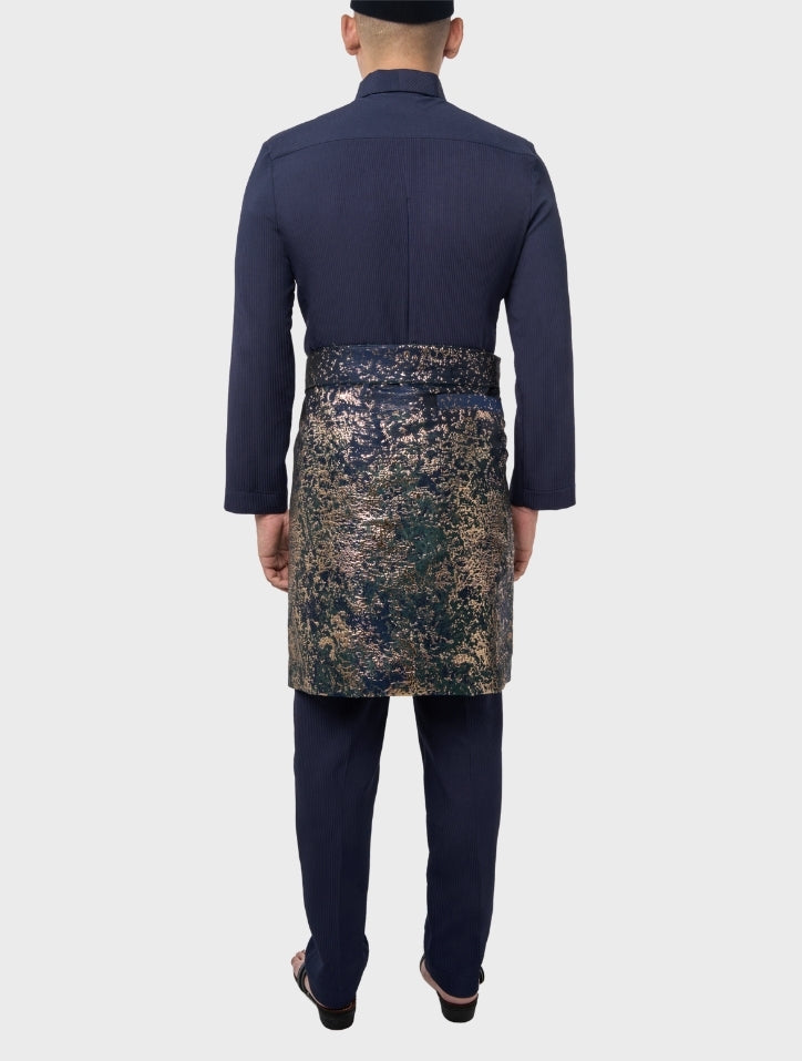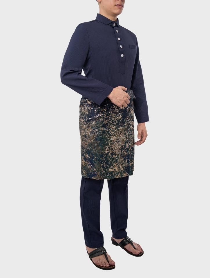 Nazim in Denim Blue Baju Melayu set is crafted from textured pinstriped polyblend cotton, offering breathability and comfort while maintaining a structured, regular-fit silhouette. Featuring a spread collar Cekak Musang neckline with five-buttonhole fastening and a hidden chest pocket, it blends classic tailoring with contemporary ease.