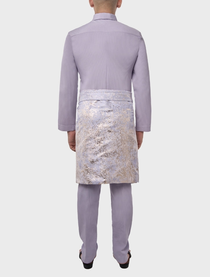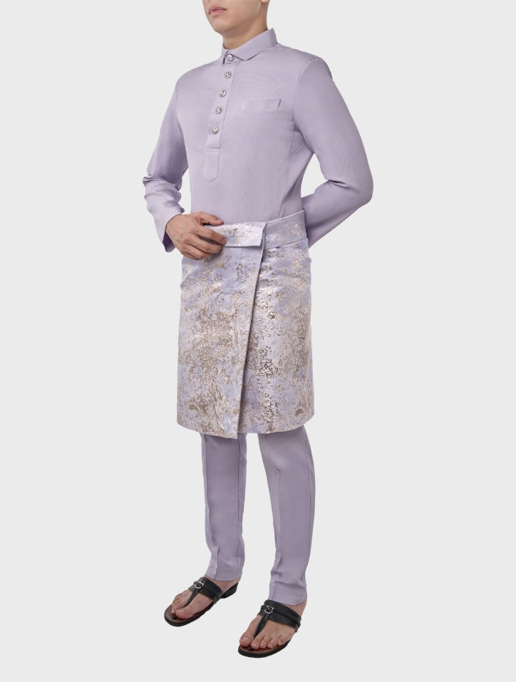 Nazim in Pastel Lilac Baju Melayu set is crafted from textured pinstriped polyblend cotton, offering breathability and comfort while maintaining a structured, regular-fit silhouette. Featuring a spread collar Cekak Musang neckline with five-buttonhole fastening and a hidden chest pocket, it blends classic tailoring with contemporary ease.