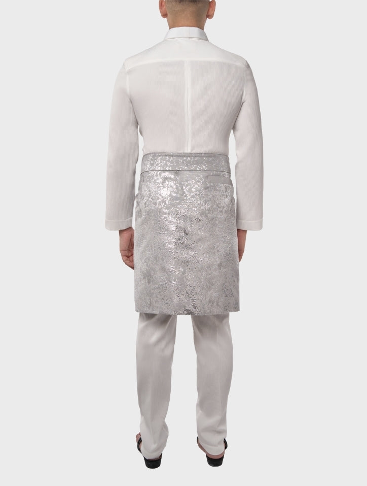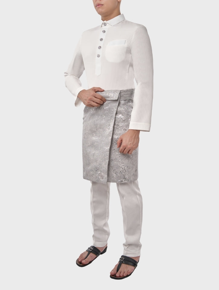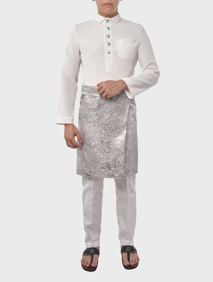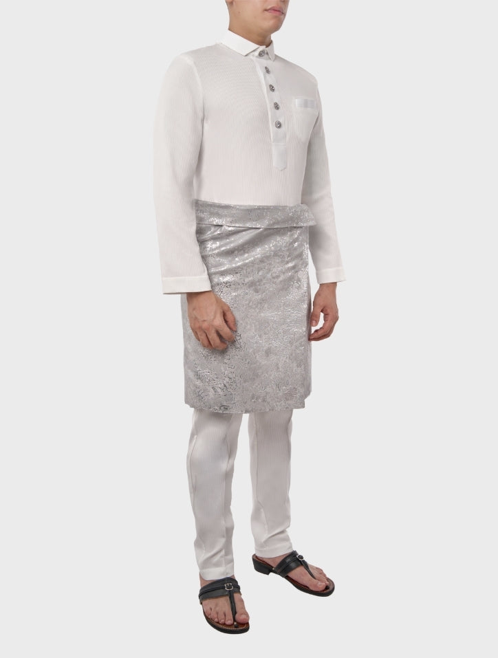 Nazim in Off White Baju Melayu set is crafted from textured pinstriped polyblend cotton, offering breathability and comfort while maintaining a structured, regular-fit silhouette. Featuring a spread collar Cekak Musang neckline with five-buttonhole fastening and a hidden chest pocket, it blends classic tailoring with contemporary ease.