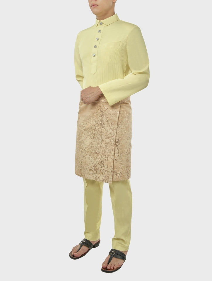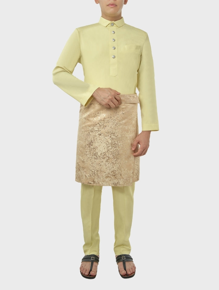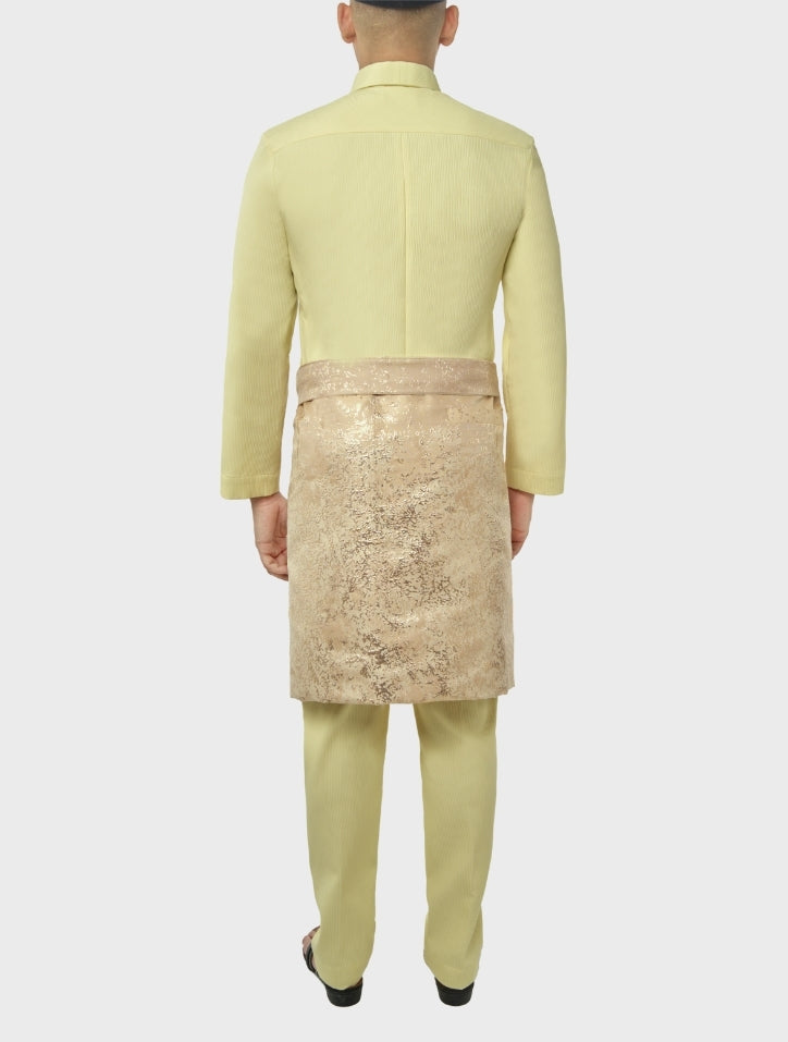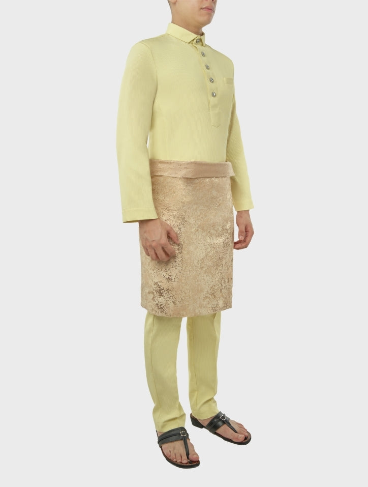 Nazim in Pastel Yellow Baju Melayu set is crafted from textured pinstriped polyblend cotton, offering breathability and comfort while maintaining a structured, regular-fit silhouette. Featuring a spread collar Cekak Musang neckline with five-buttonhole fastening and a hidden chest pocket, it blends classic tailoring with contemporary ease.