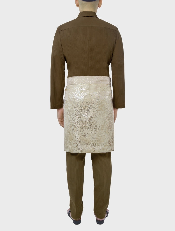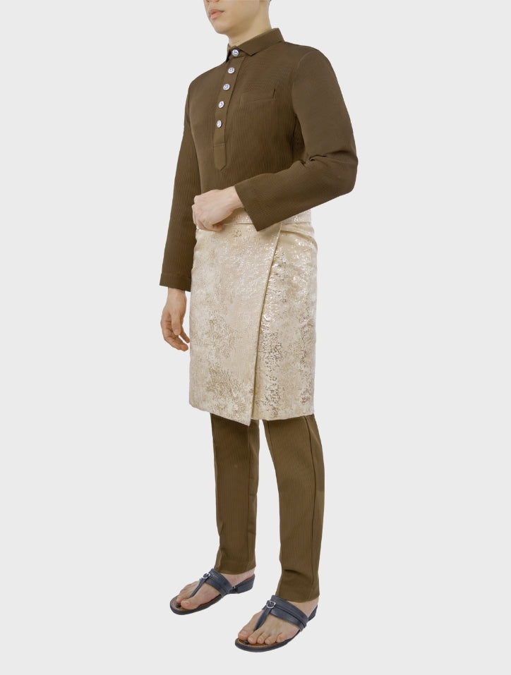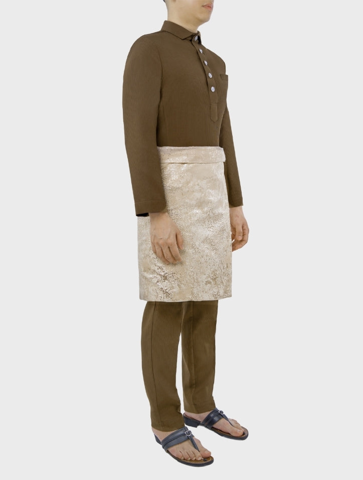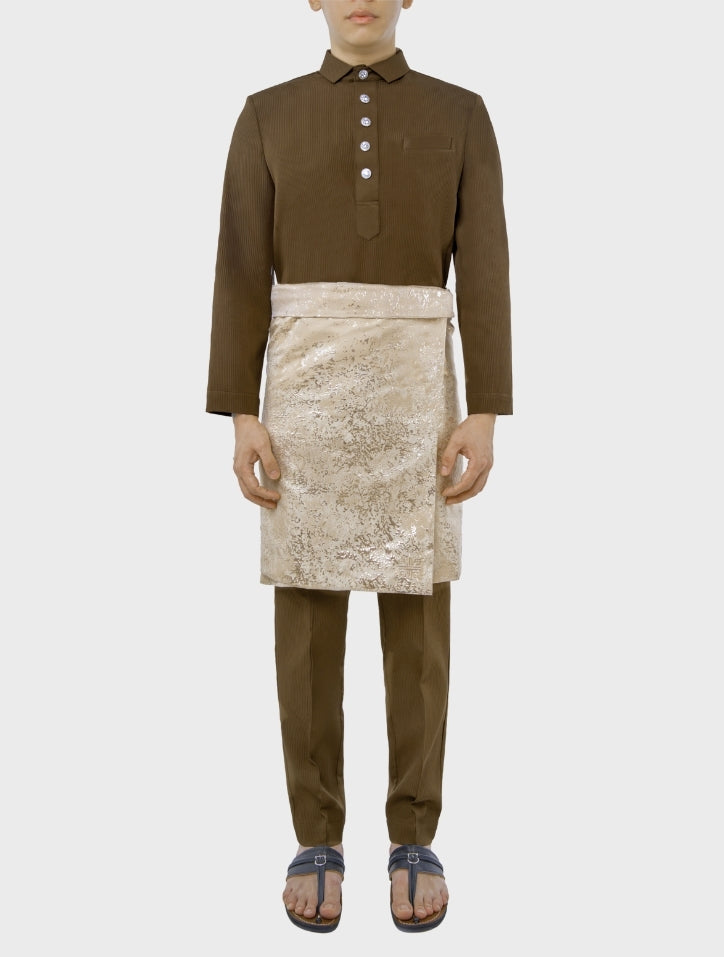 Nazim in Walnut Brown Baju Melayu set is crafted from textured pinstriped polyblend cotton, offering breathability and comfort while maintaining a structured, regular-fit silhouette. Featuring a spread collar Cekak Musang neckline with five-buttonhole fastening and a hidden chest pocket, it blends classic tailoring with contemporary ease.