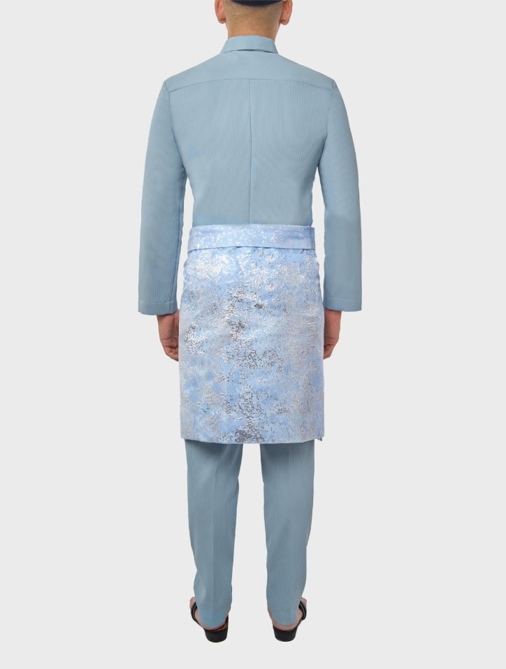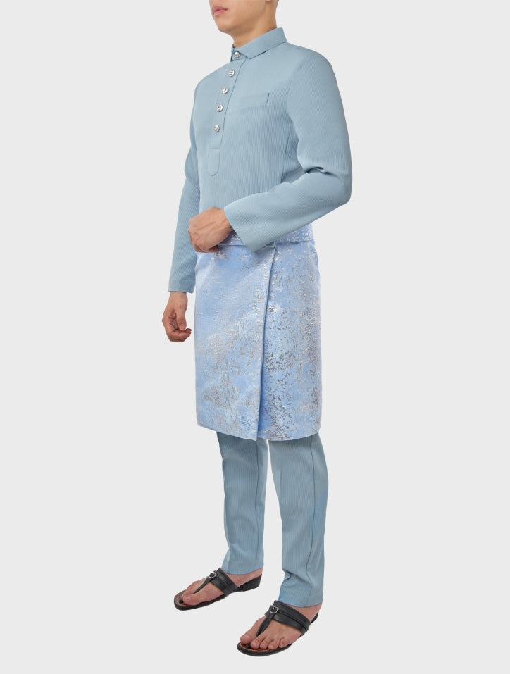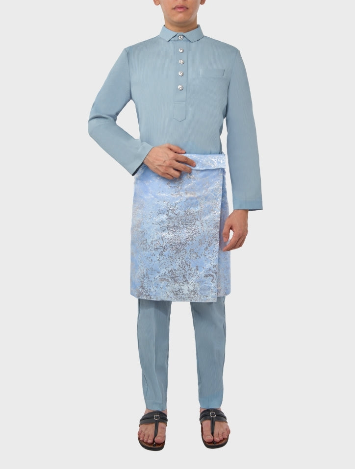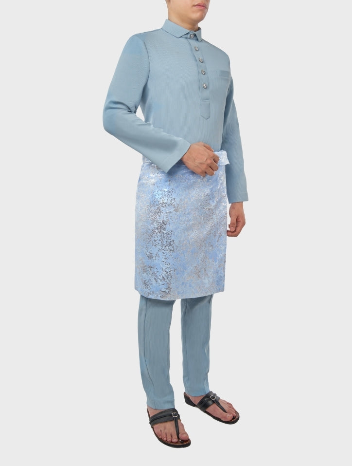 Nazim in Sky Blue Baju Melayu set is crafted from textured pinstriped polyblend cotton, offering breathability and comfort while maintaining a structured, regular-fit silhouette. Featuring a spread collar Cekak Musang neckline with five-buttonhole fastening and a hidden chest pocket, it blends classic tailoring with contemporary ease.