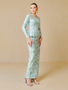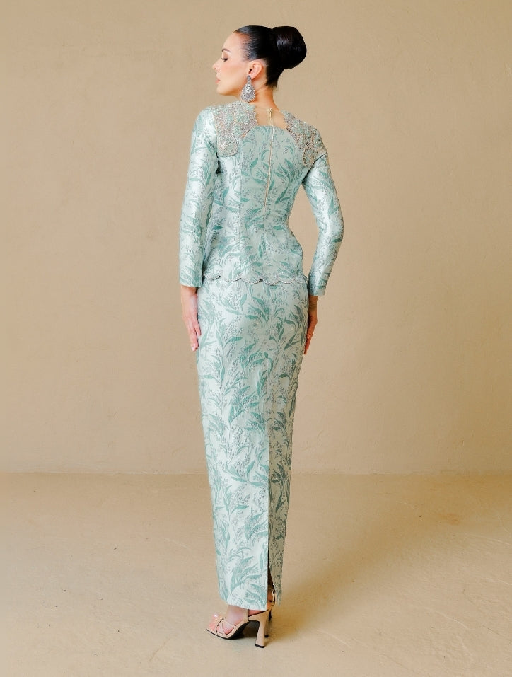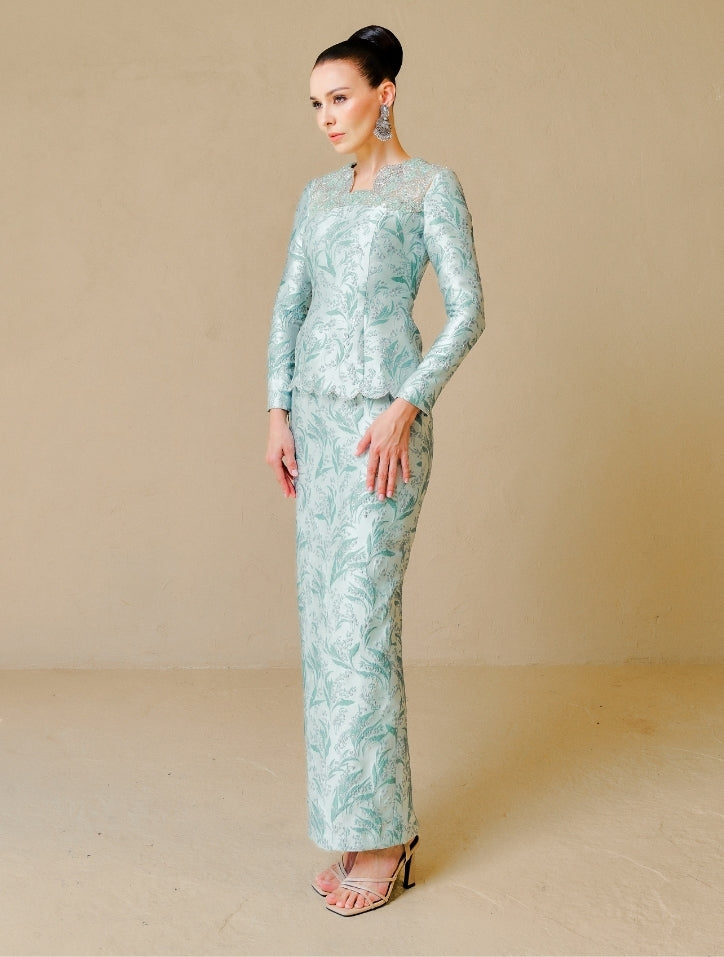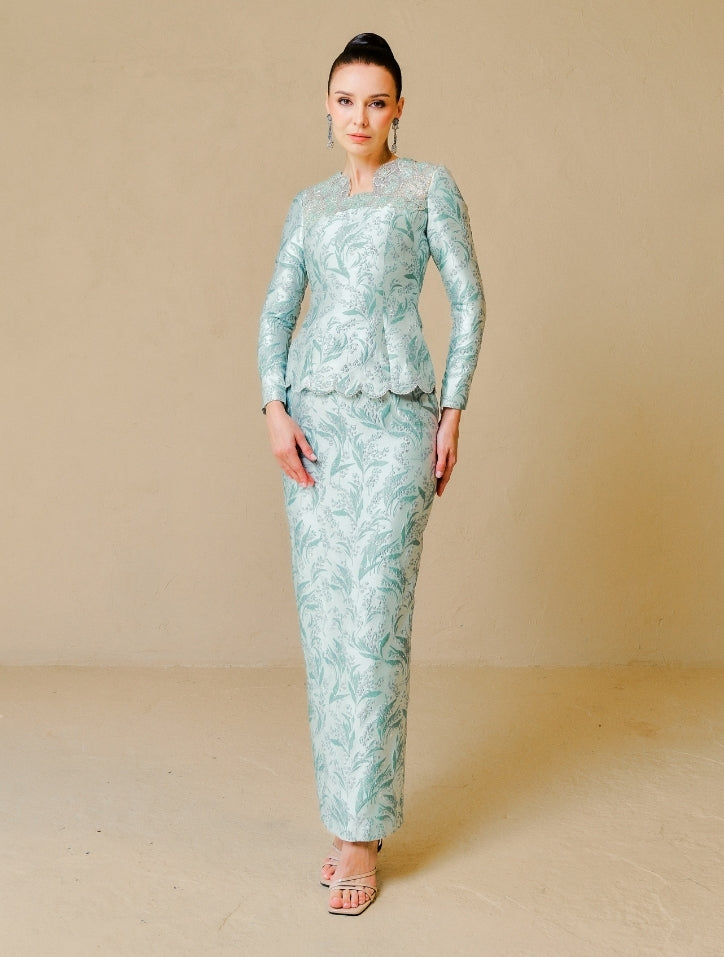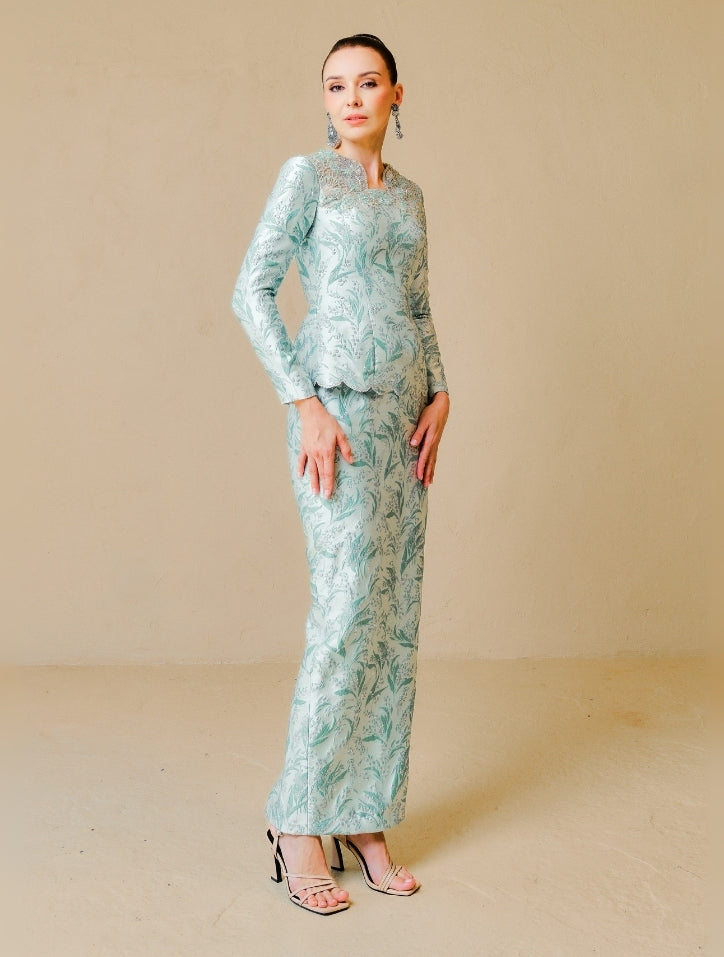 Nazrina is crafted from luxurious fabric adorned with intricate tambour beadwork on the shoulder panel and scallop embroidery along the hemline. The material is lined with smooth silk satin, offering comfort and a refined, elegant finish. Completed with a pencil-cut skirt, this piece exudes timeless elegance with artisanal detailing.