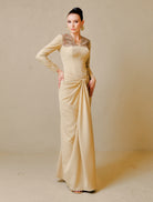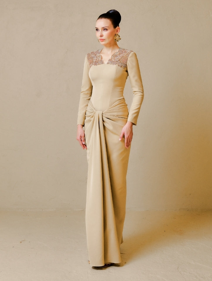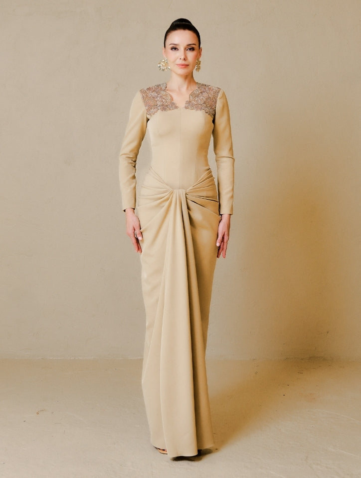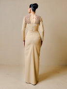 Ezurin is crafted from luxurious fabric adorned with intricate tambour beadwork on the shoulder panel. The material features a structured yet feminine drape and a smooth silk satin lining, offering comfort and a refined finish. Completed with a saree-style pencil-cut skirt, this design blends tradition with modern elegance.