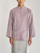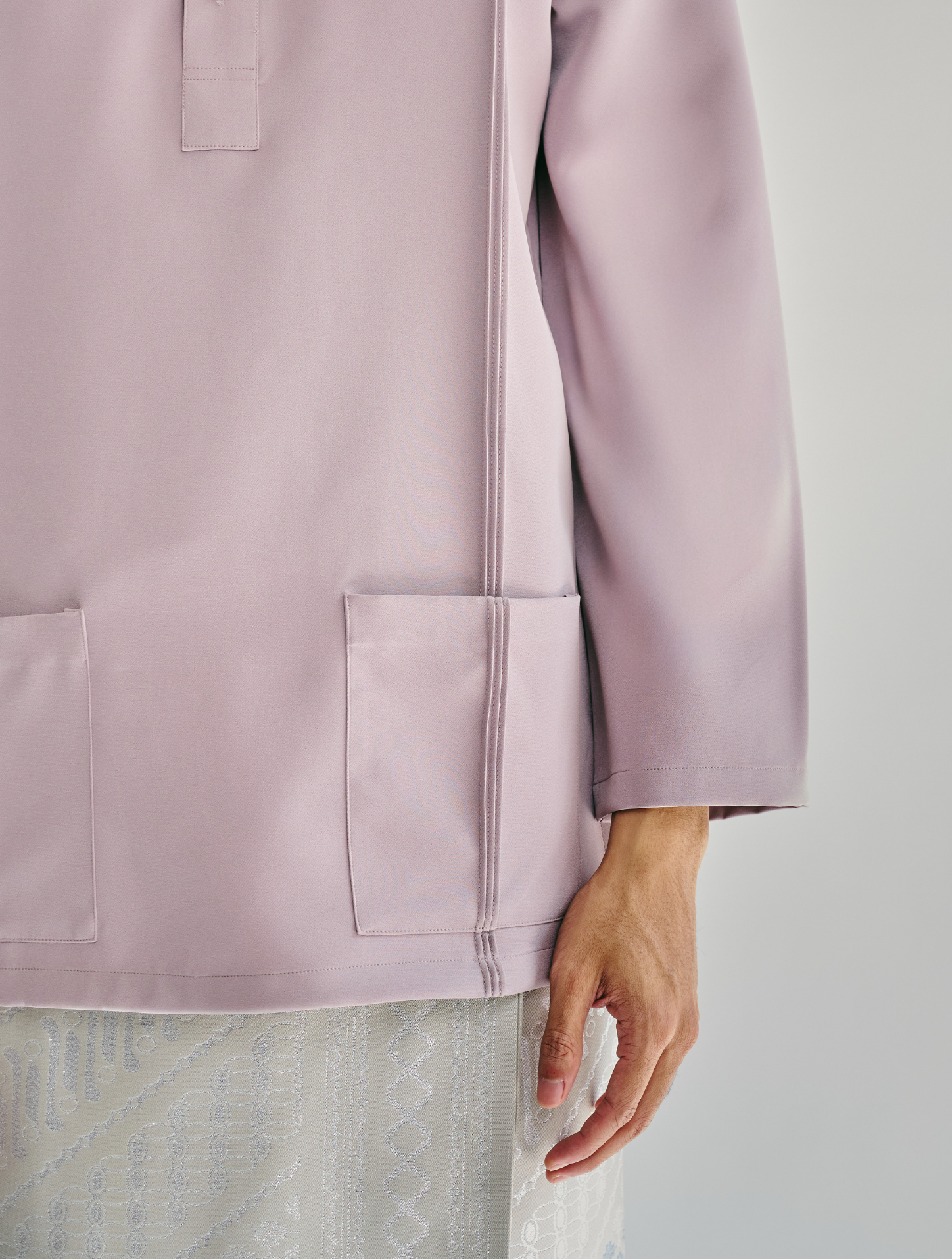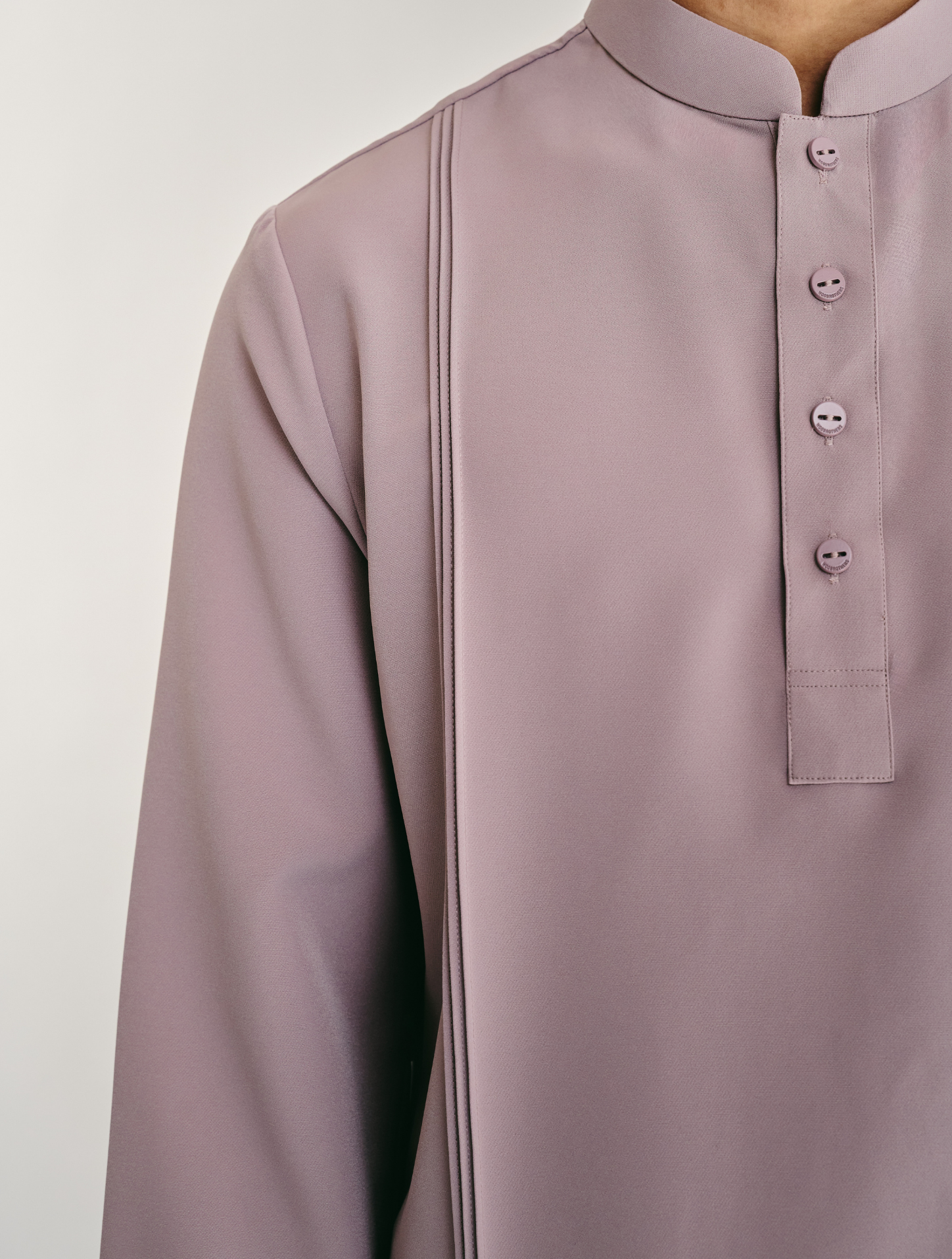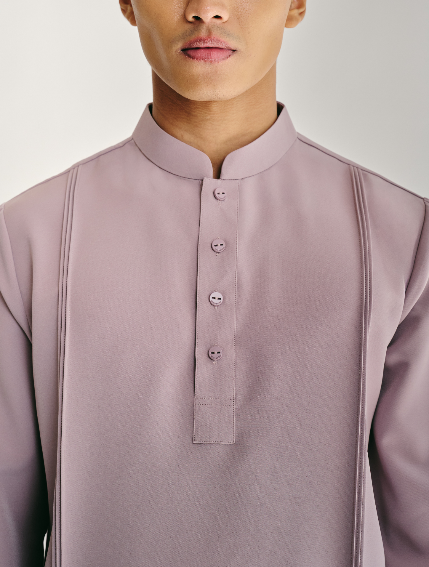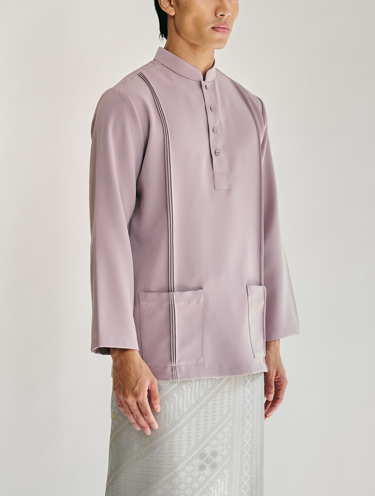 Nehru, a modern interpretation of the classic Cekak Musang. Designed with a structured collar and button fastening, paired with long sleeves for a clean, timeless look. Features two functional patch pockets with pintuck detailing and side slits, finished with subtle logo embroidery at the back yoke. Cut in a regular fit and unlined for lightweight, breathable wear.