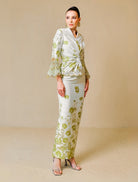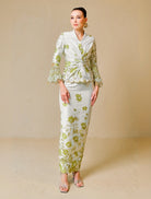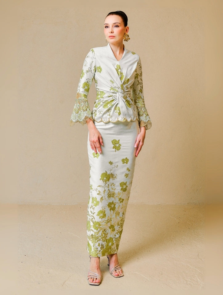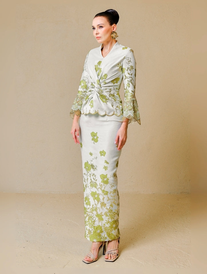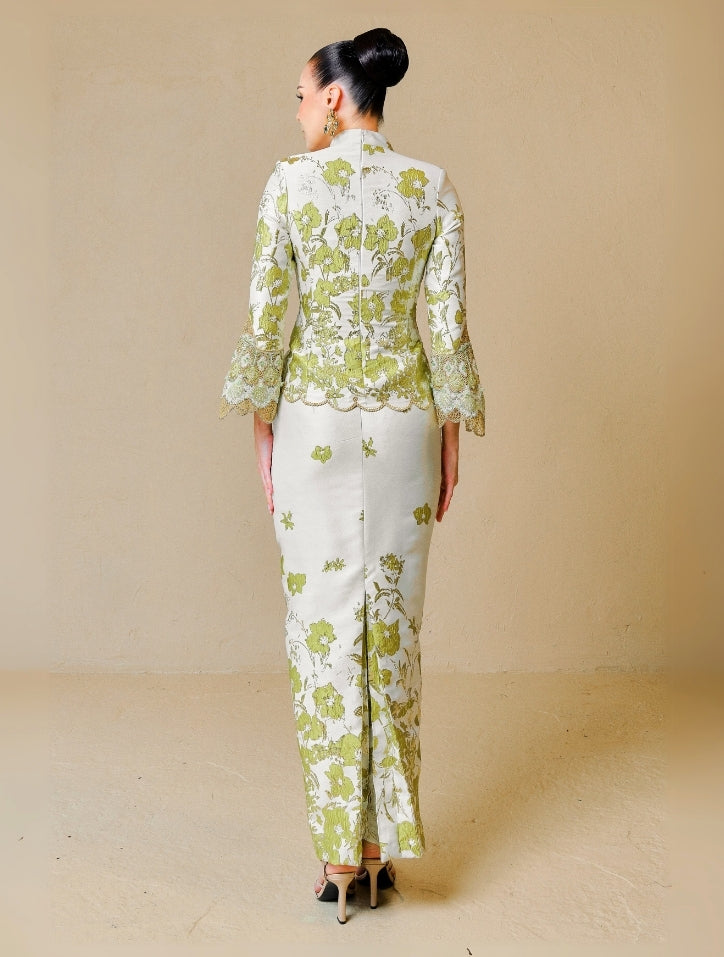 Noraini is crafted from luxurious fabric adorned with intricate tambour beadwork on the sleeves and delicate scallop embroidery along the hemline. The material features elegant draping and a smooth silk satin lining, offering both comfort and refined sophistication. Completed with a pencil-cut skirt, this ensemble embodies timeless elegance with intricate detailing.