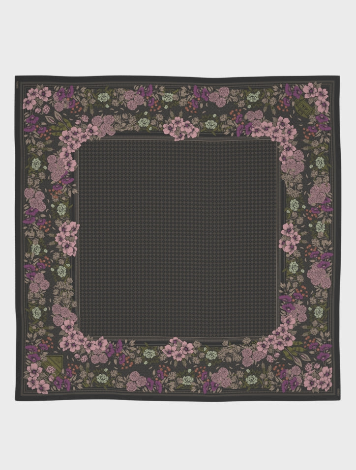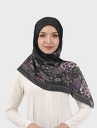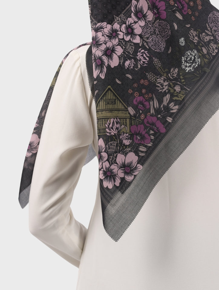 Melur scarf features a 45-inch square design with an elegant square floral motif composition inspired by nostalgic heritage. Finished with laser-cut edges for a seamless drape, it embodies sophistication and tradition. Each scarf comes beautifully packaged with a custom scarf pin and dust bag making it a timeless keepsake or a thoughtful gift.