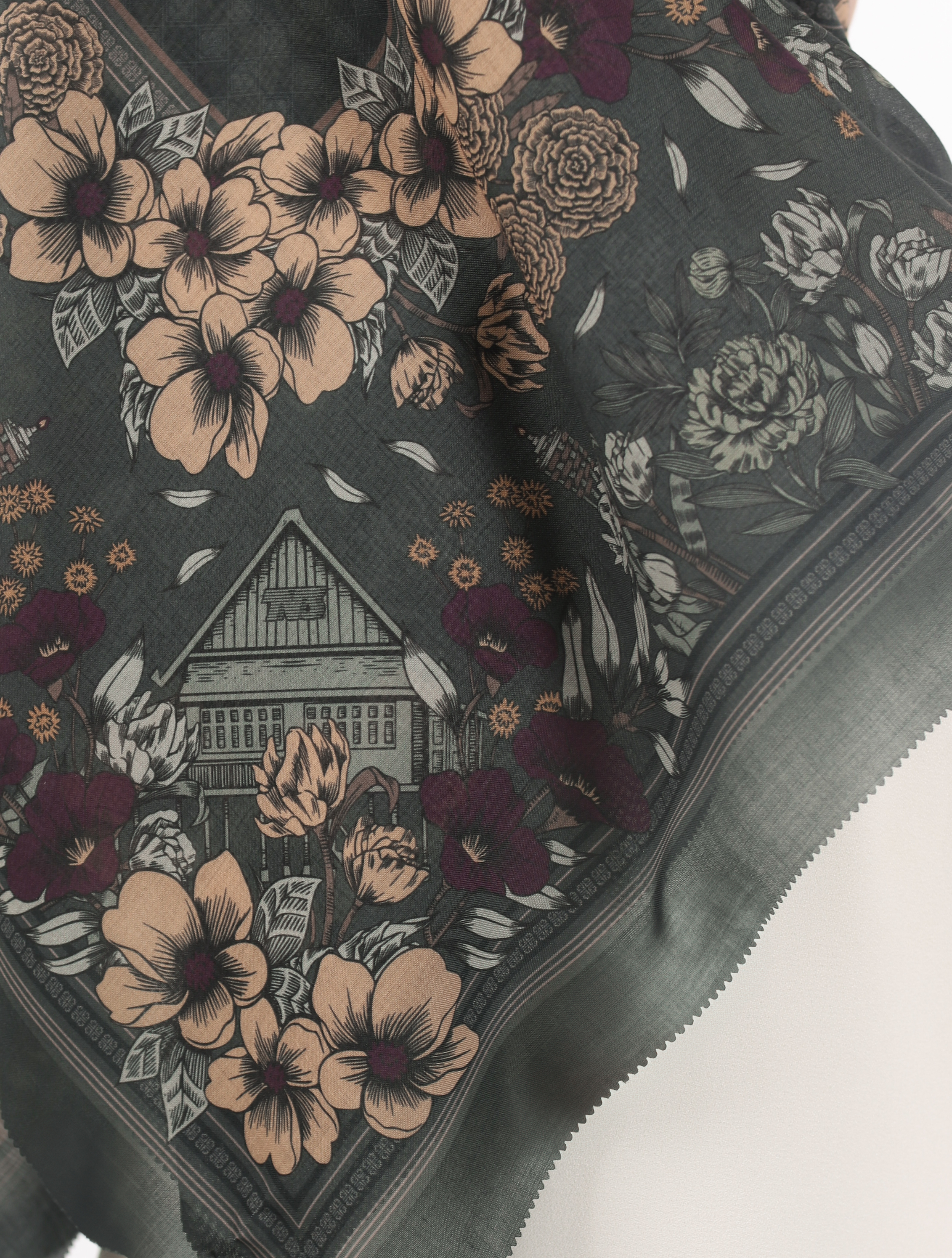 Mawar scarf features a 45-inch square design with an elegant circular floral motif composition inspired by nostalgic heritage. Finished with laser-cut edges for a seamless drape, it embodies sophistication and tradition. Each scarf comes beautifully packaged with a custom scarf pin and dust bag making it a timeless keepsake or a thoughtful gift.