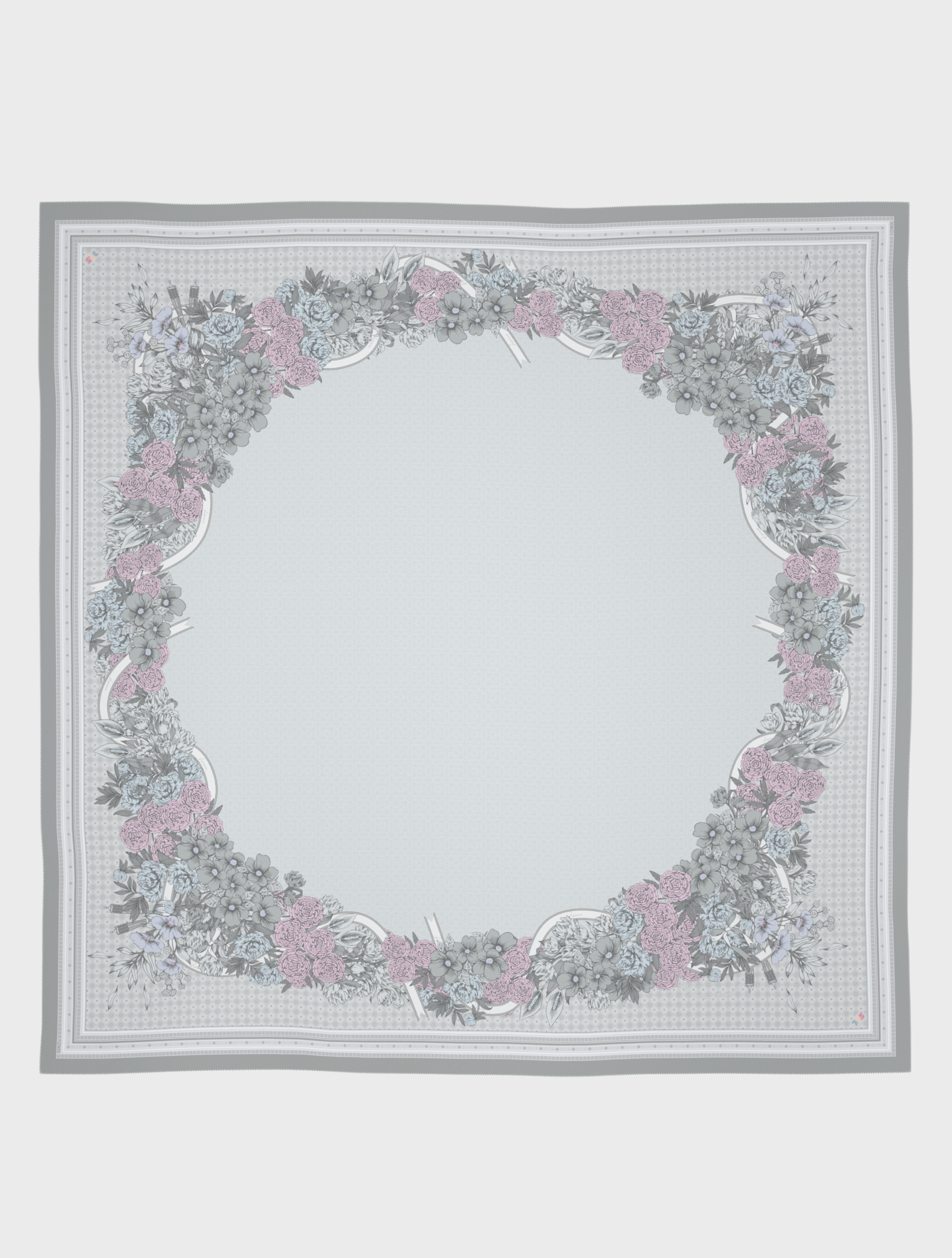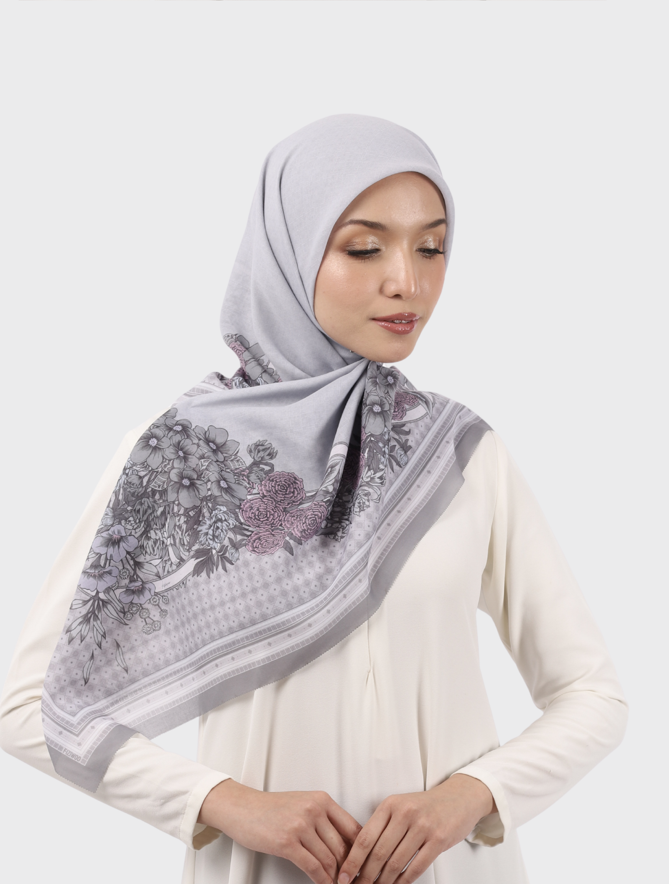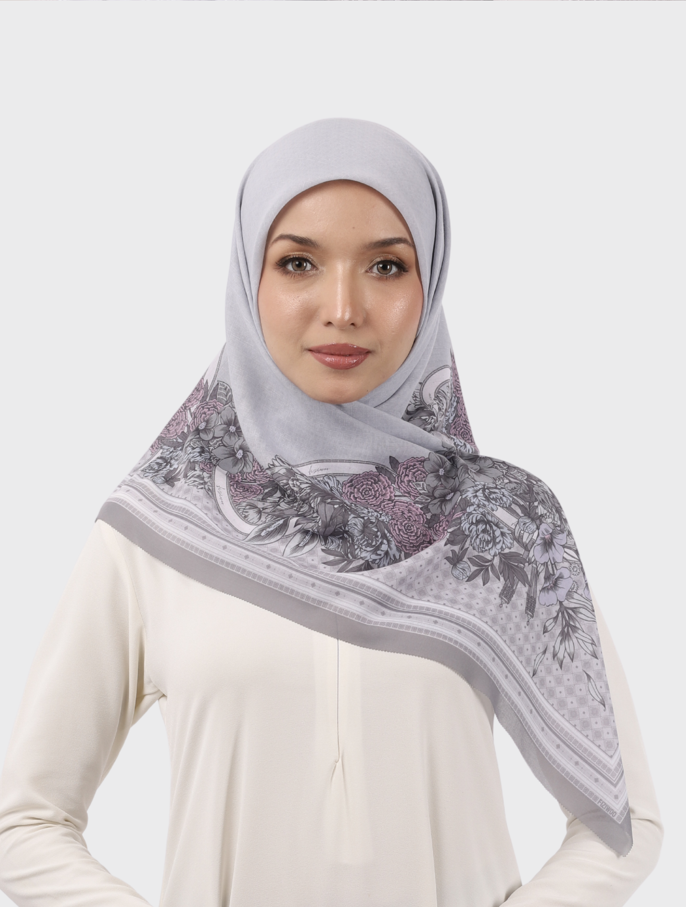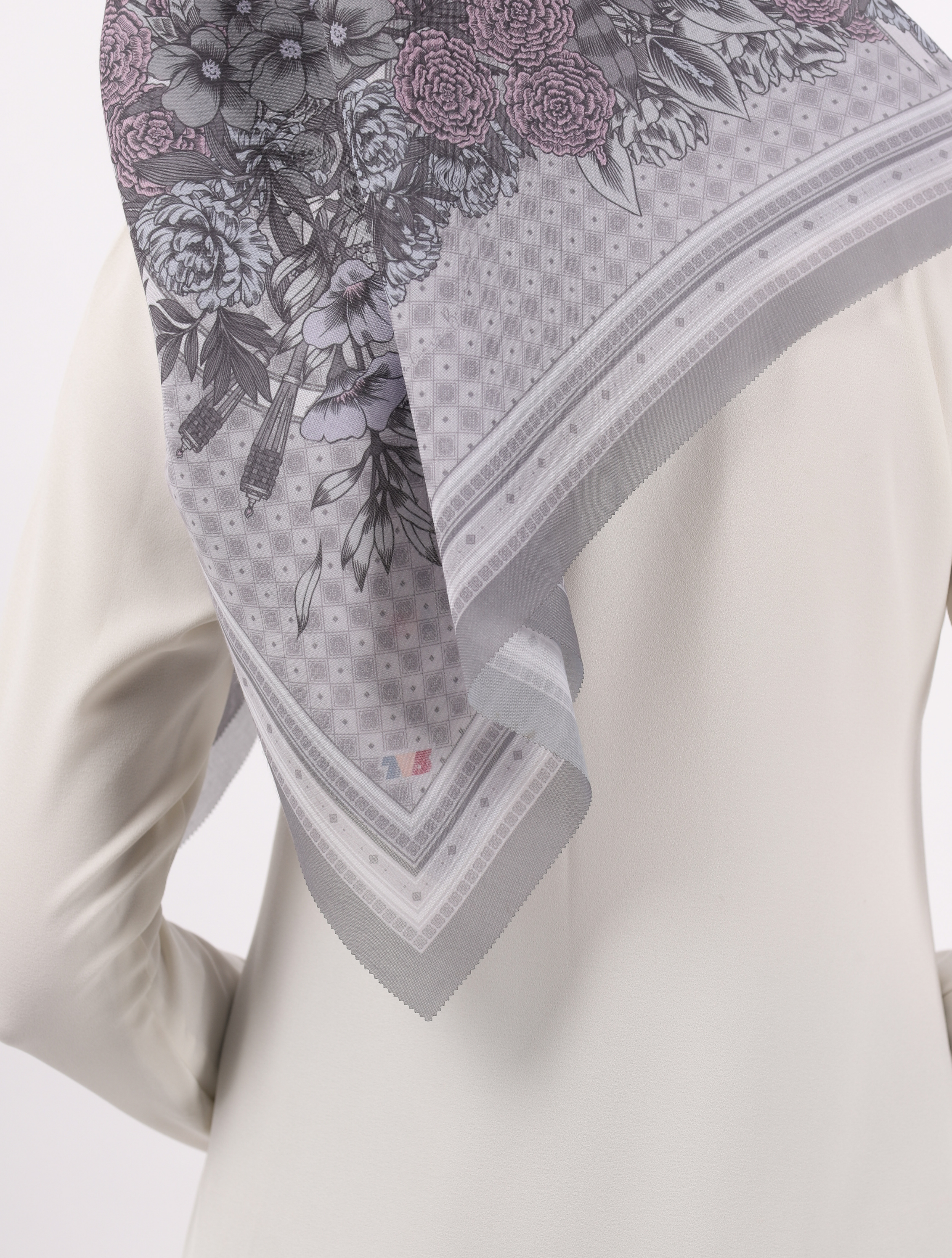 Mawar scarf features a 45-inch square design with an elegant circular floral motif composition inspired by nostalgic heritage. Finished with laser-cut edges for a seamless drape, it embodies sophistication and tradition. Each scarf comes beautifully packaged with a custom scarf pin and dust bag making it a timeless keepsake or a thoughtful gift.