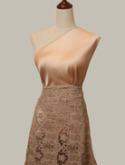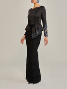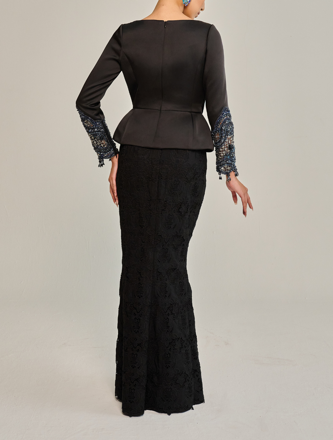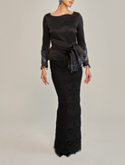 Purnama presents an asymmetrical neckline top with layered draping and refined beadwork, finished with slim sleeves and full lining. It is paired with a slim mermaid skirt that elongates the form, creating a sleek and elegant evening silhouette.