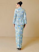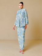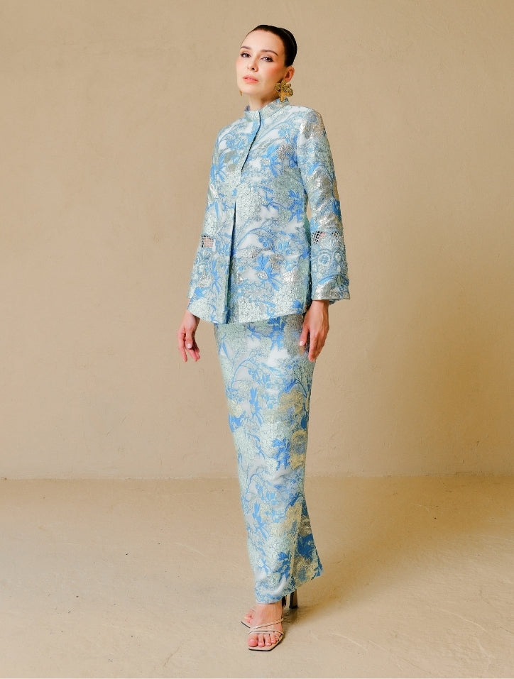 Rohaiza in Light Blue is crafted from luxurious fabric fully adorned with intricate tambour beadwork on the sleeve panels. The material features a soft, fluid drape and a smooth silk satin lining, offering both comfort and refined elegance. Completed with a pencil-cut skirt, this design balances tradition with modern sophistication.