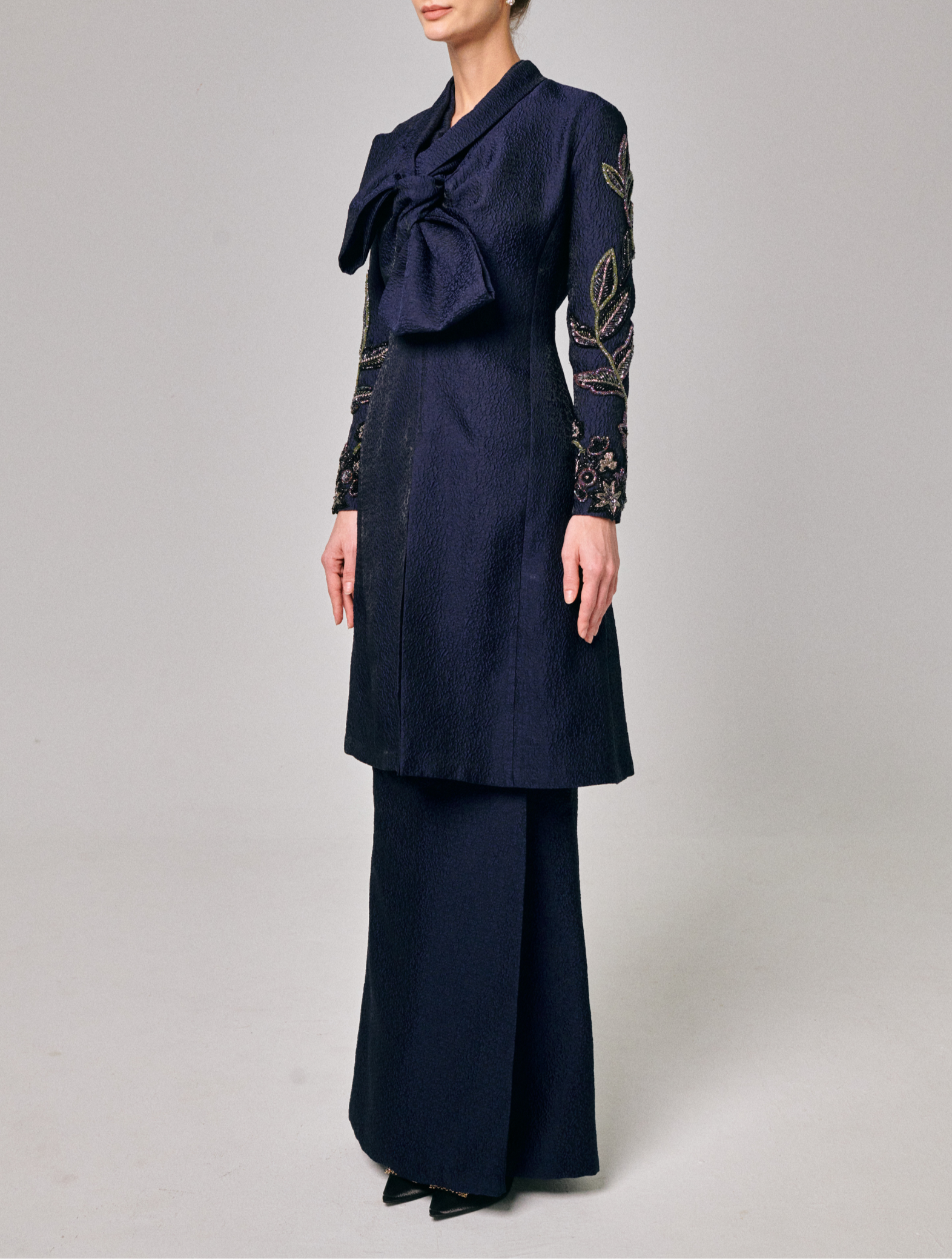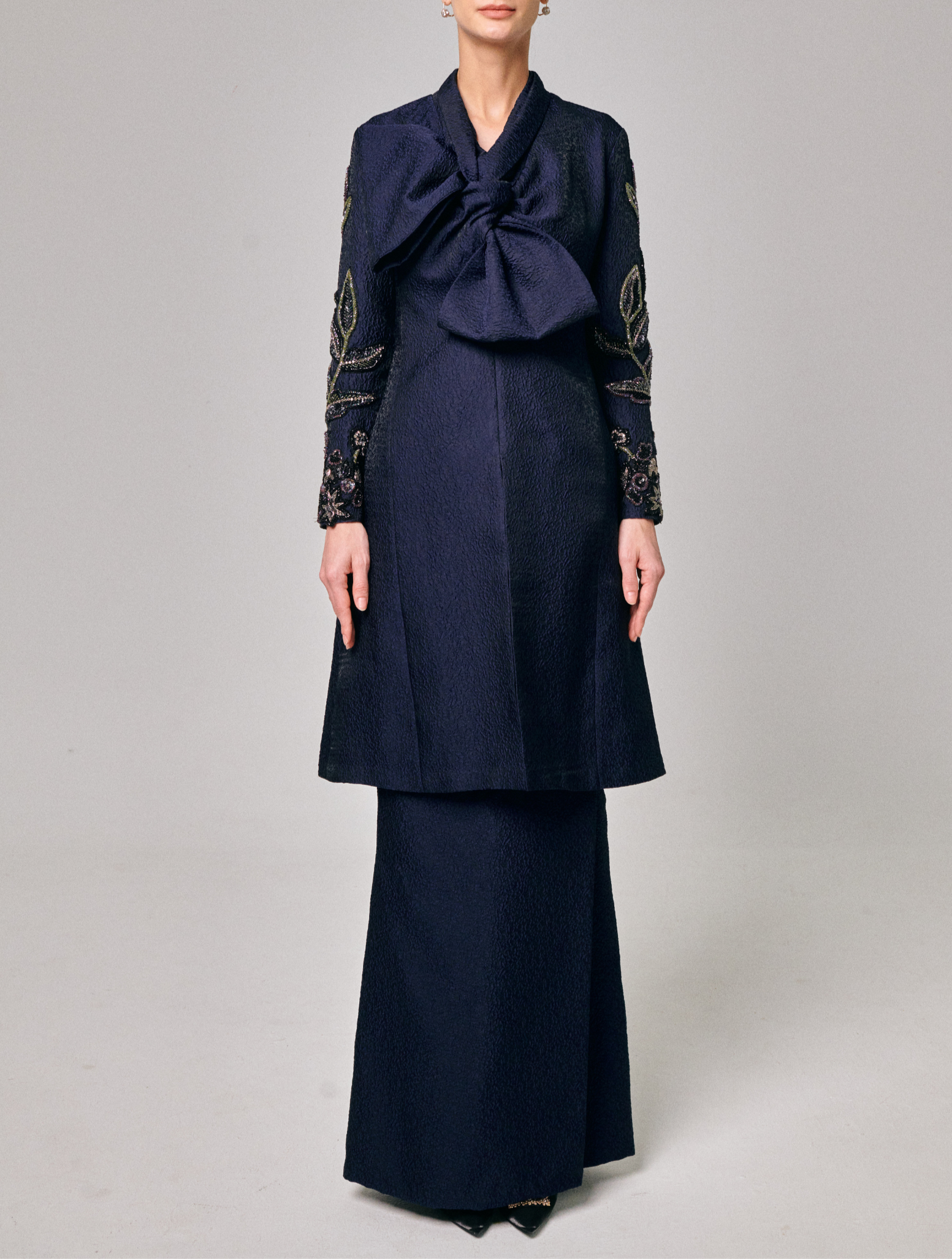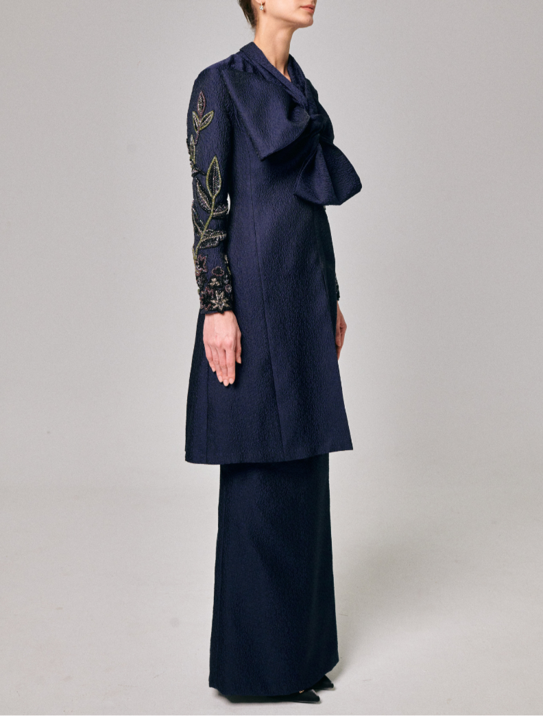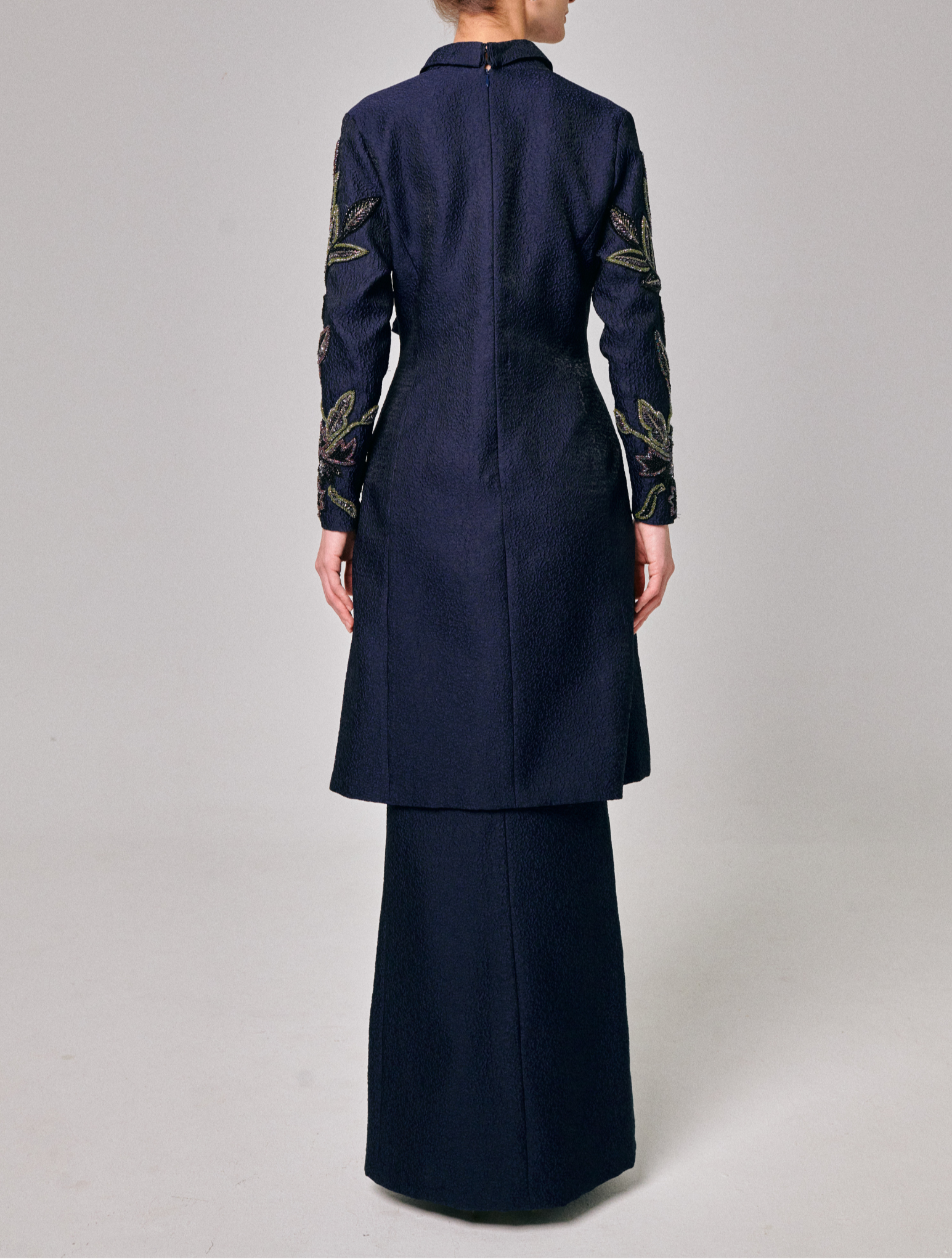 Rozie in Midnight Blue is crafted from a soft blend jacquard, giving it a smooth and structured finish. The top features delicate hand-tamboured beadwork that adds subtle texture and elegance. The matching front fold skirt is made from the same jacquard fabric, fully lined, and finished in a rich Midnight Blue shade.