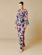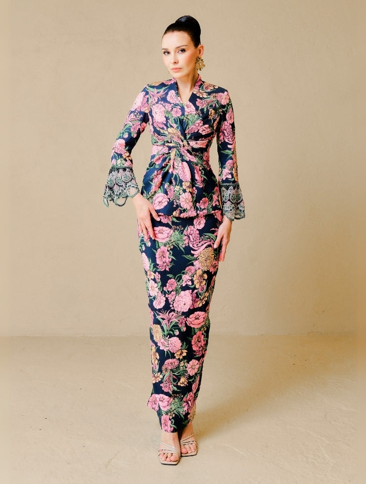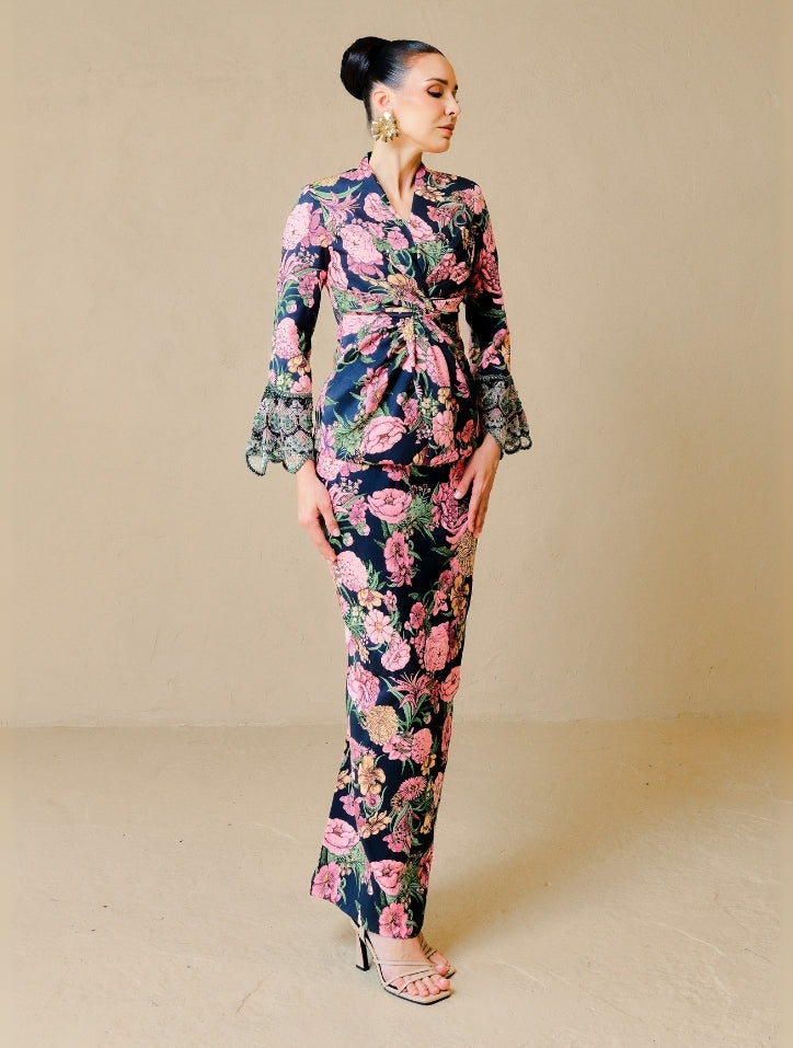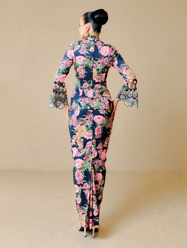 Zizie is crafted from luxurious fabric fully adorned with intricate tambour beadwork on the sleeves. The material features elegant draping and a smooth silk satin lining, offering both comfort and a refined, opulent finish. Completed with a pencil-cut skirt, this design embodies timeless elegance with exquisite detailing.
