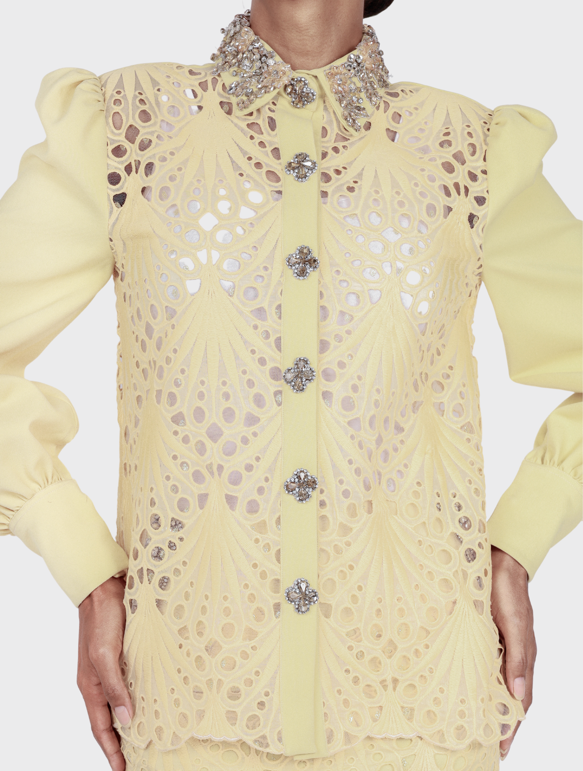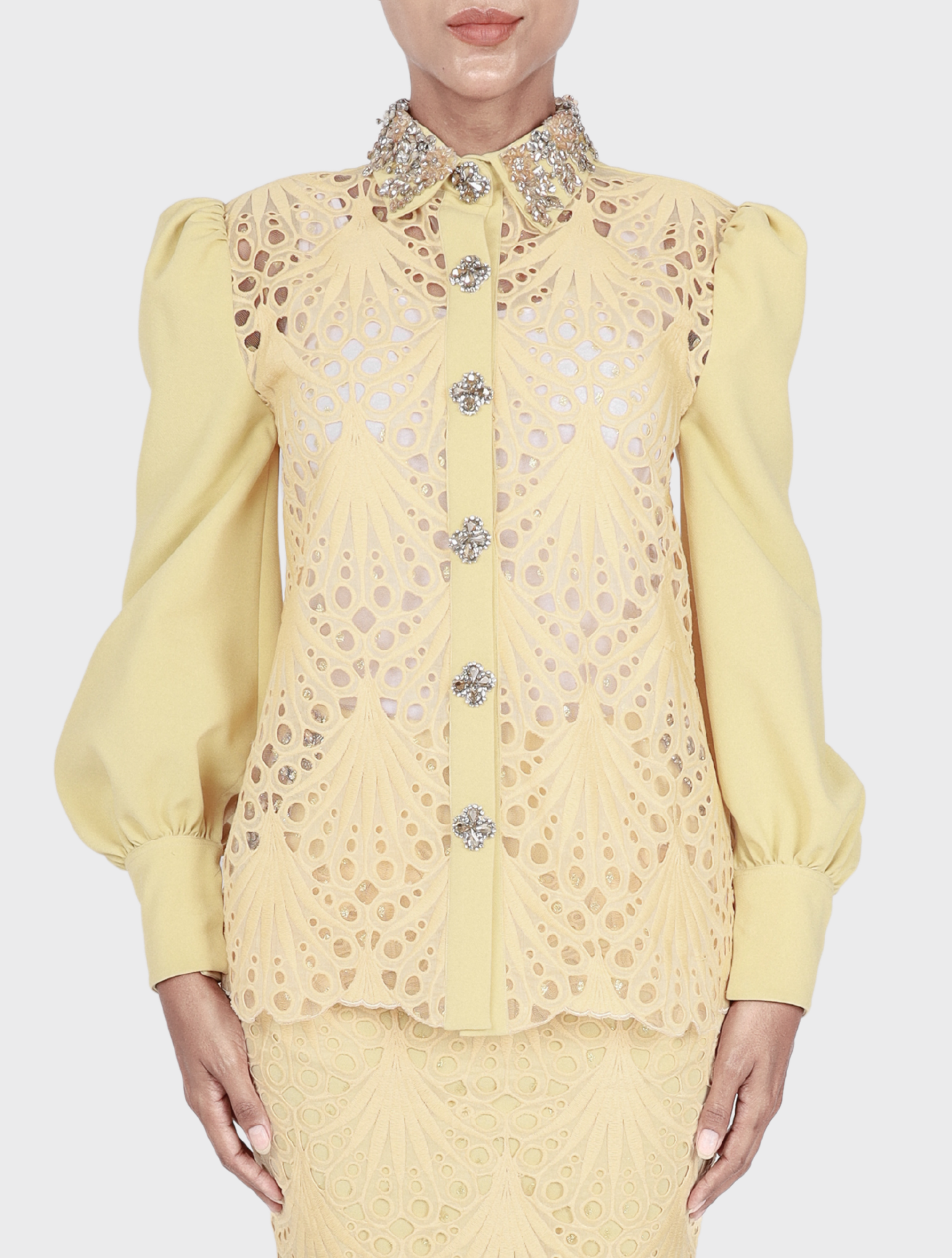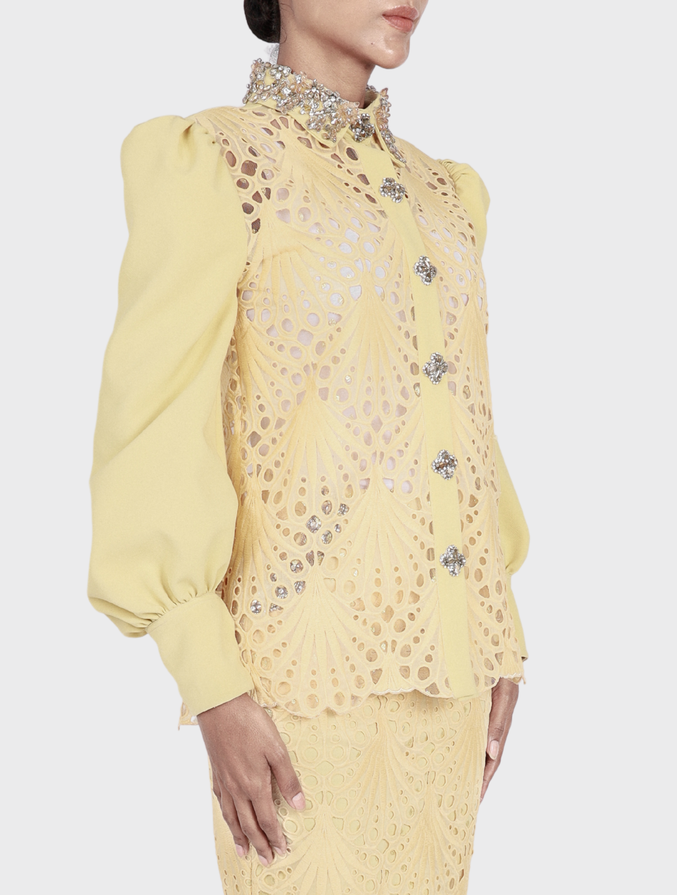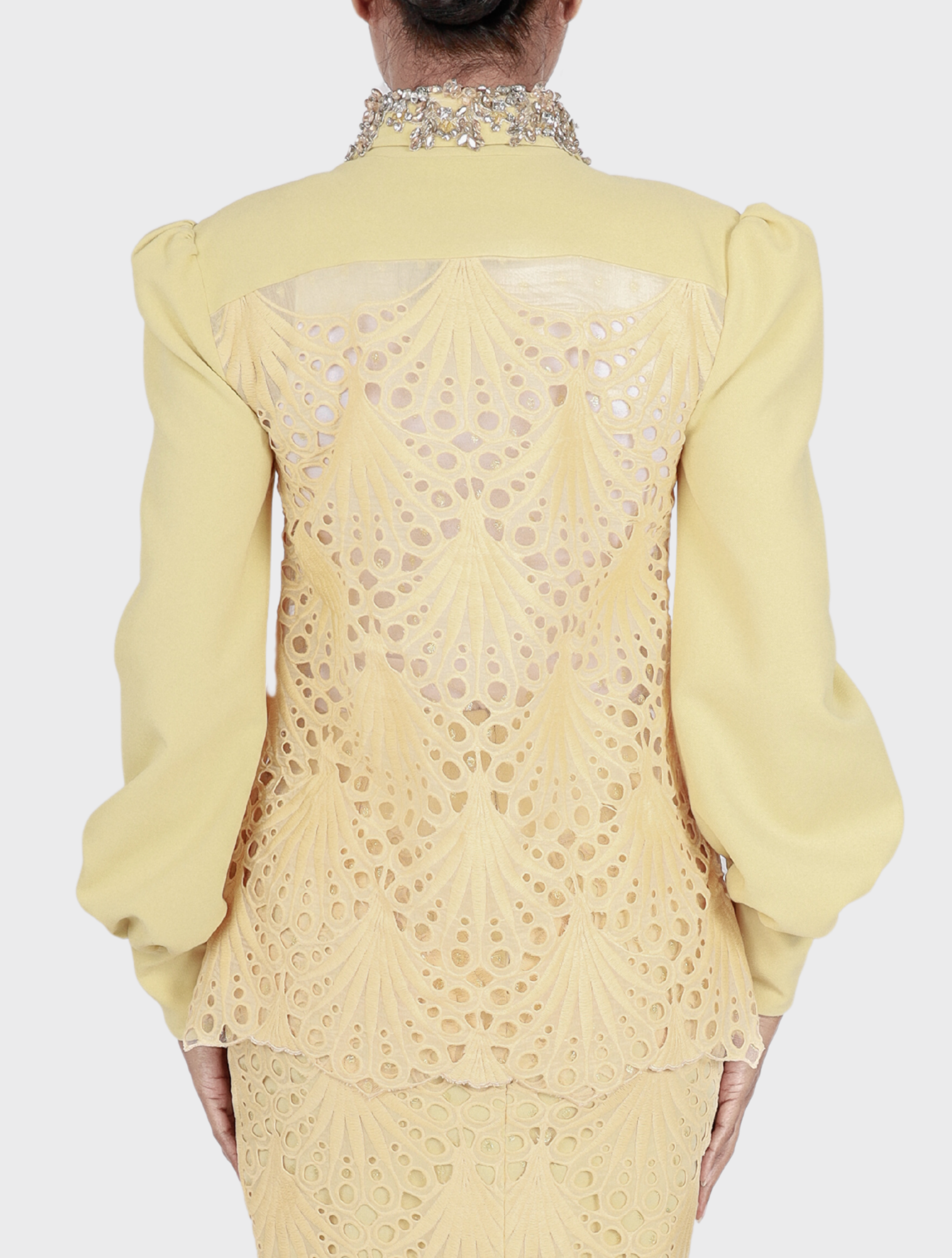 Biarritz in Pastel Yellow showcases exquisite craftsmanship with its embellished collared neckline and shimmering puff mesh glitter net sleeves with structured cuffs. Made from high-quality, non-stretchable fabric, it’s designed for a flattering comfort fit. Finished with a hidden back zip, hook fastening, mesh glitter net lining, and a refined back opening, this piece embodies effortless elegance.